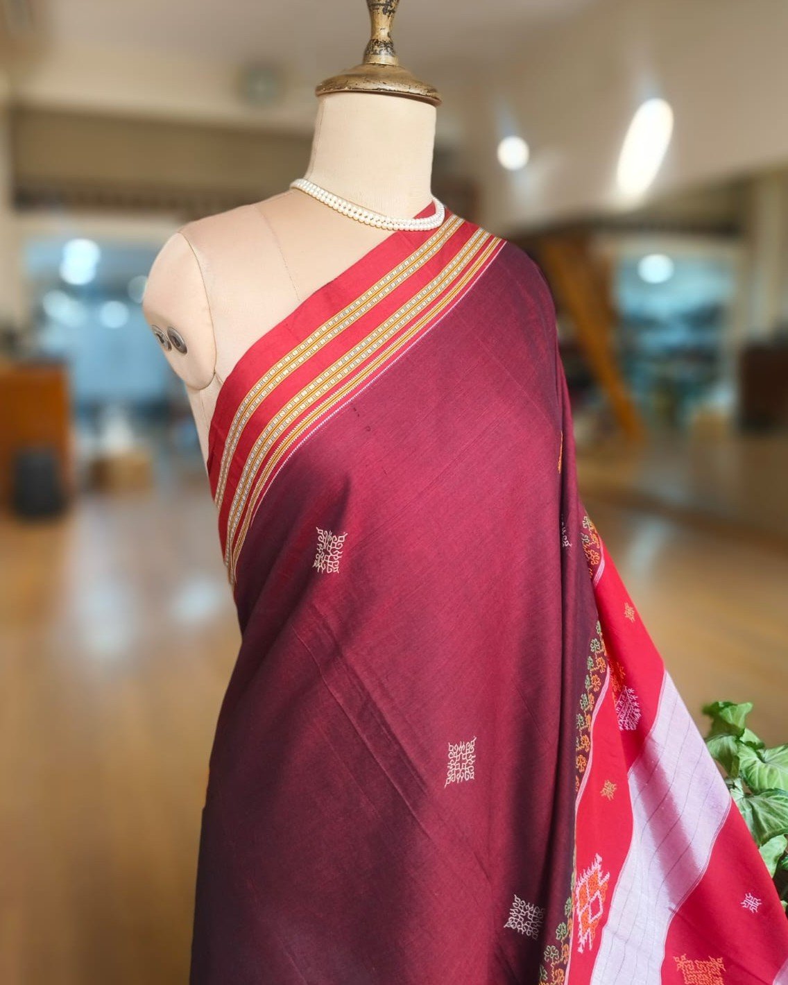 The base fabric is cotton woven in Betagiri in Karnataka. The grey palla stripes are rayon (artsilk).