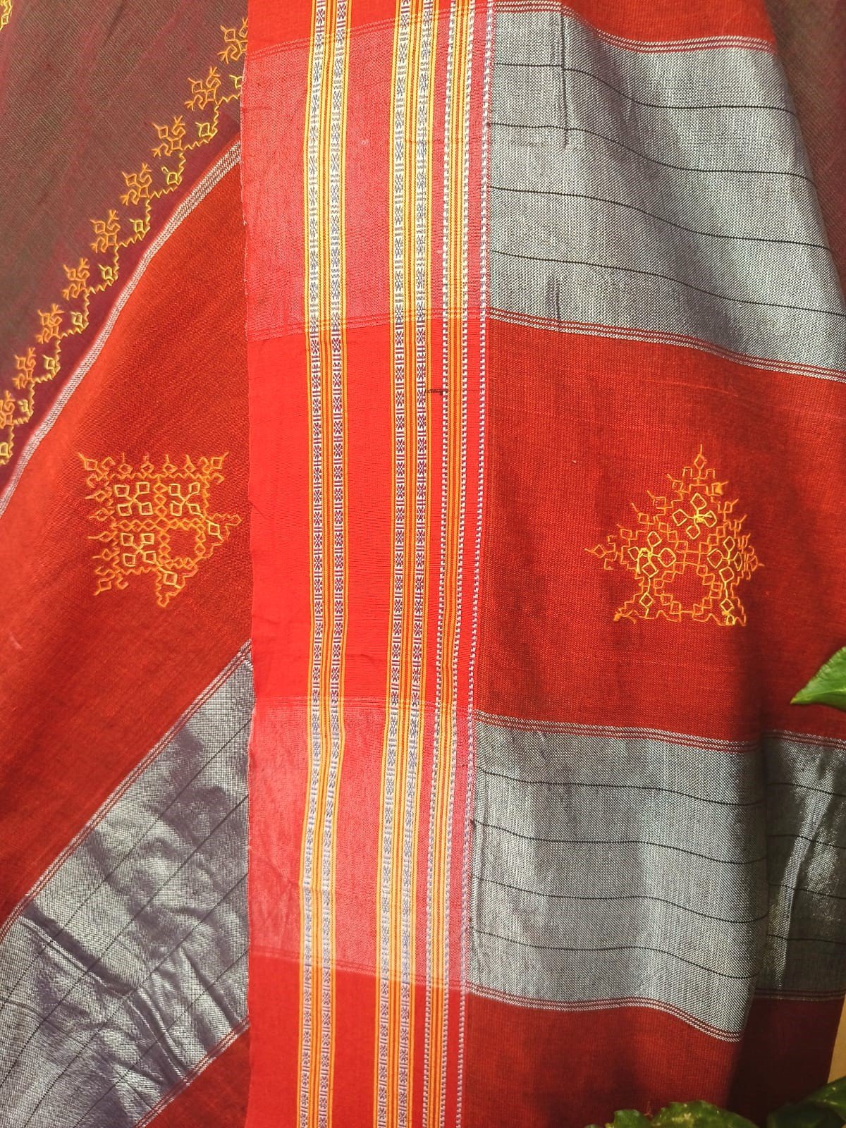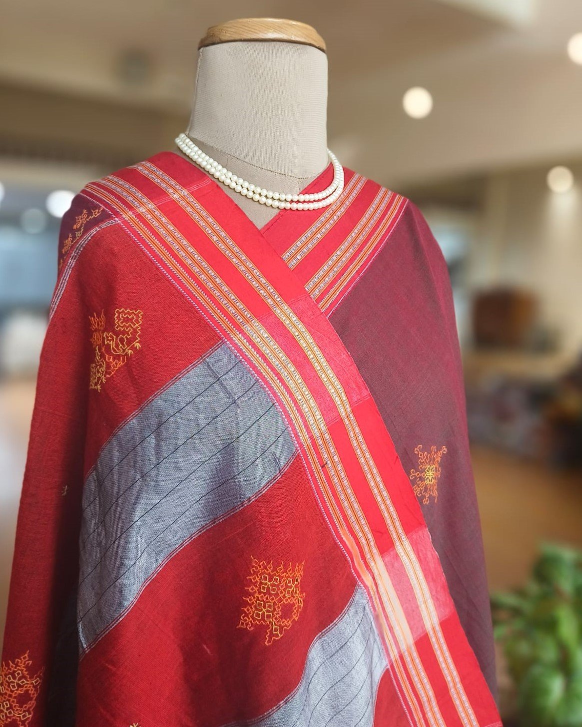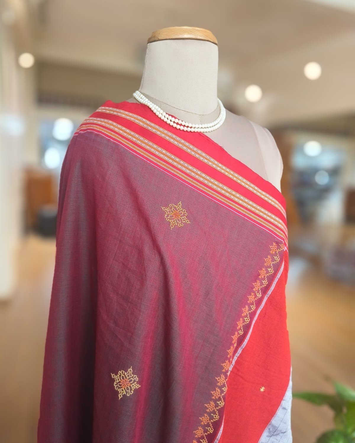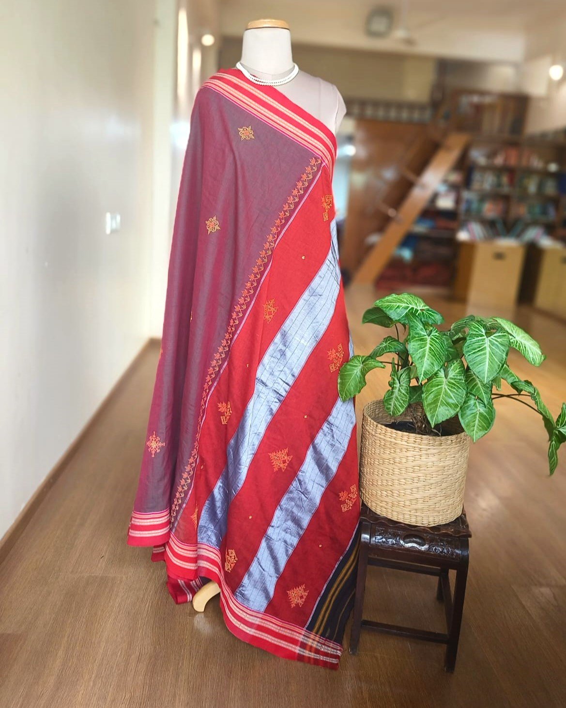 The base fabric is cotton woven in Bettagiri in Karnataka. The grey palla stripes are rayon (artsilk).