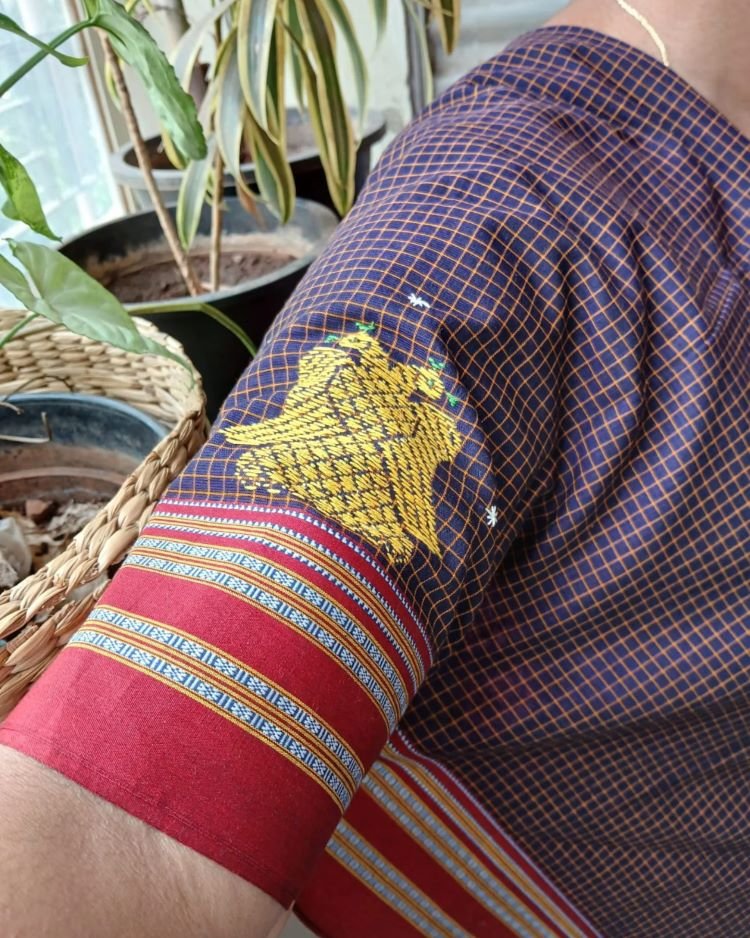 Beautiful blouse piece in Betagiri cotton with intricate Kasuti hand-embroidery done by women in Dharwad.