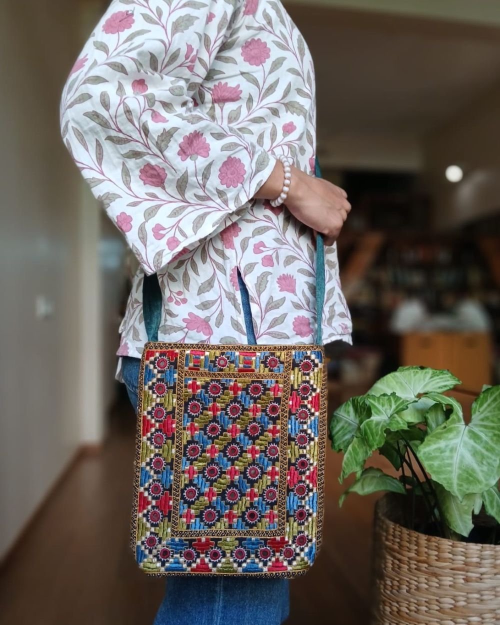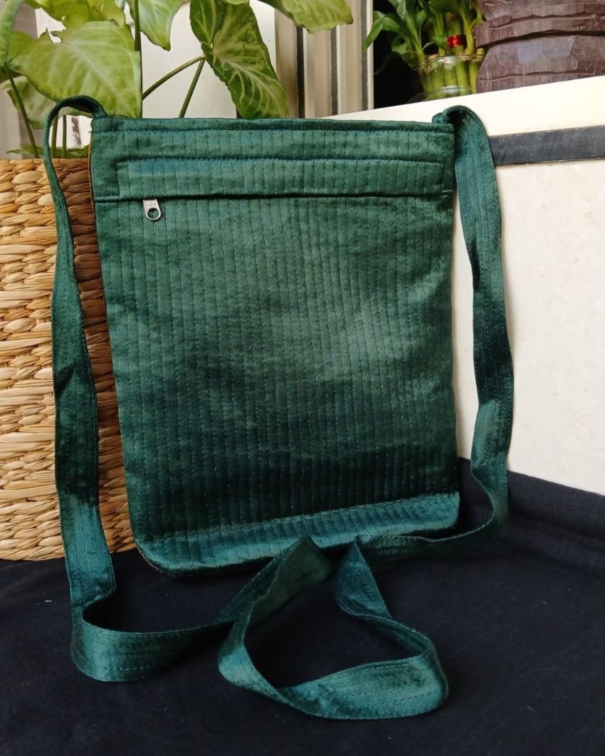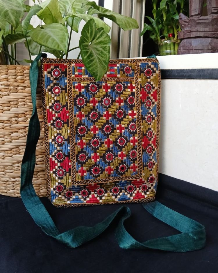 Katri Mashru Sling Bag Sling Bag with Katri embroidery and zip closure on top.