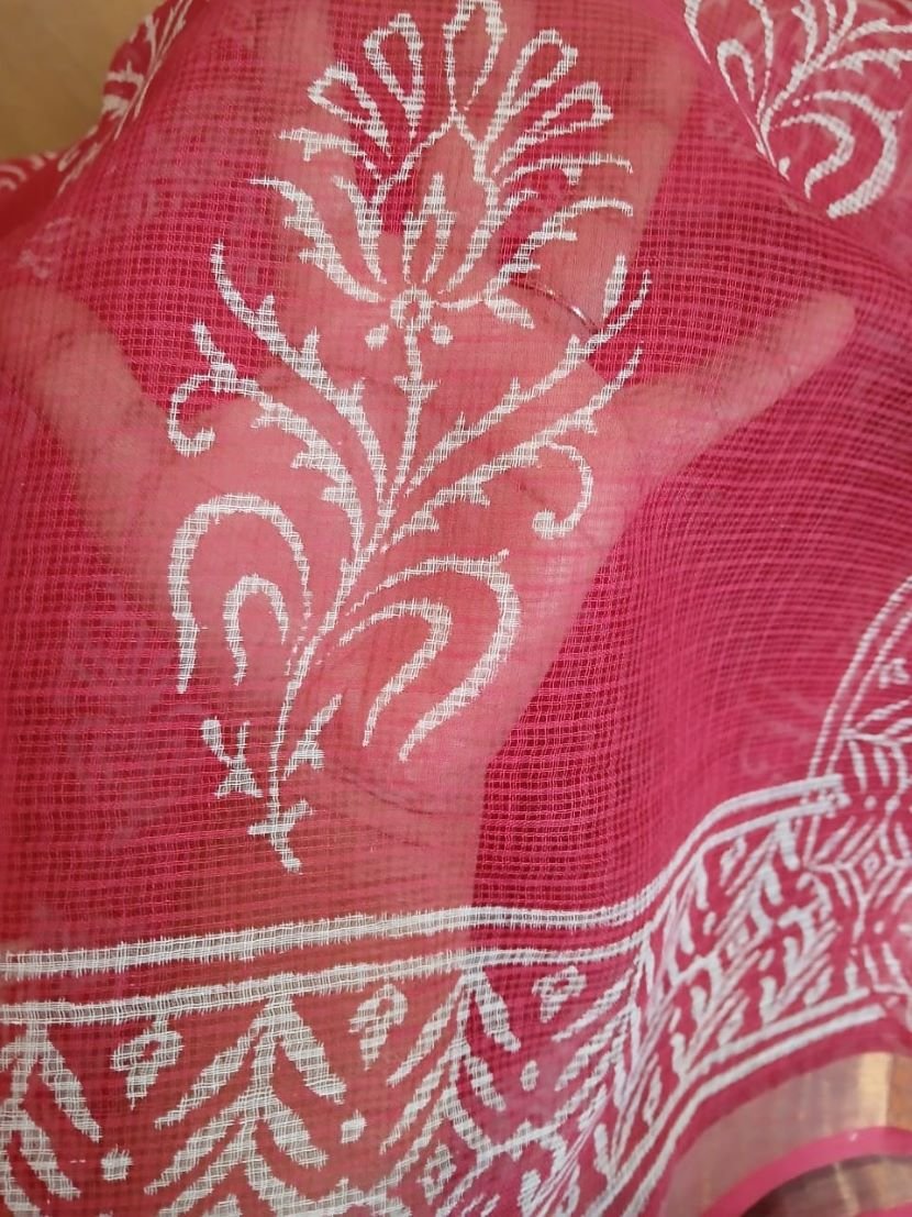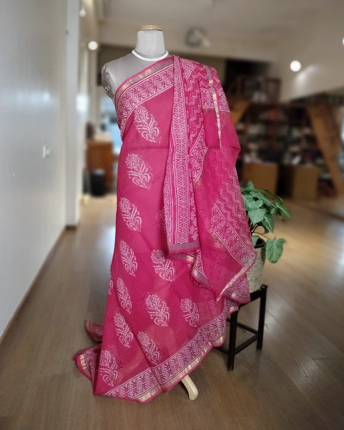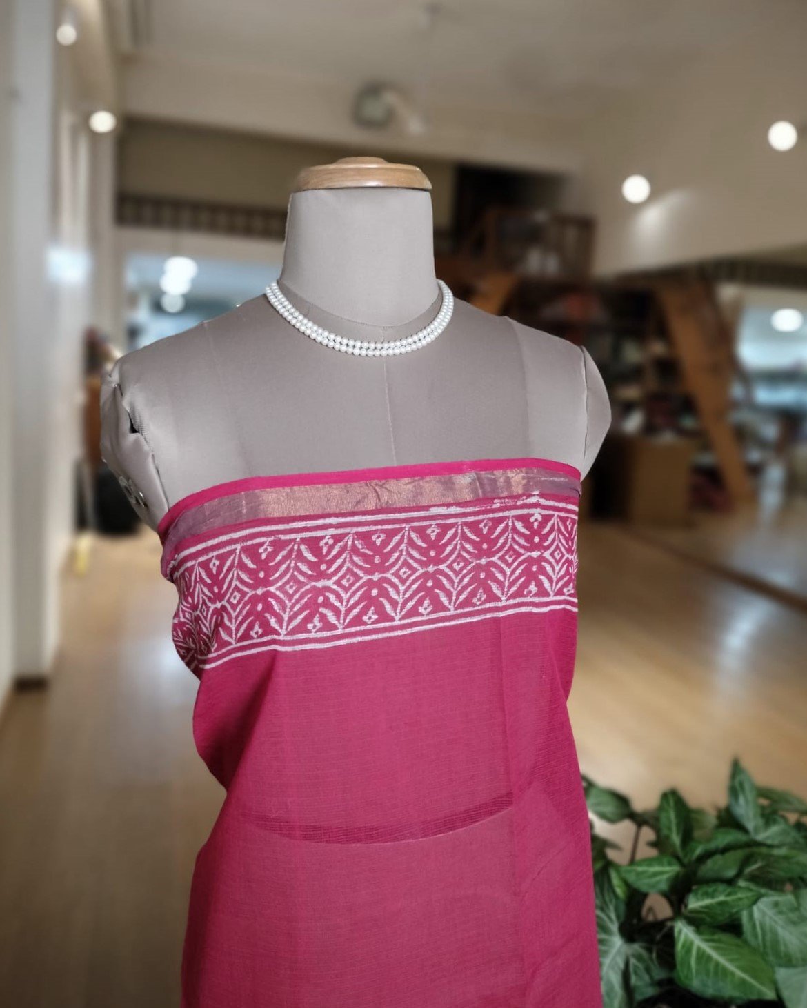 Care Instruction: Dry Clean or Hand wash in mild detergent and dry in shade. You can starch the saree if you like to wear it crisp. The blouse will need lining.