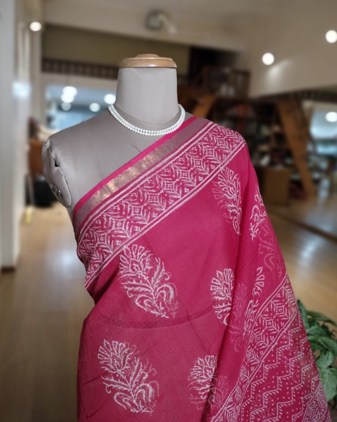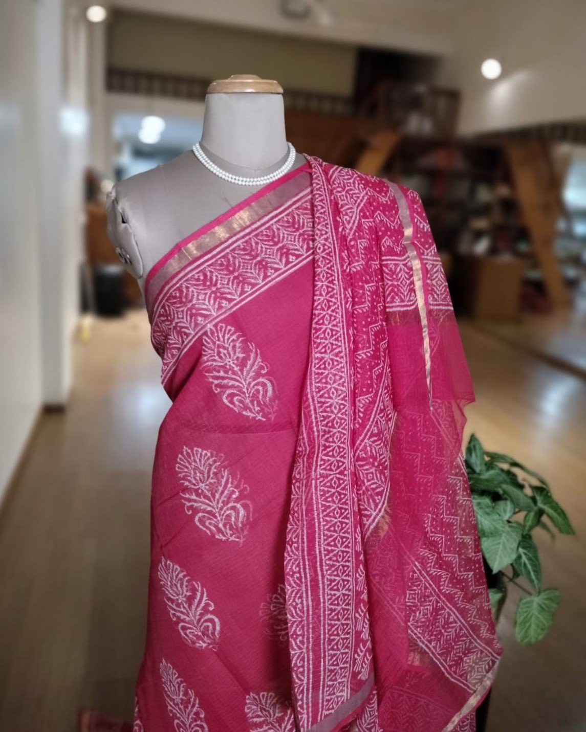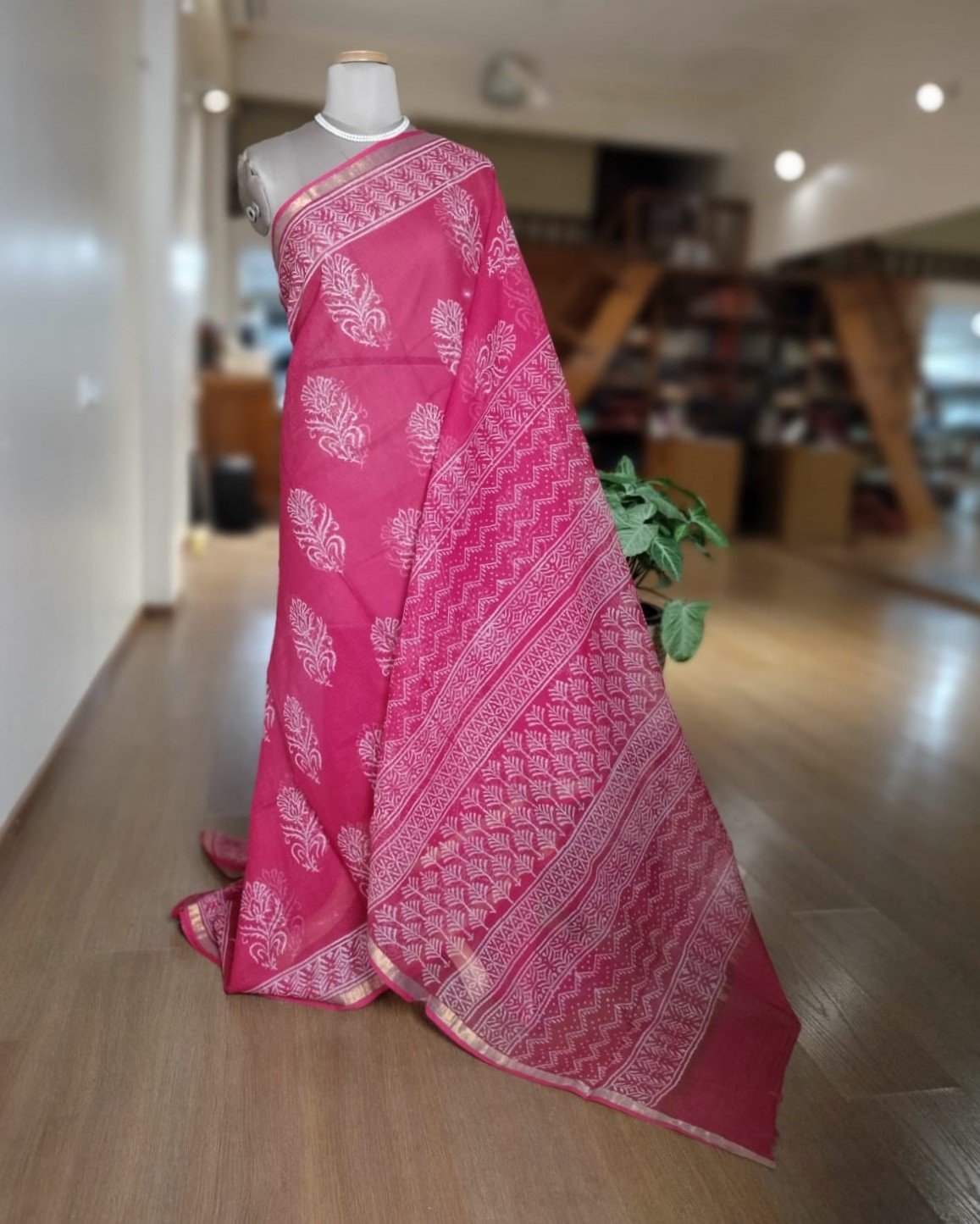 Care Instruction: Dry Clean or Hand wash in mild detergent and dry in shade. You can starch the saree if you like to wear it crisp. The blouse will need lining.