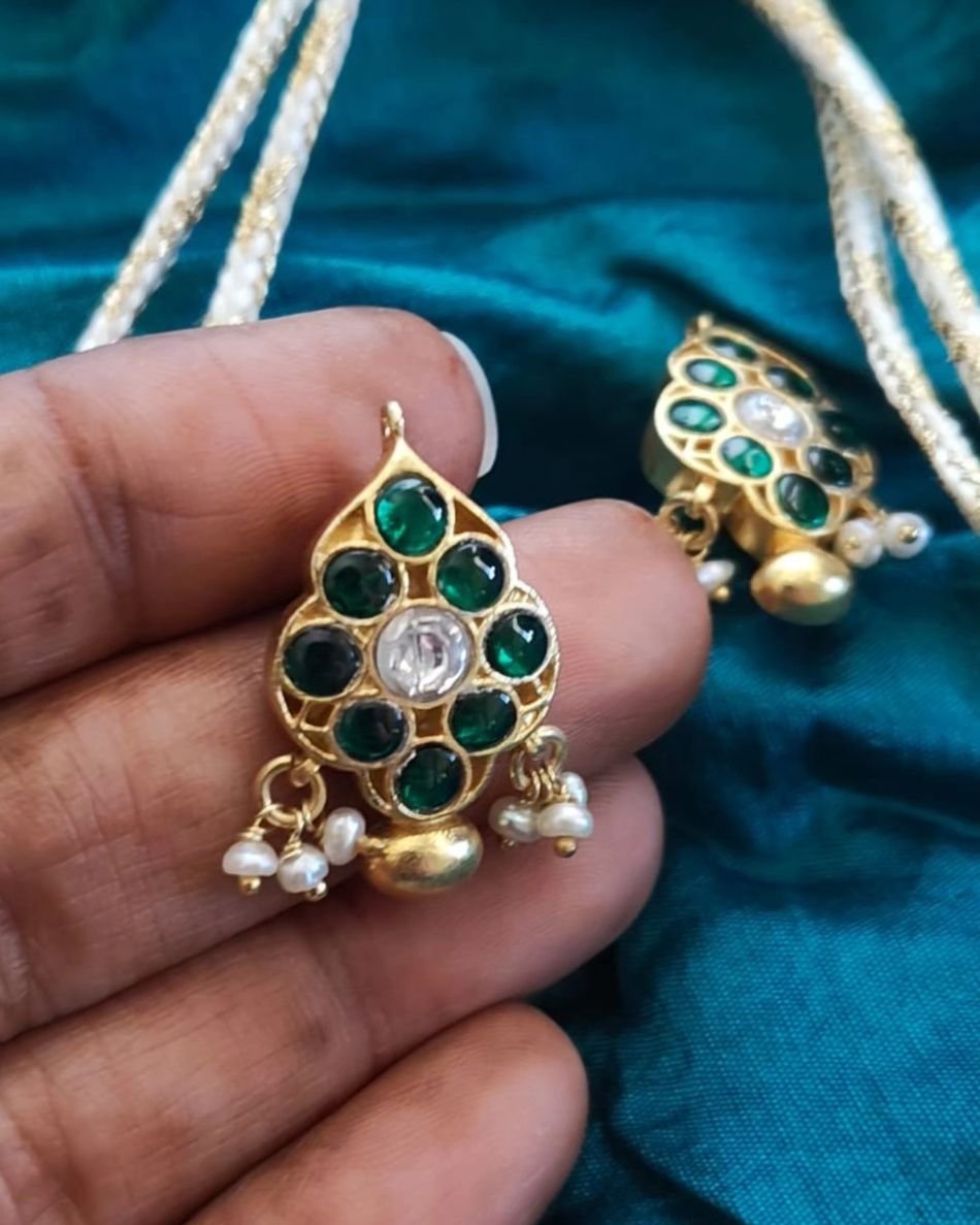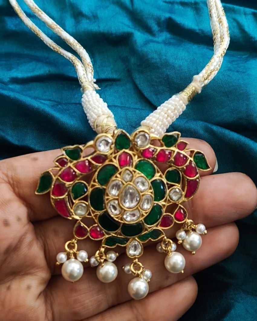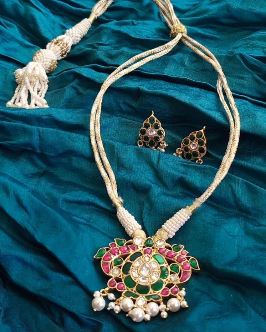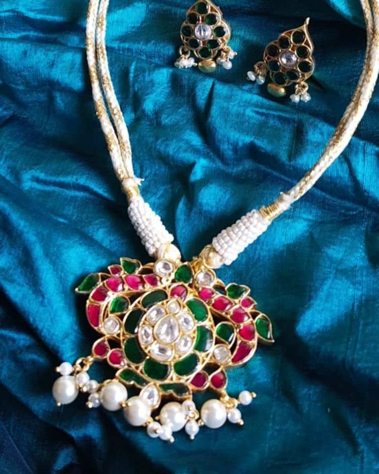 Kundan Jewellery Set in 92.5 Silver with gold plating, coloured glass insets and pearl drops (shell pearls and water pearls).