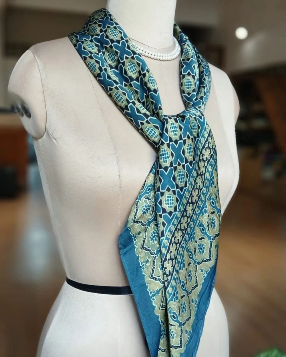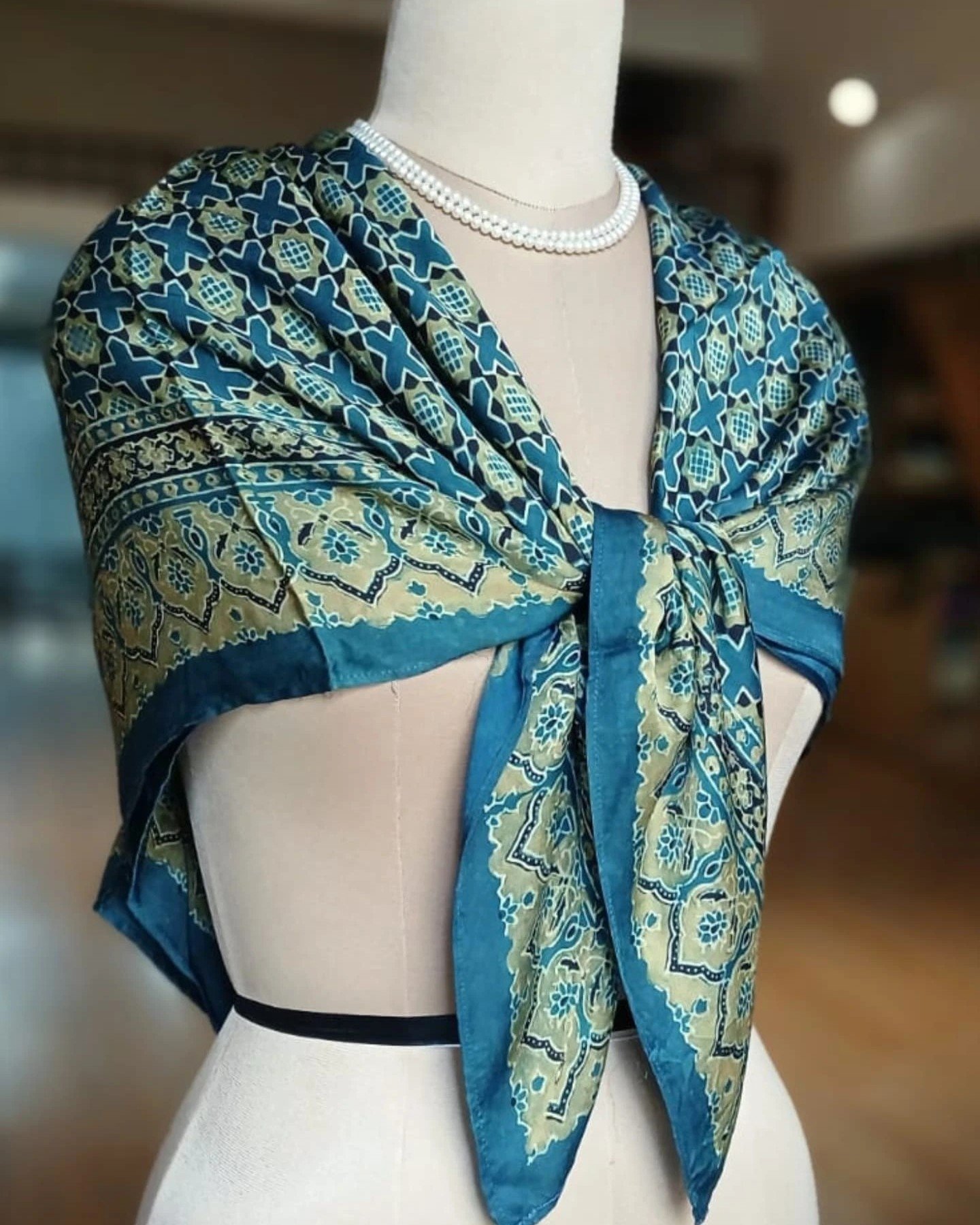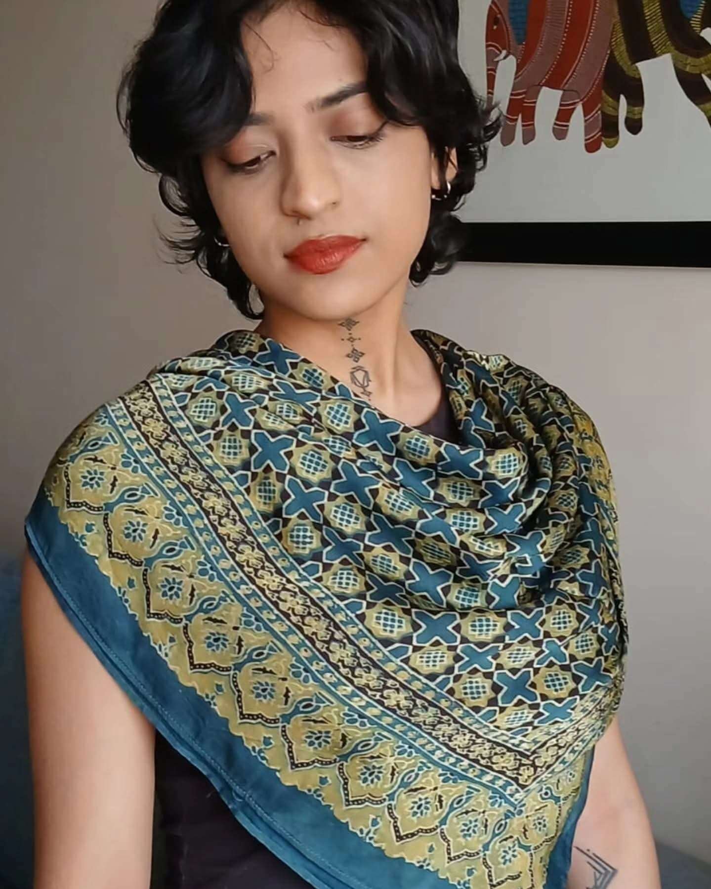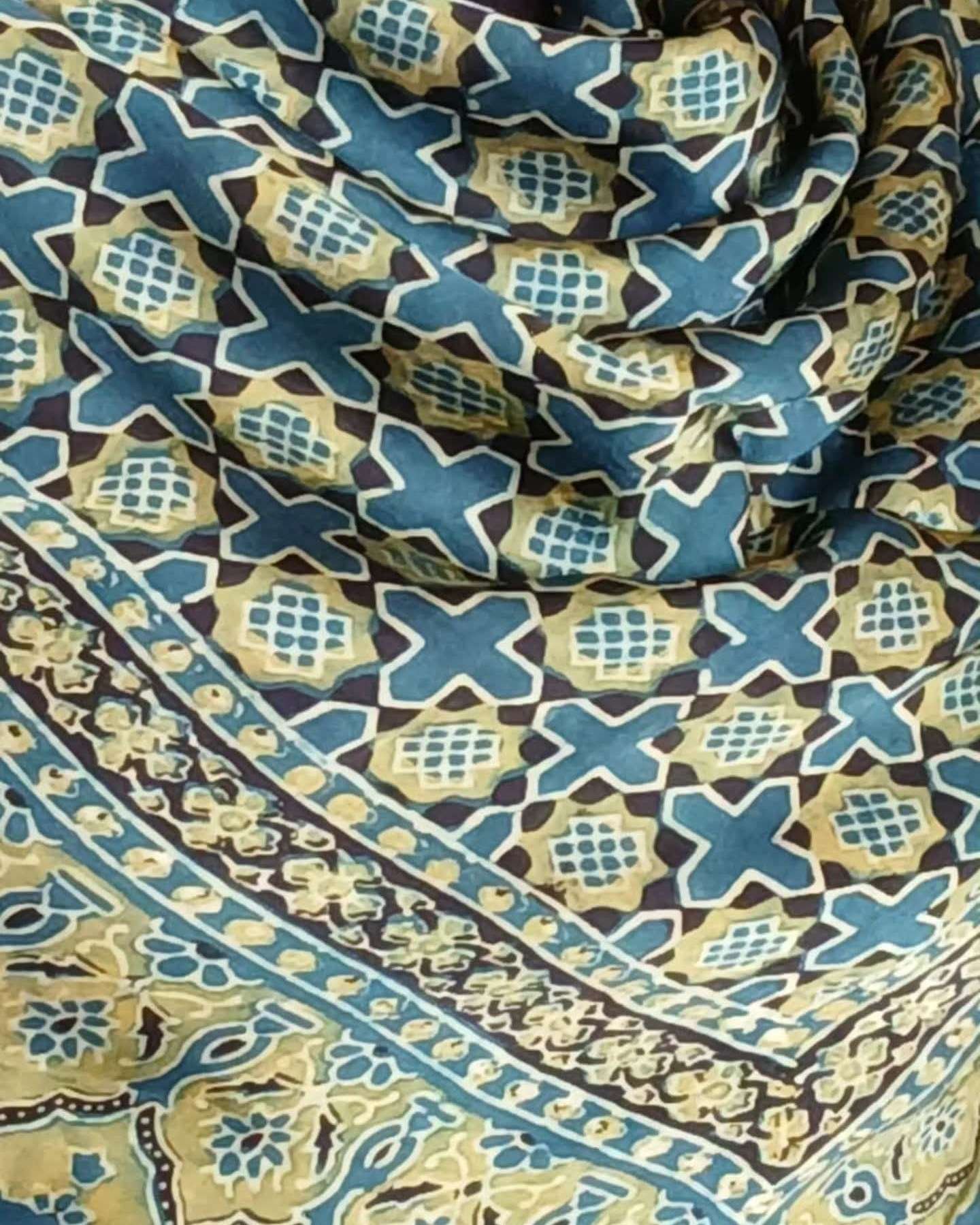 The material is modal silk and the scarf has been hand printed in Ajrakhpur.
