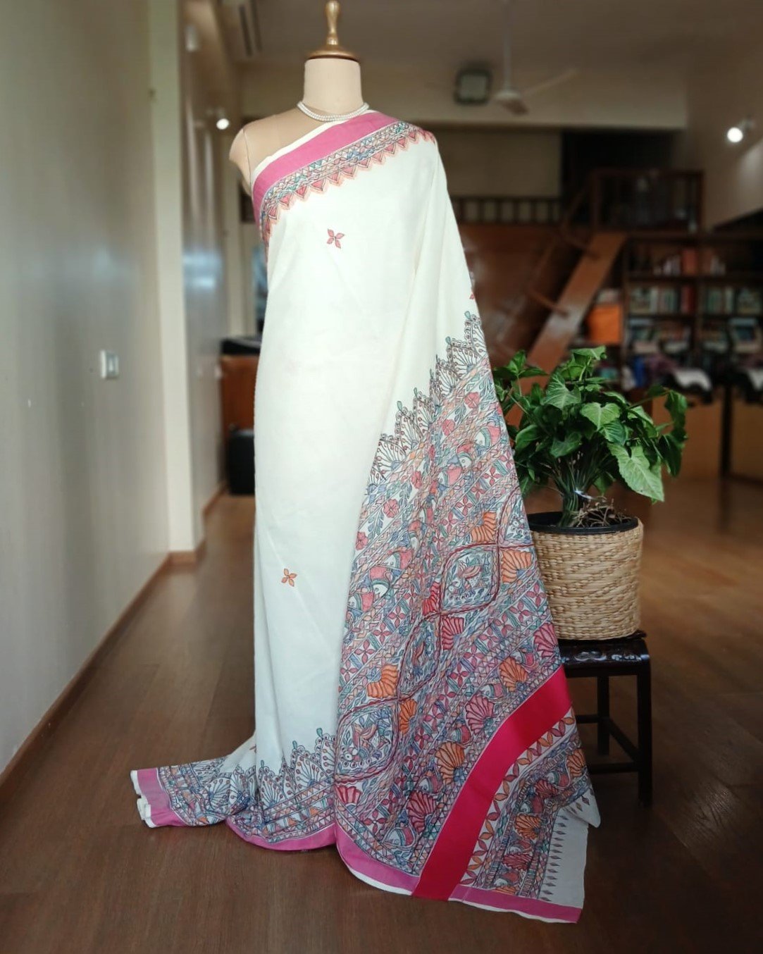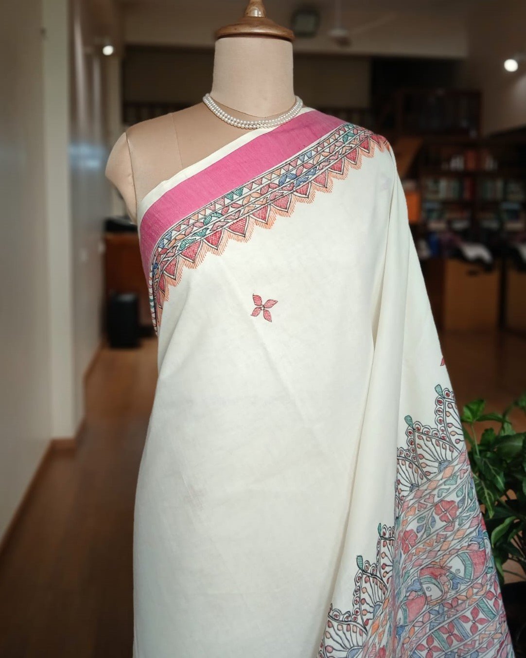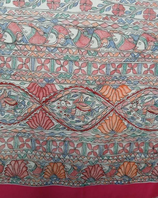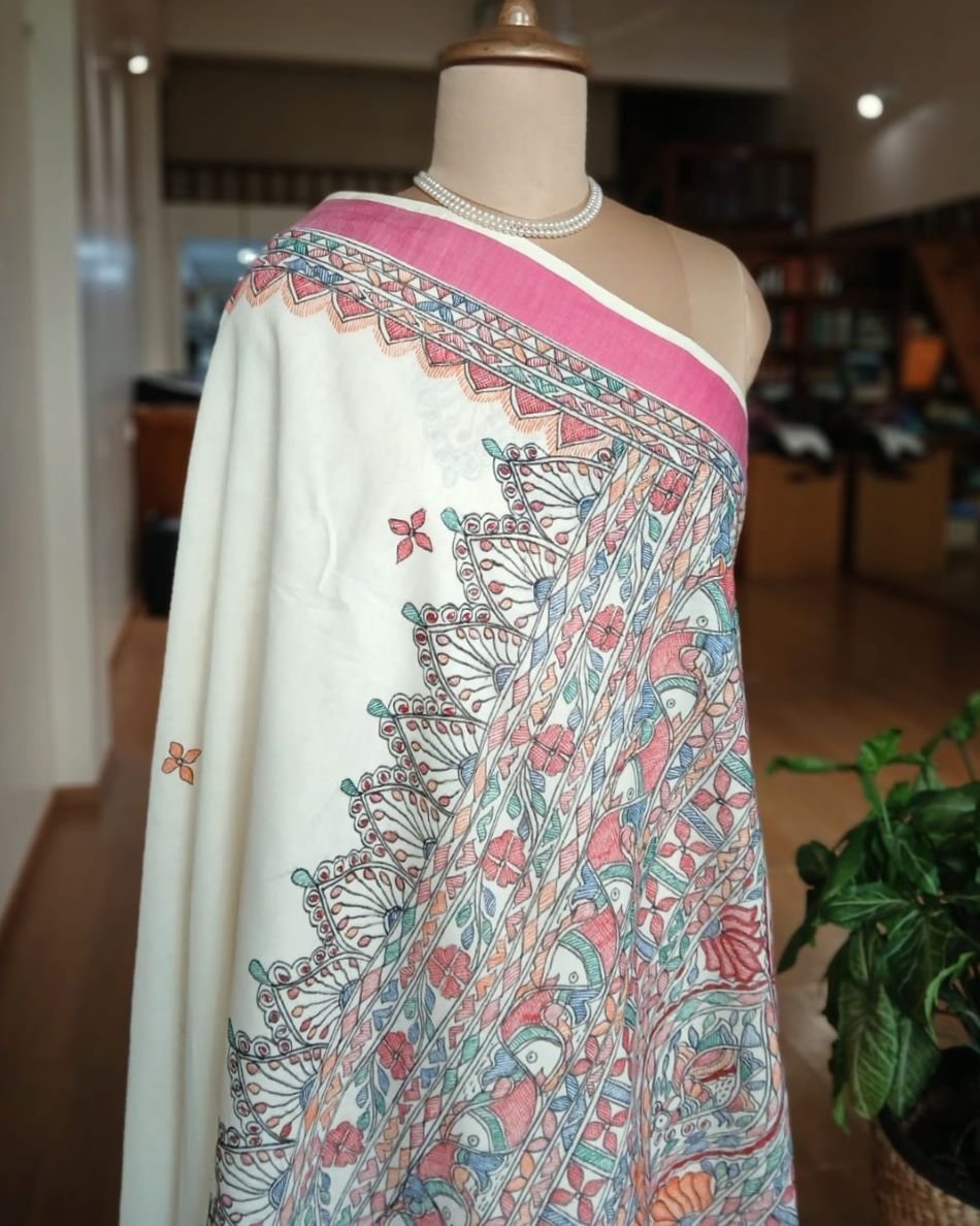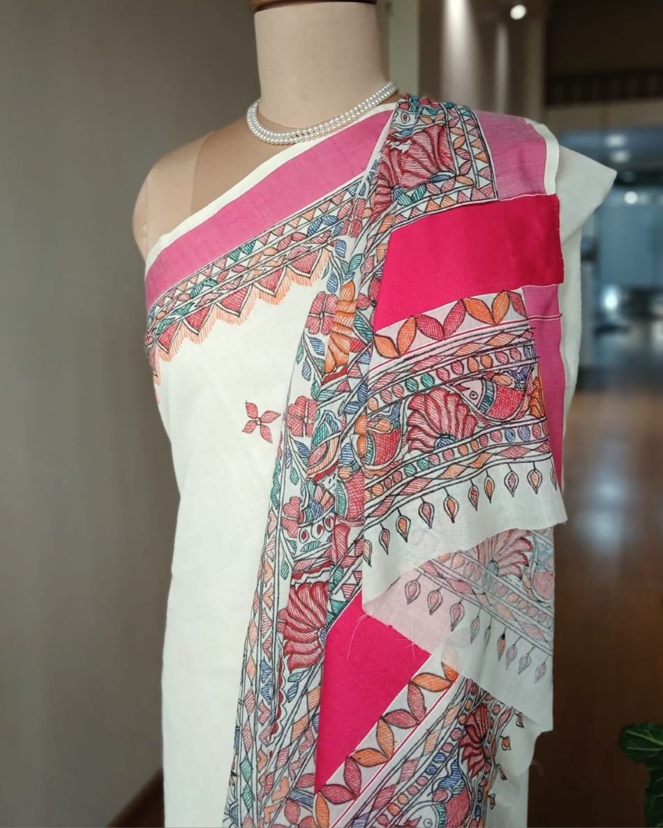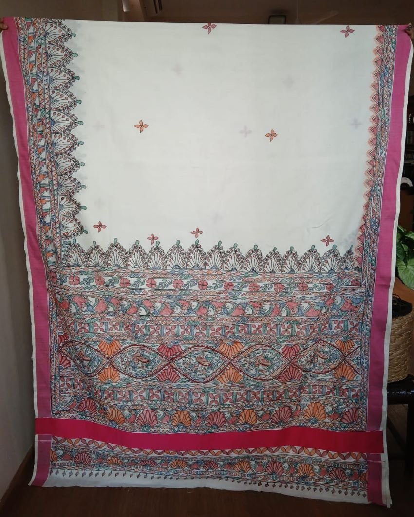 Cotton Saree with Madhubani handpainted designs. The pallu and borders have handpainted motifs. There is no blousepiece
