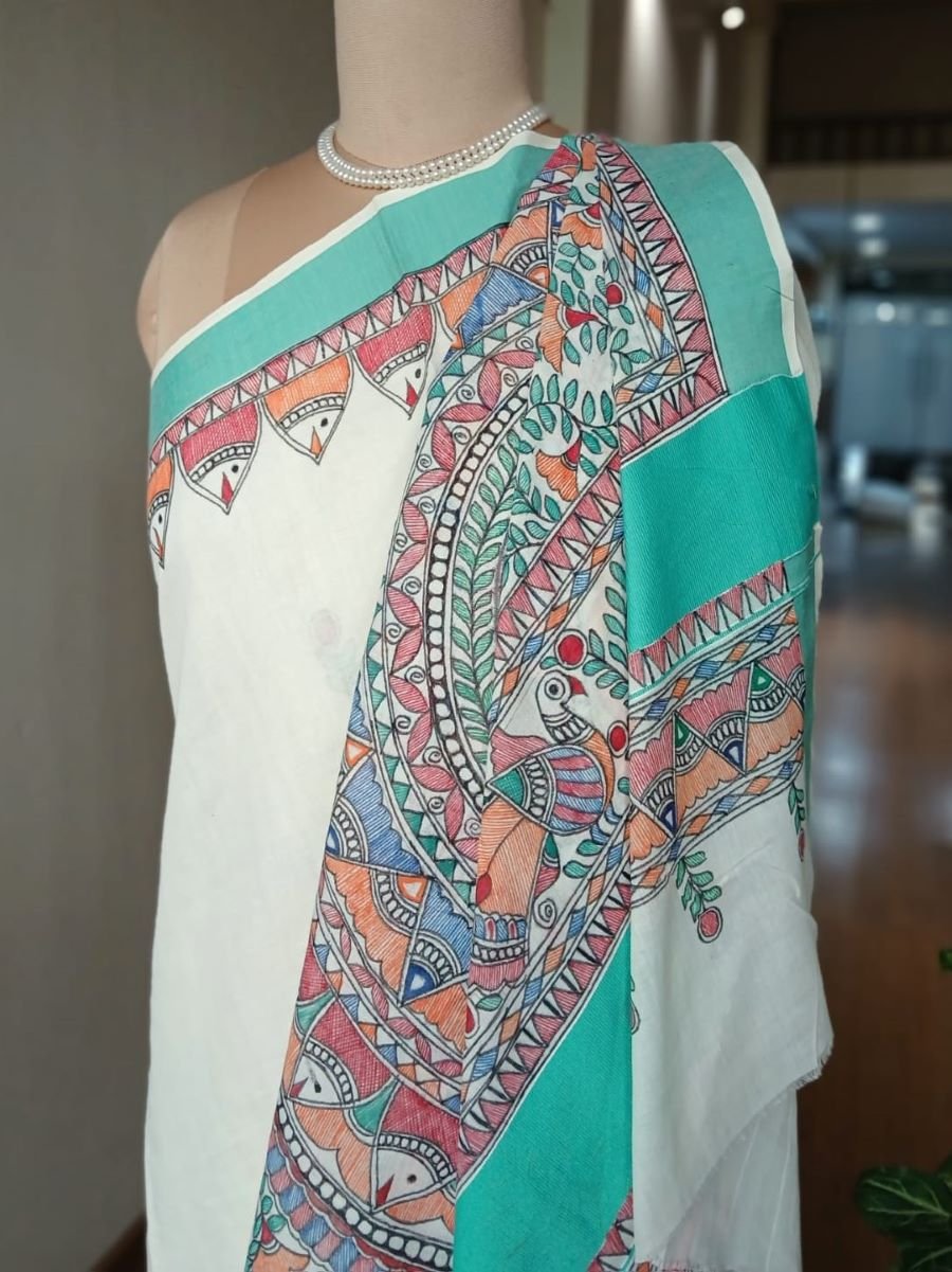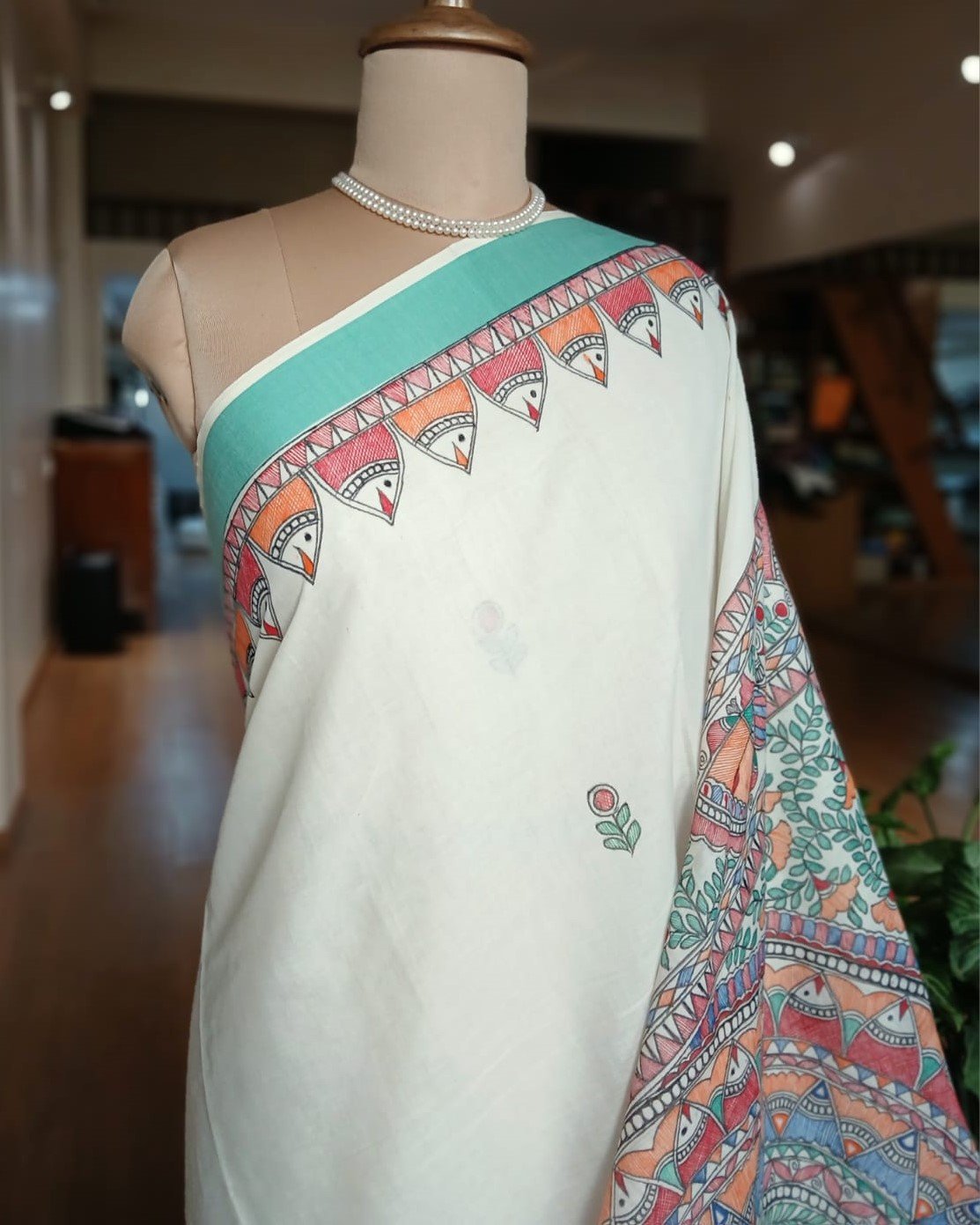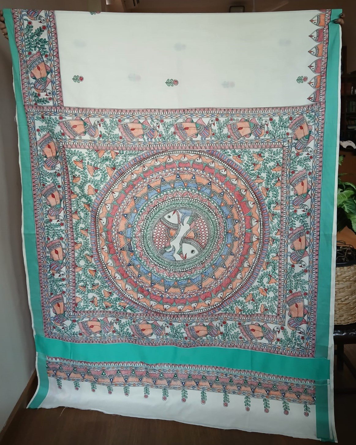 Cotton Saree with Madhubani handpainted designs. More details below.