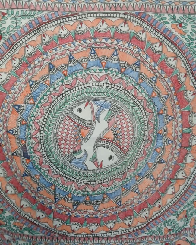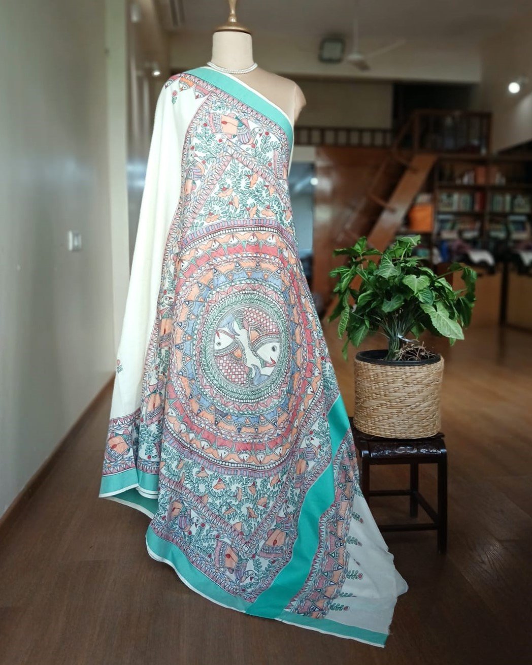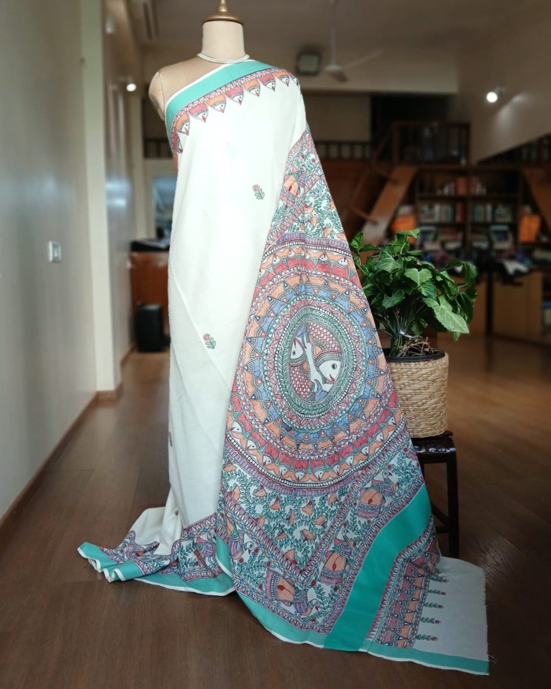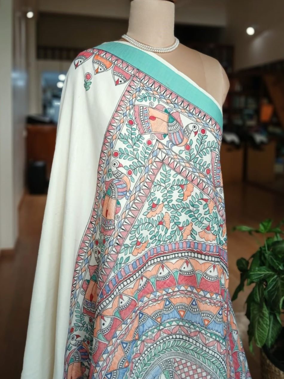 Cotton Saree with Madhubani handpainted designs. More details below.