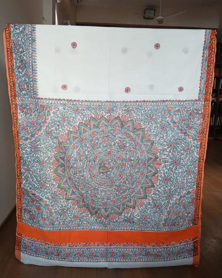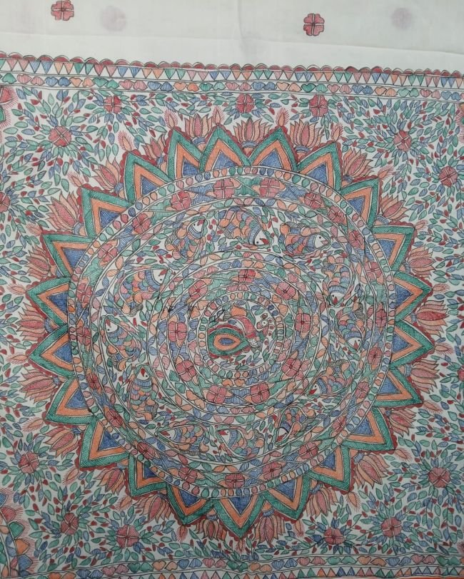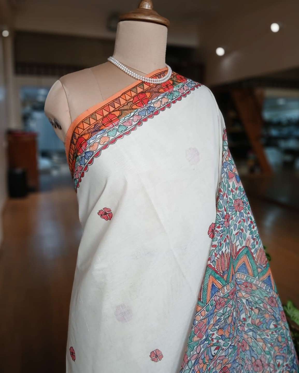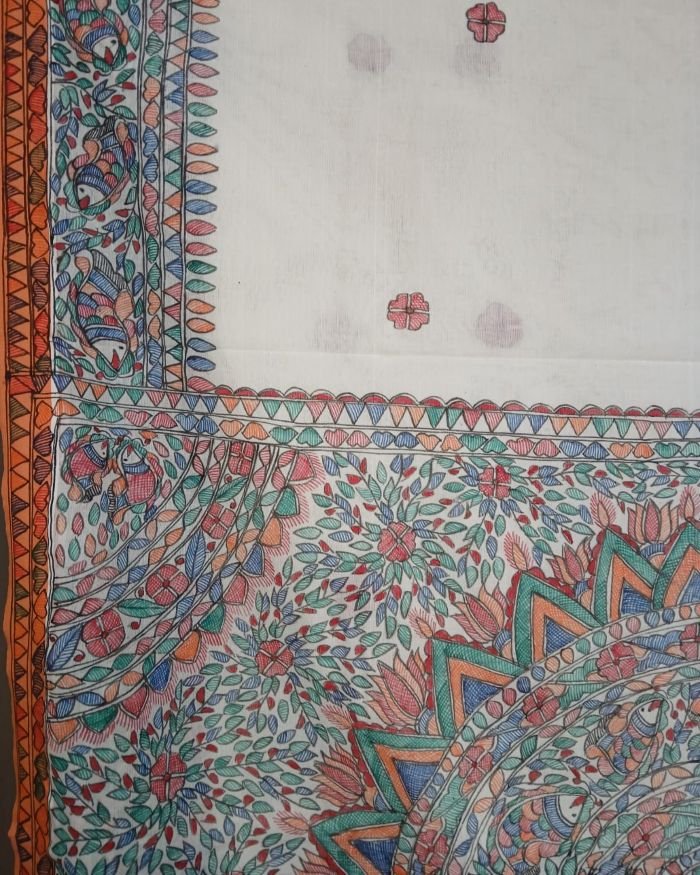 Cotton Saree with Madhubani handpainted designs. The pallu and borders have handpainted motifs. There is no blousepiece