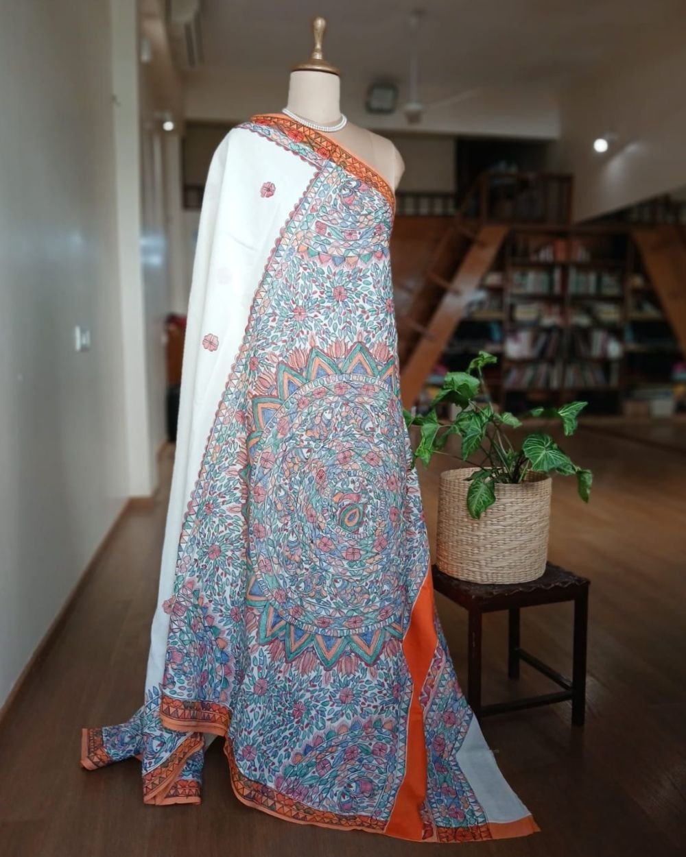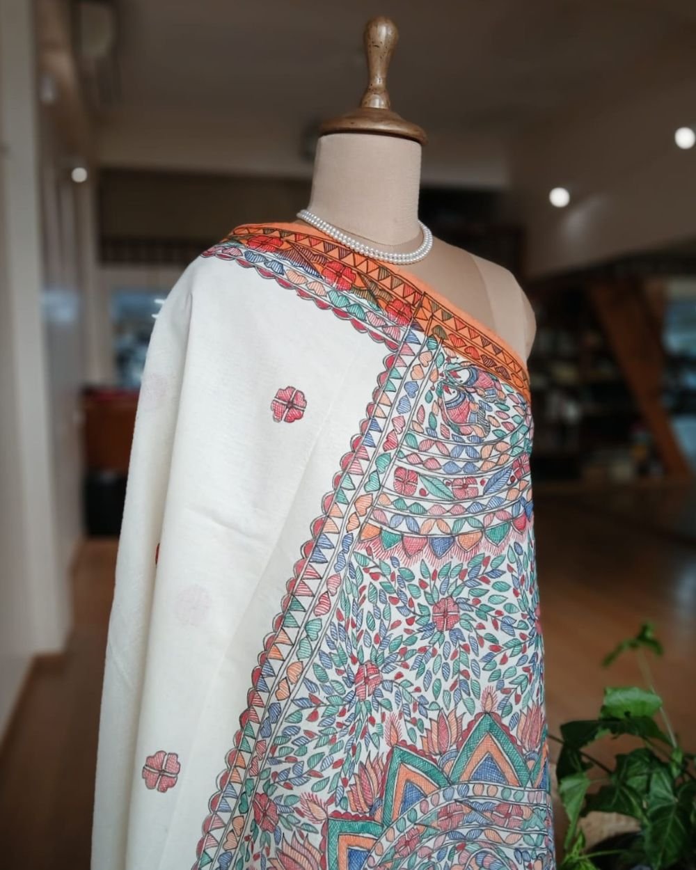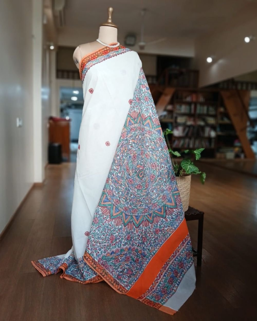 Cotton Saree with Madhubani handpainted designs. The pallu and borders have handpainted motifs. There is no blousepiece