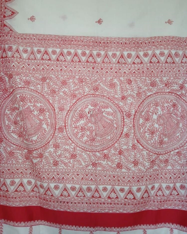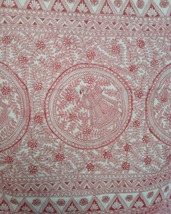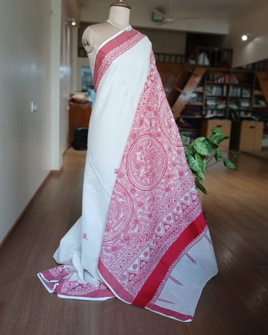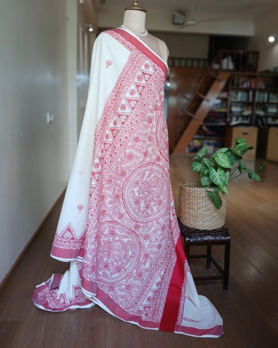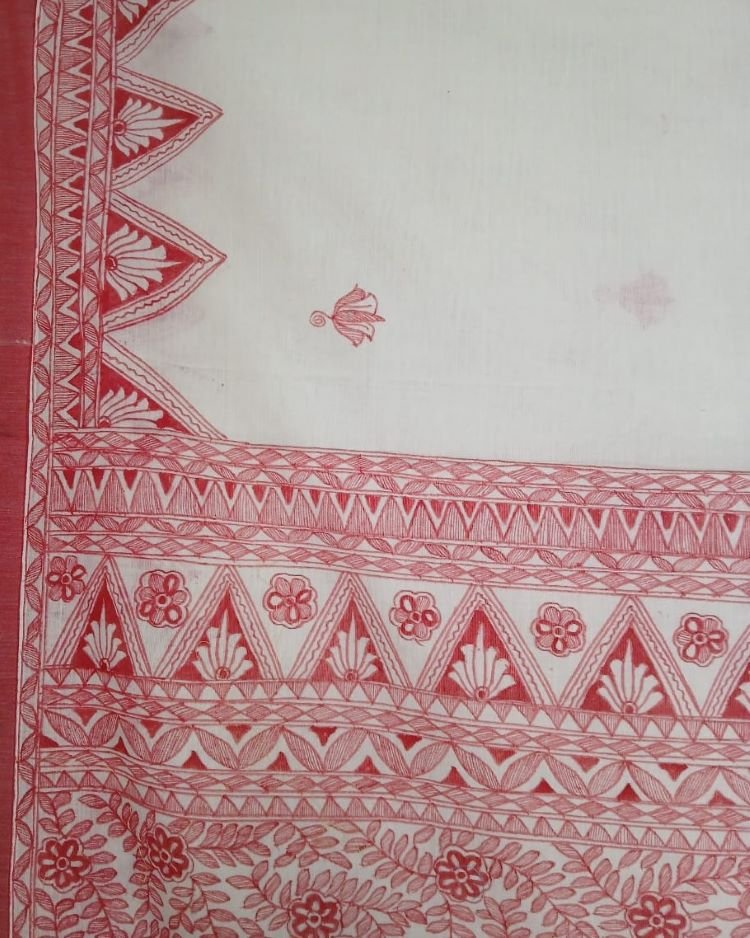 Cotton Saree with Madhubani handpainted designs. The pallu and borders have handpainted motifs.