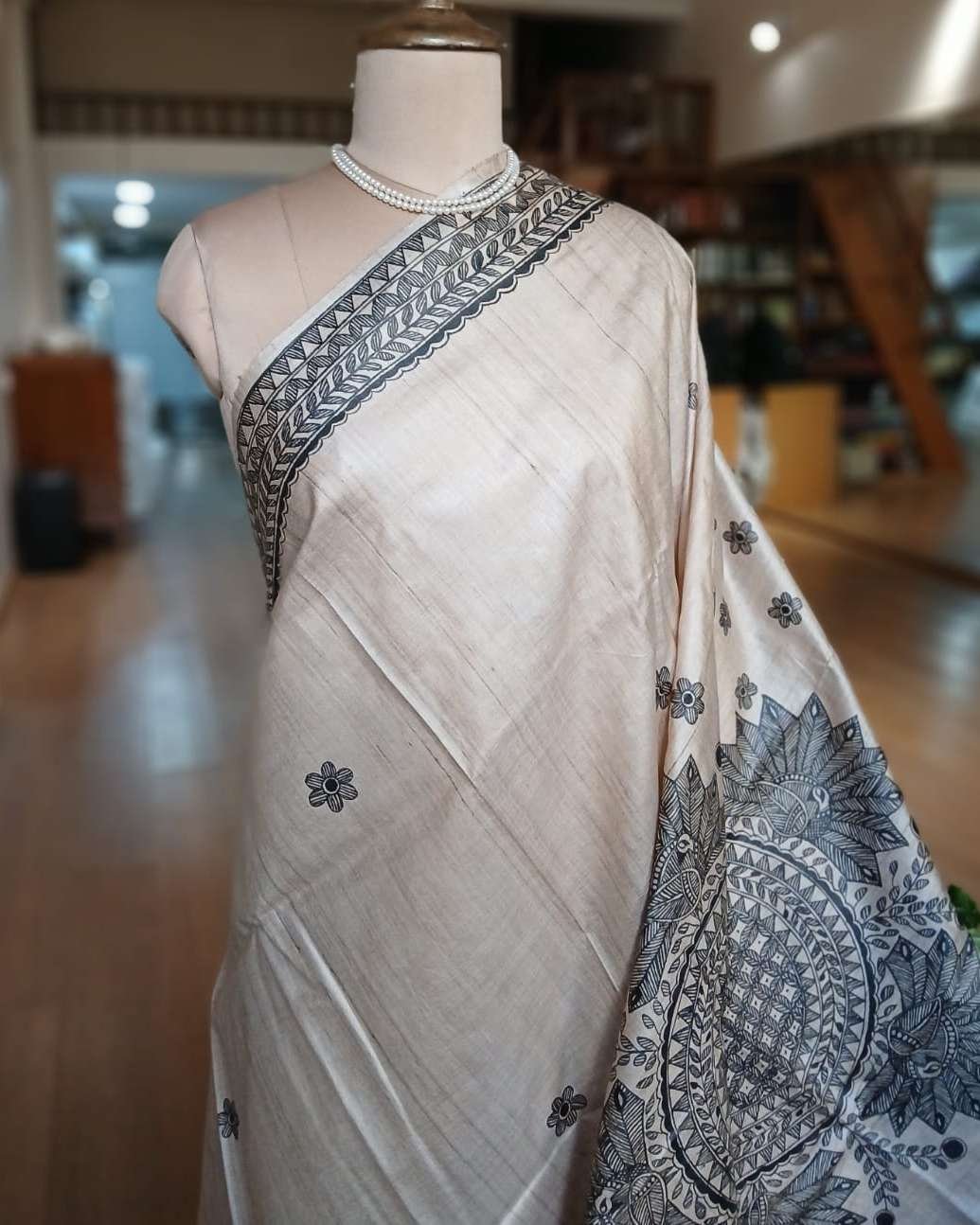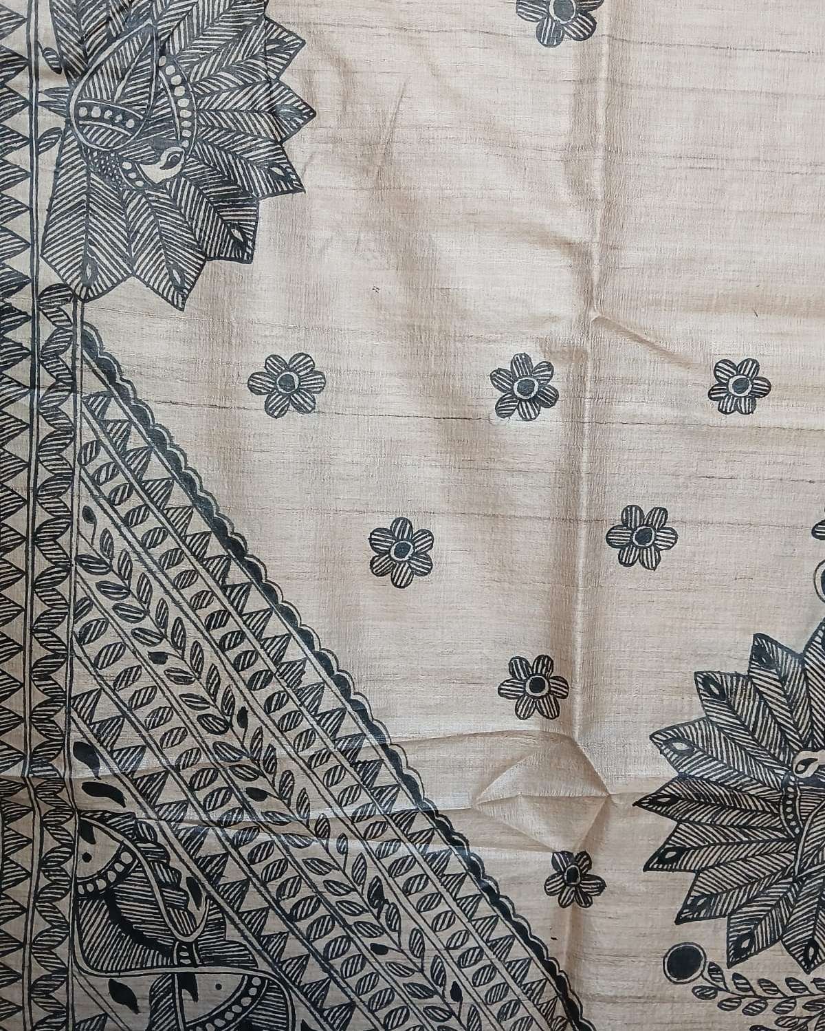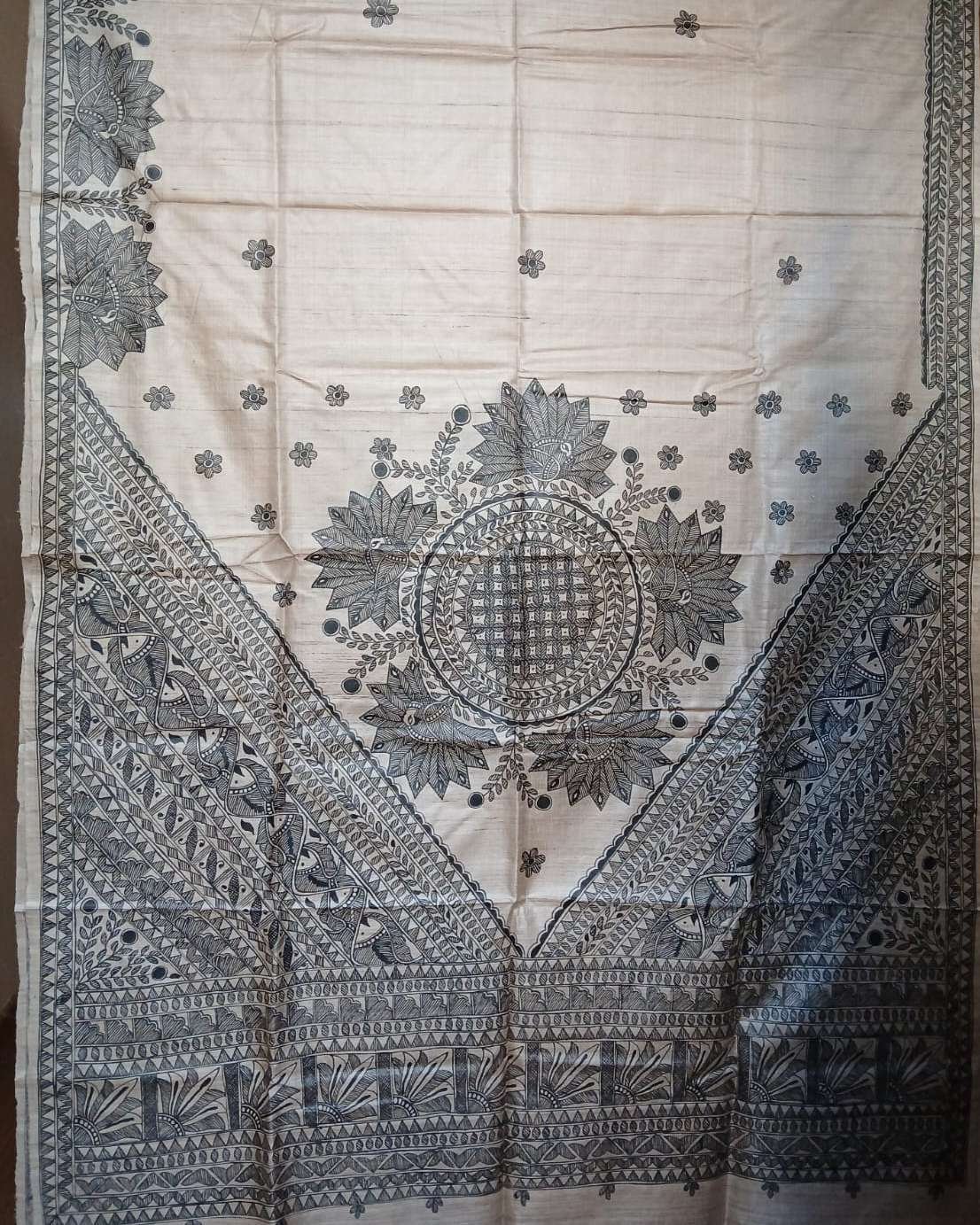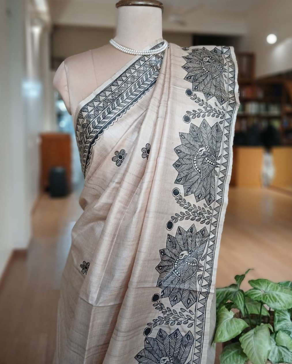 Classic Tussar Silk Saree with Madhubani handpainted designs.