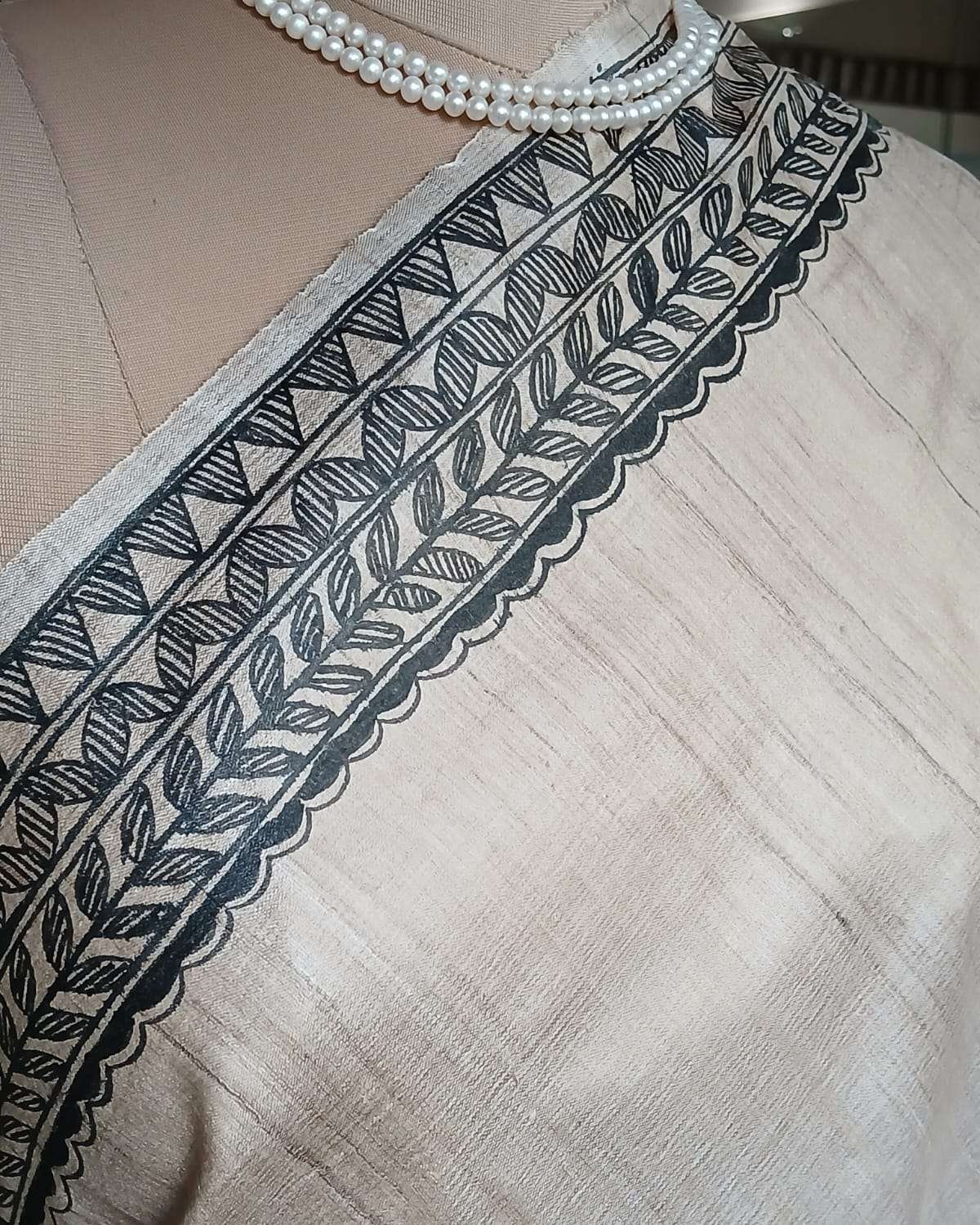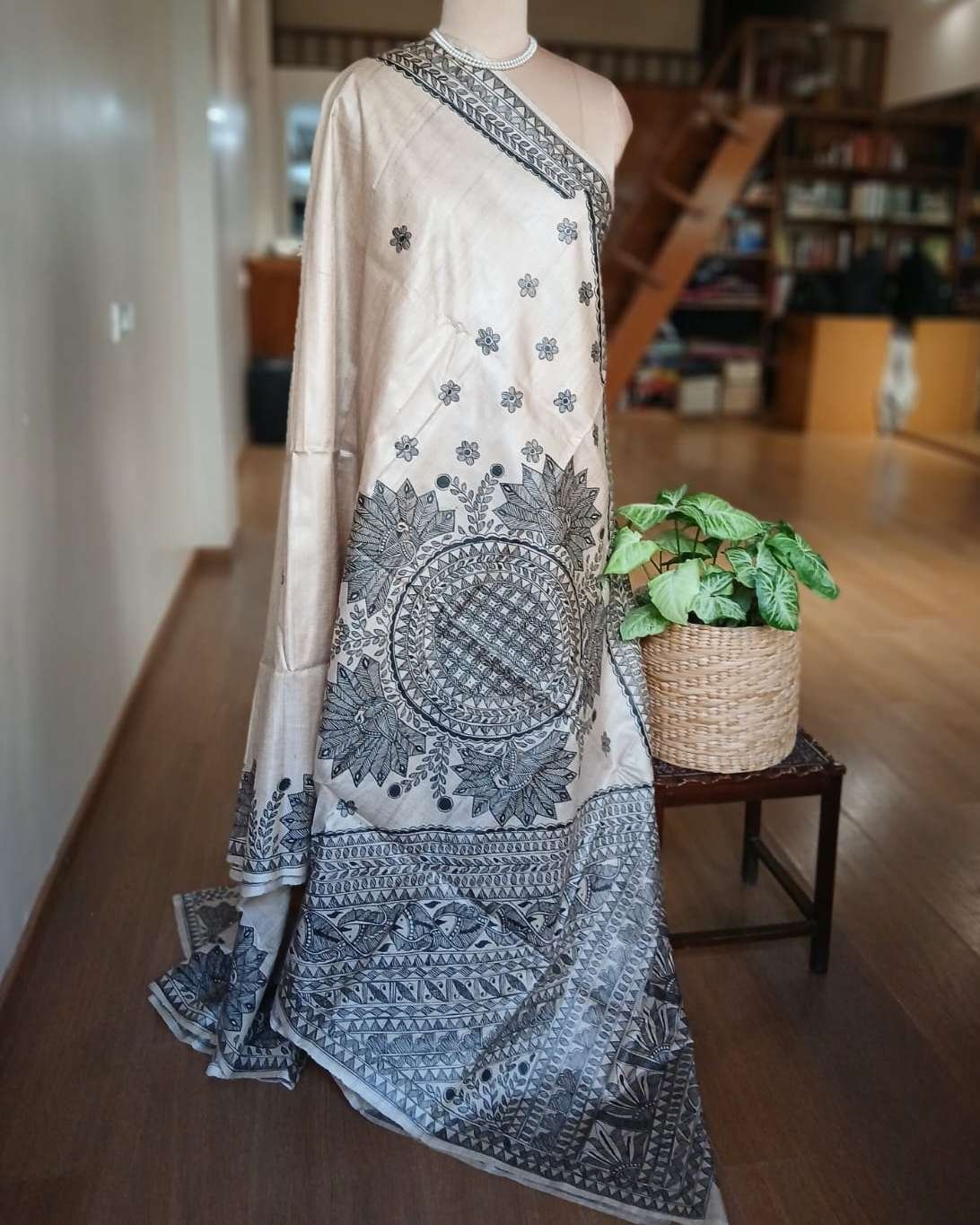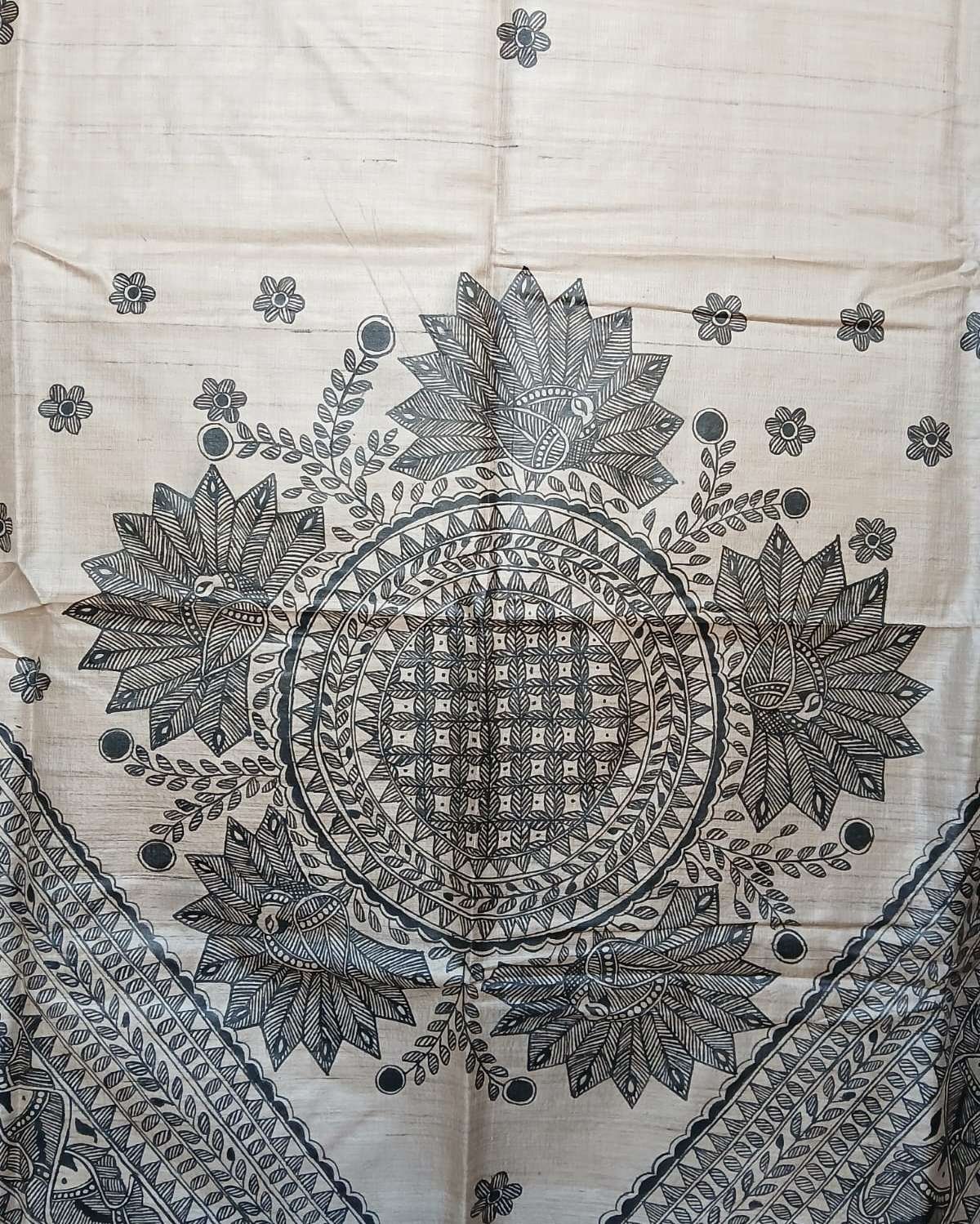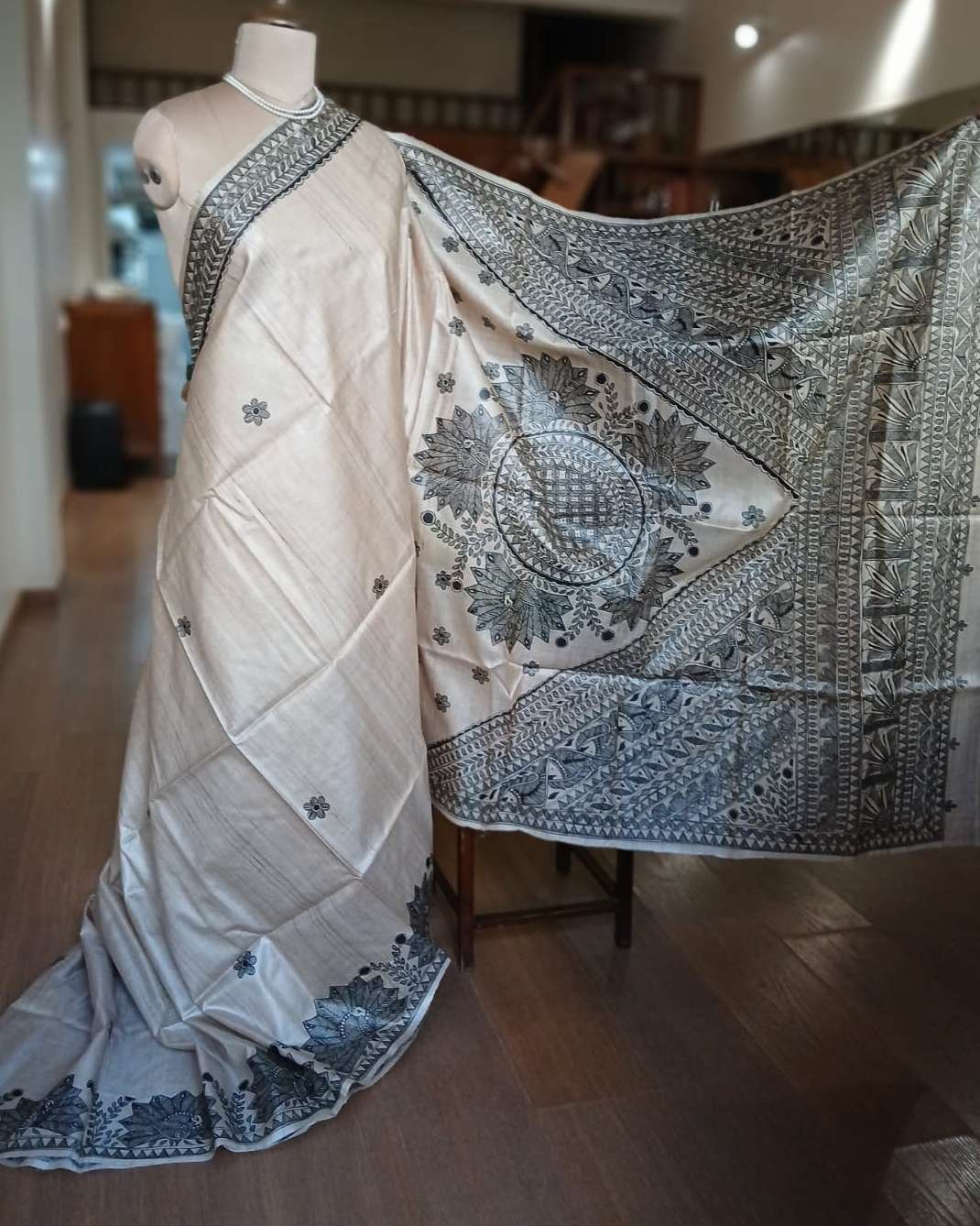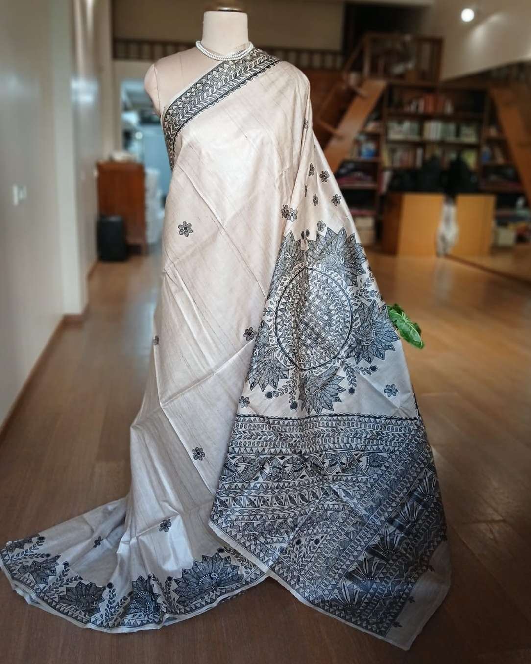 Classic Tussar Silk Saree with Madhubani handpainted designs.