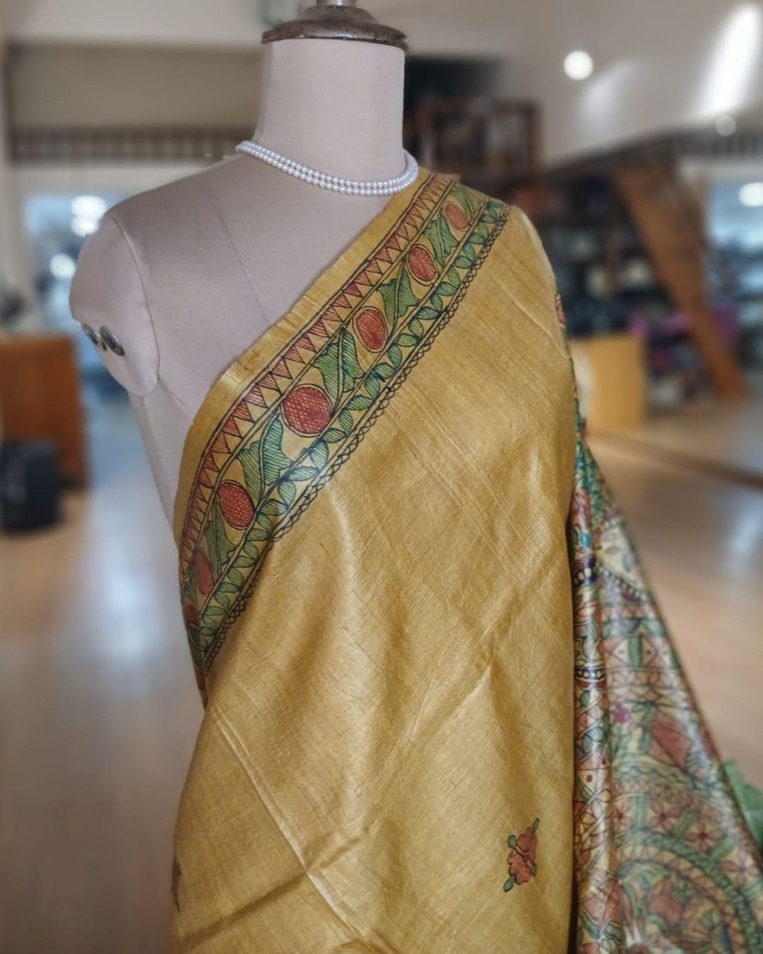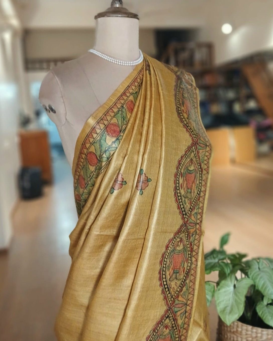 Classic Tussar Silk Saree with Madhubani handpainted designs.