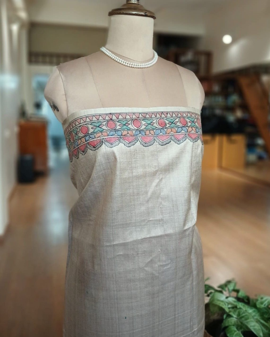 The artwork was originally painted as murals adorning rural homes, but its beauty and popularity has brought it into textiles as wearable art.