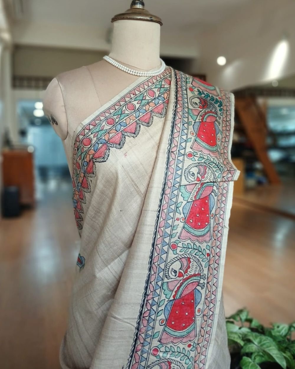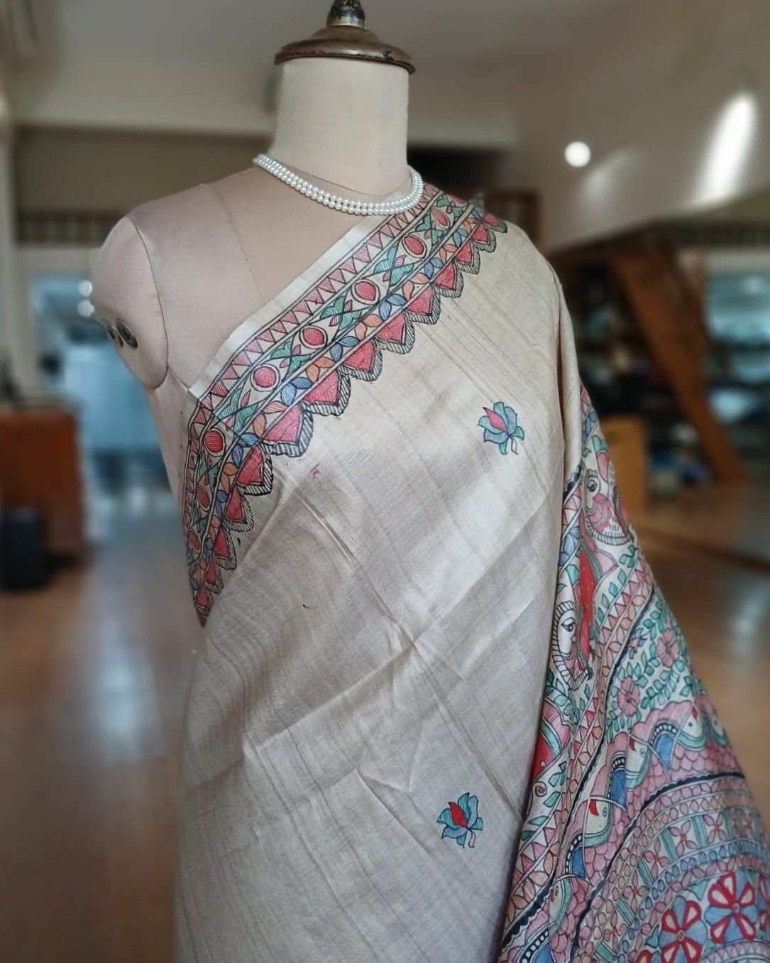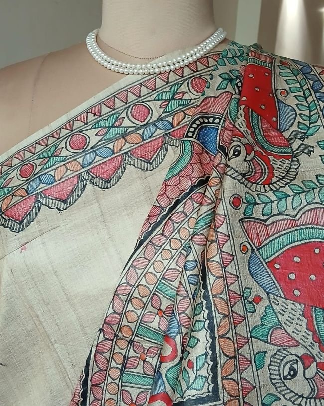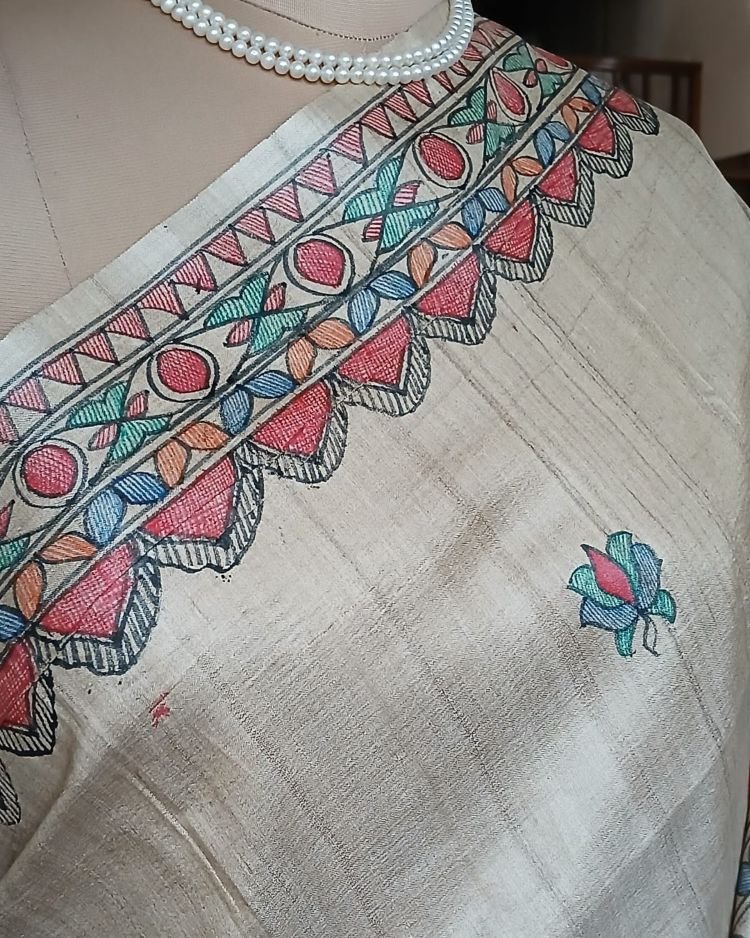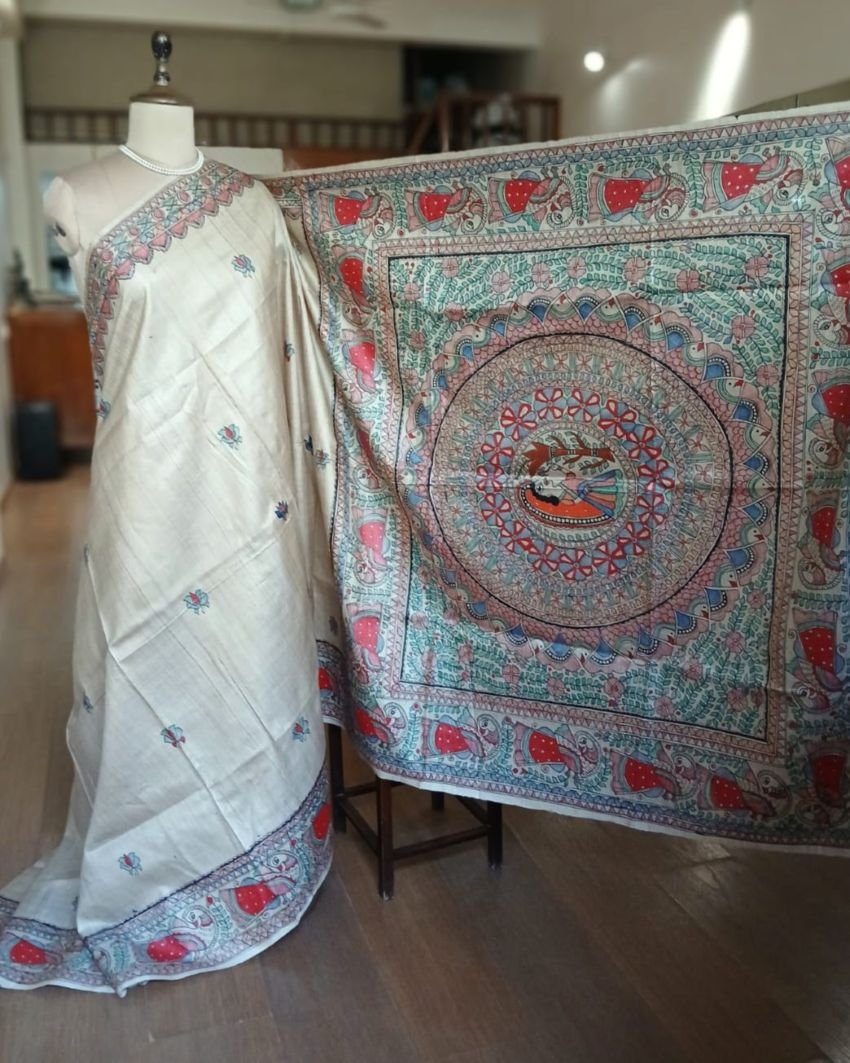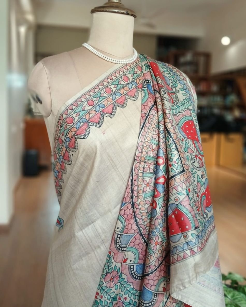 Classic Tussar Silk Saree with Madhubani handpainted designs.