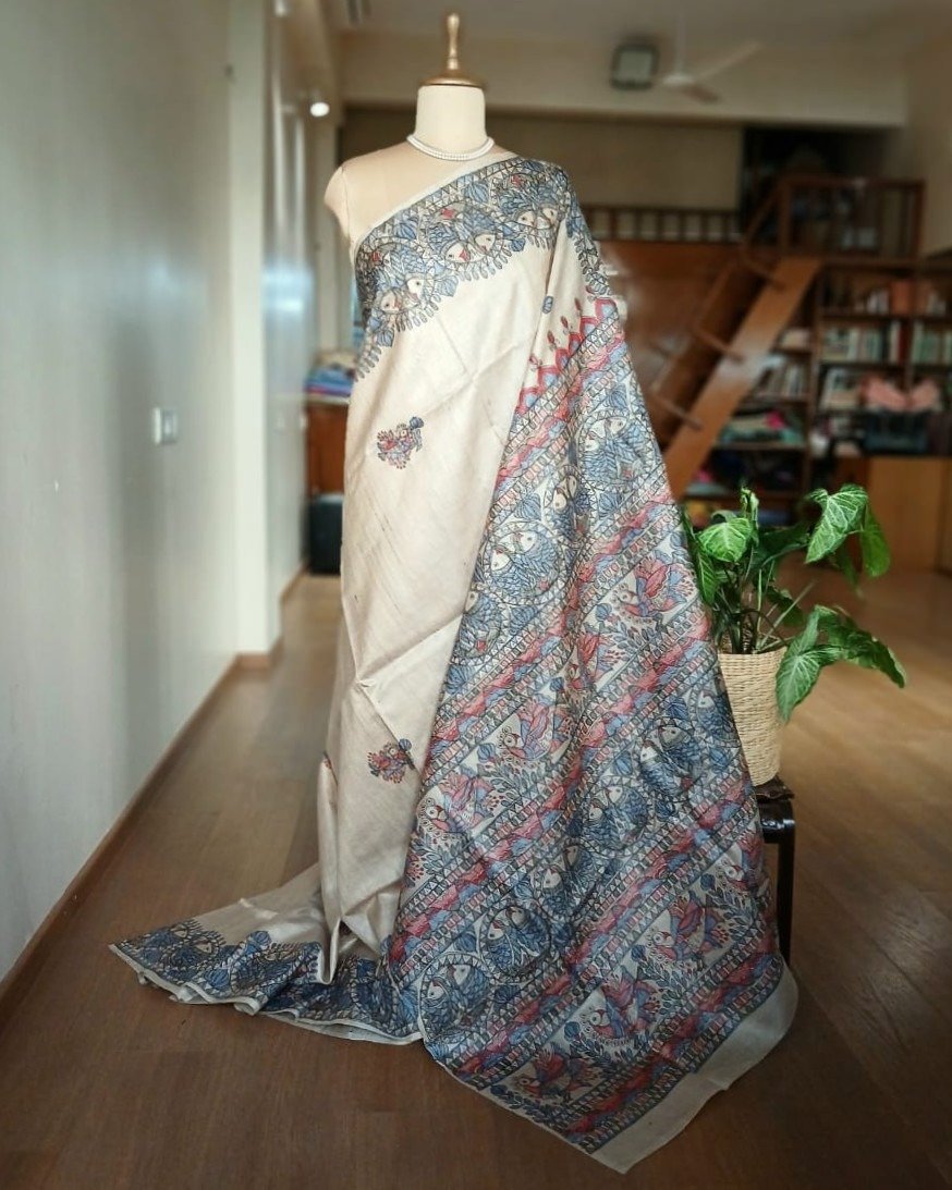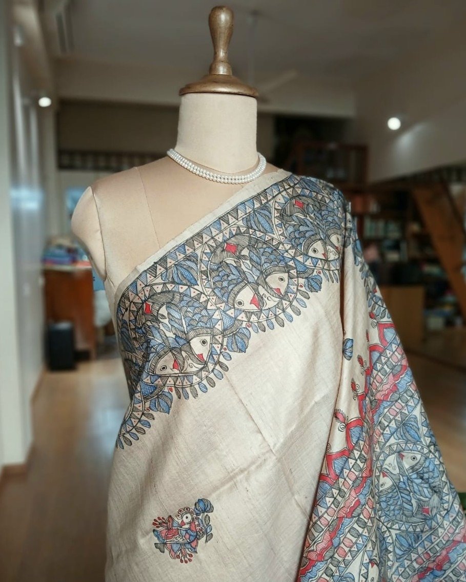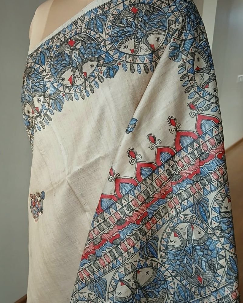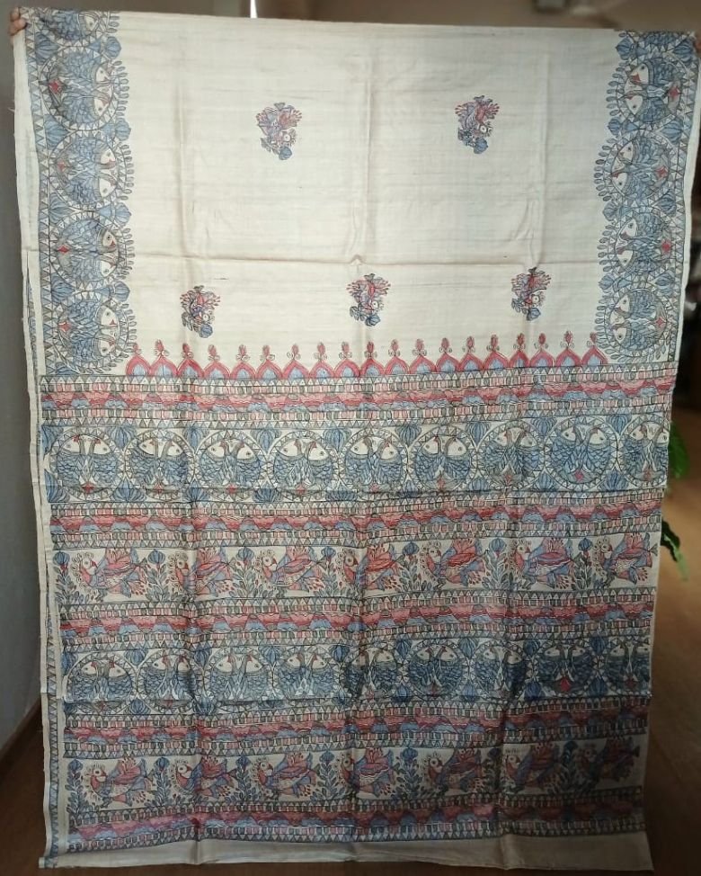 Tussar Silk Saree with Madhubani hand painted art. The pallu has Radha-Krishna under a tree.