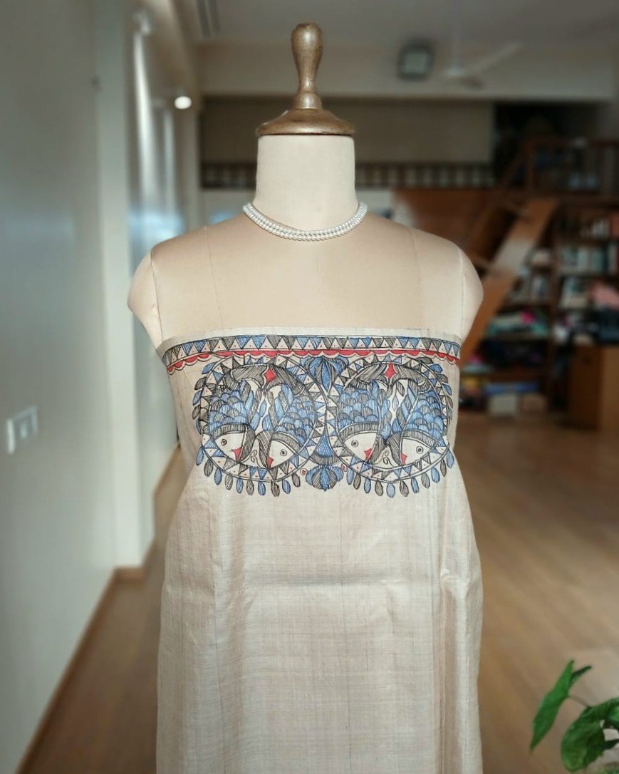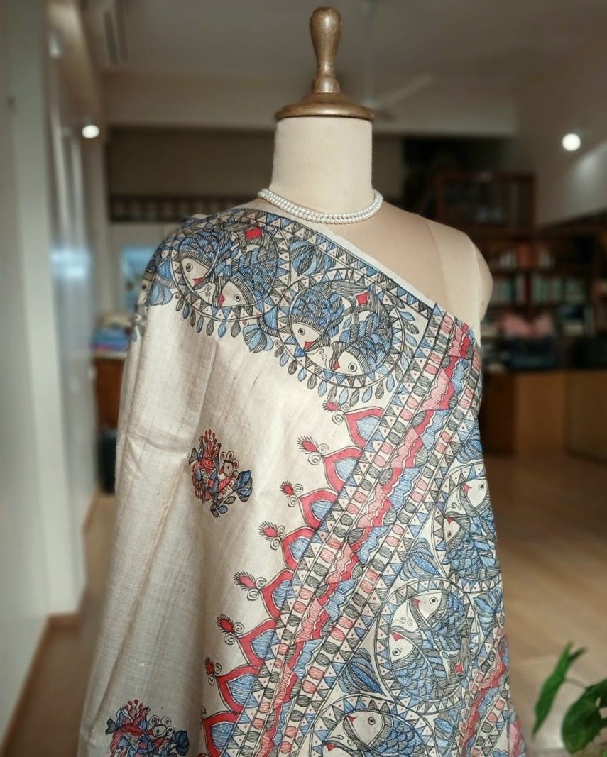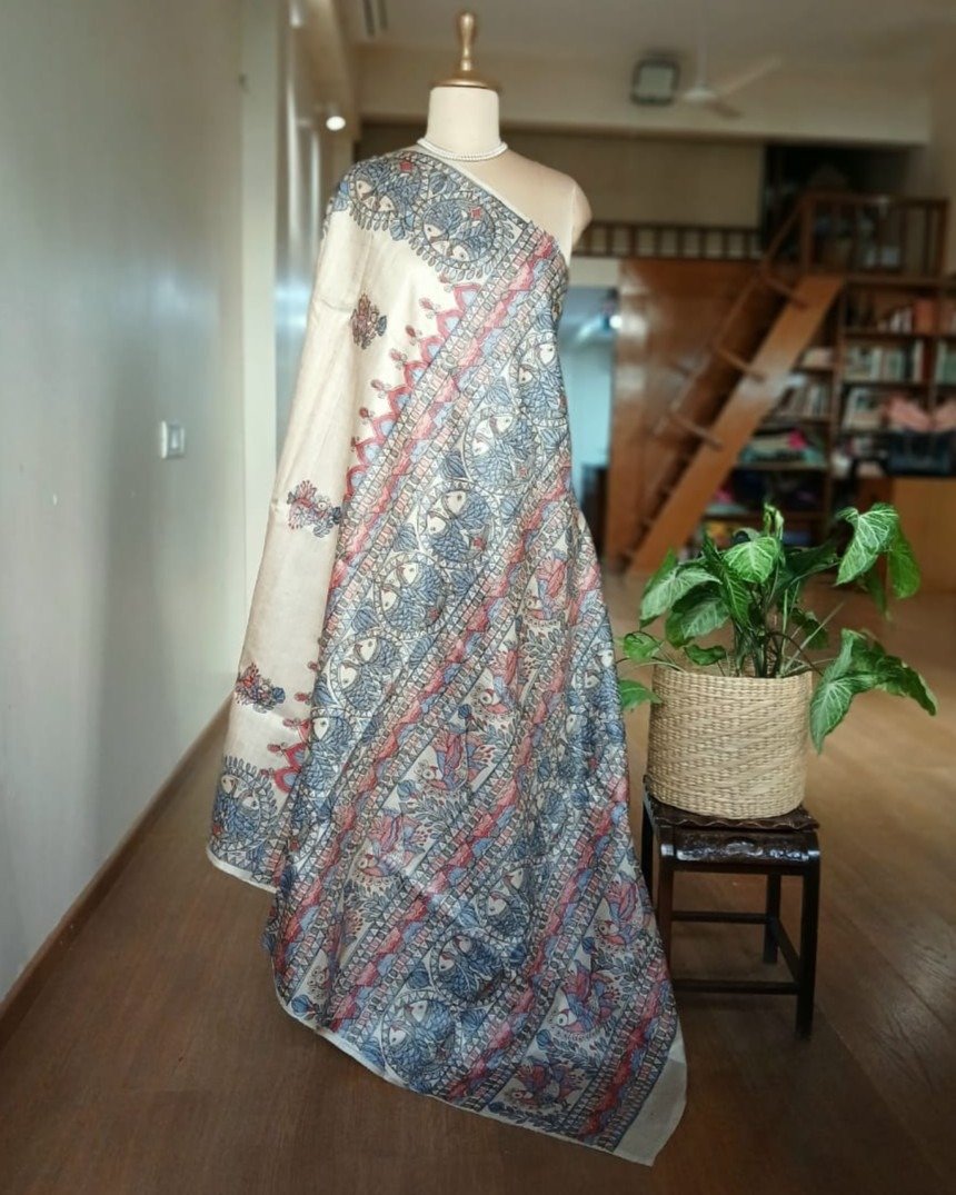 Tussar Silk Saree with Madhubani hand painted art. The pallu has Radha-Krishna under a tree.