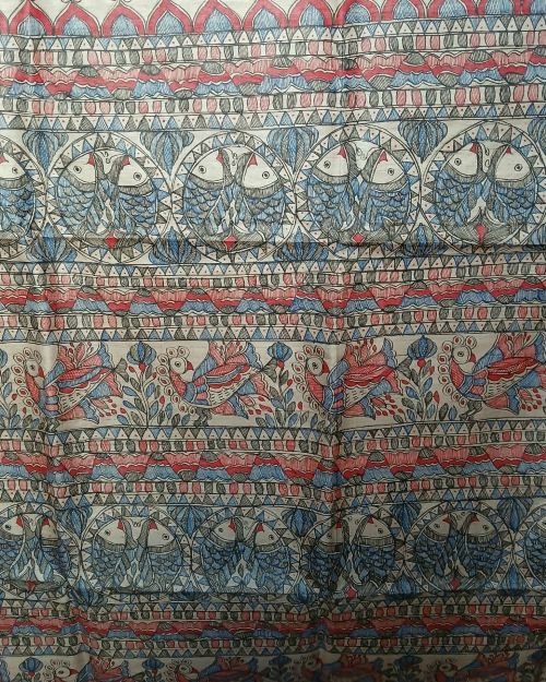 Madhubani is a traditional art form of Mithila, the birthplace of Sita Devi. The artwork was originally painted as murals adorning rural homes, but its beauty and popularity has brought it into textiles as wearable art. The folk motifs of fish, peacocks, parrots, trees, flowers, and creepers, all signify abundance.