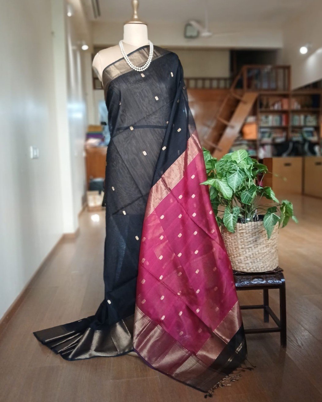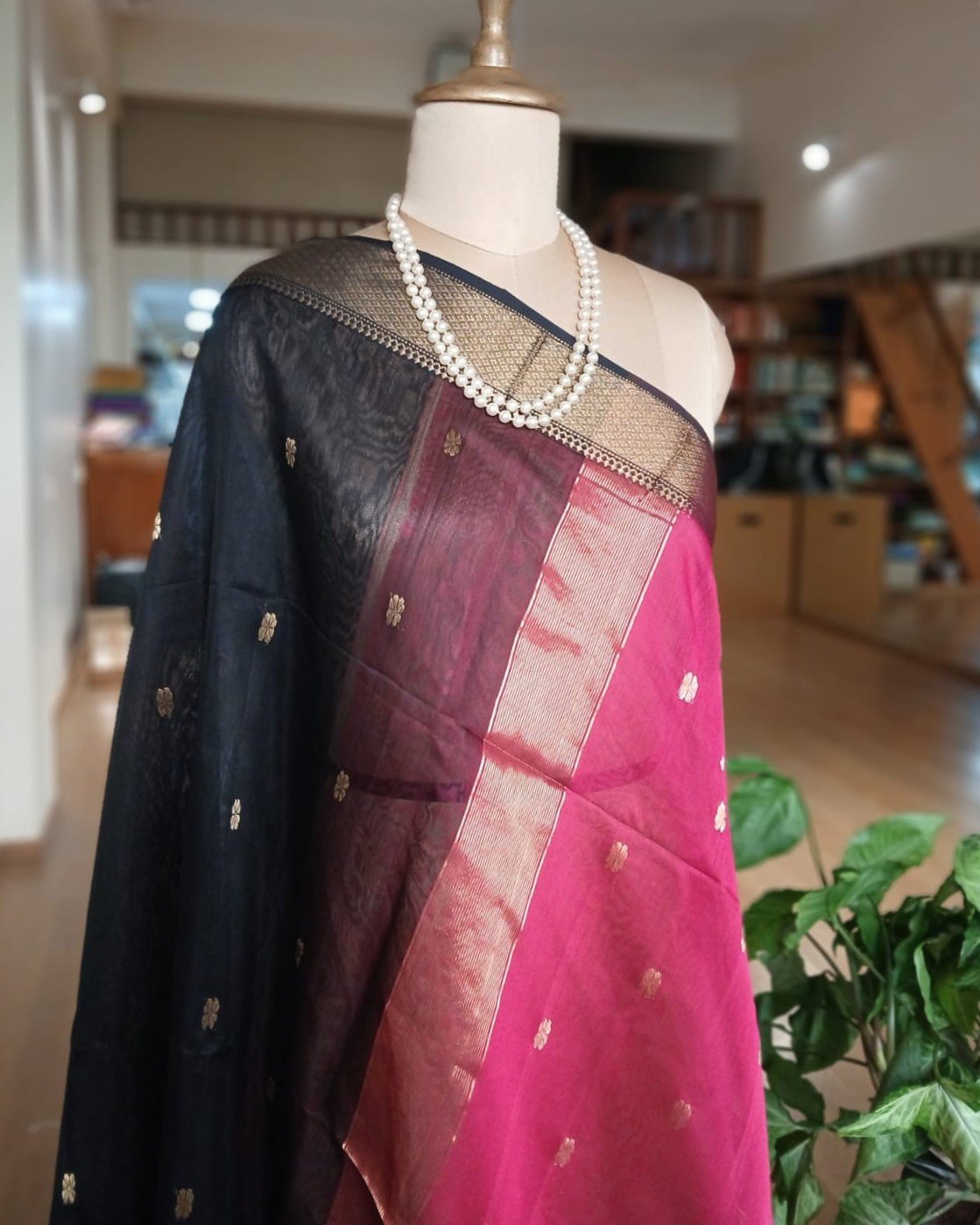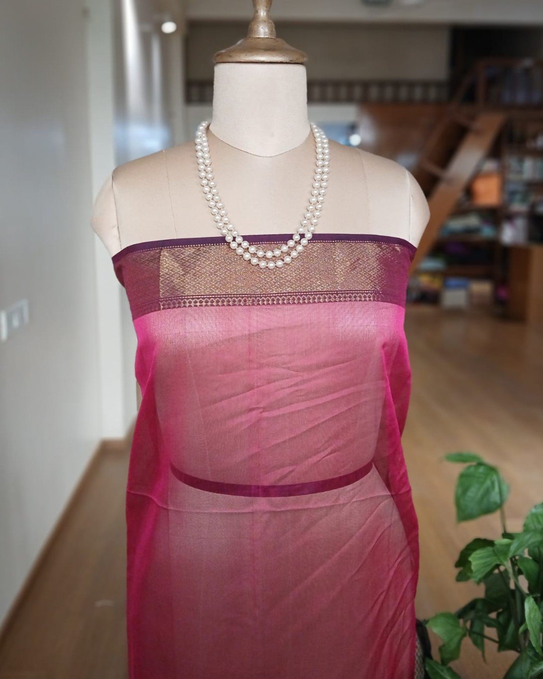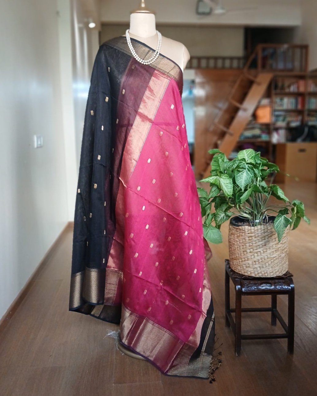 Maheshwari saree in silk cotton from the town of Maheshwar in Madhya Pradesh.
