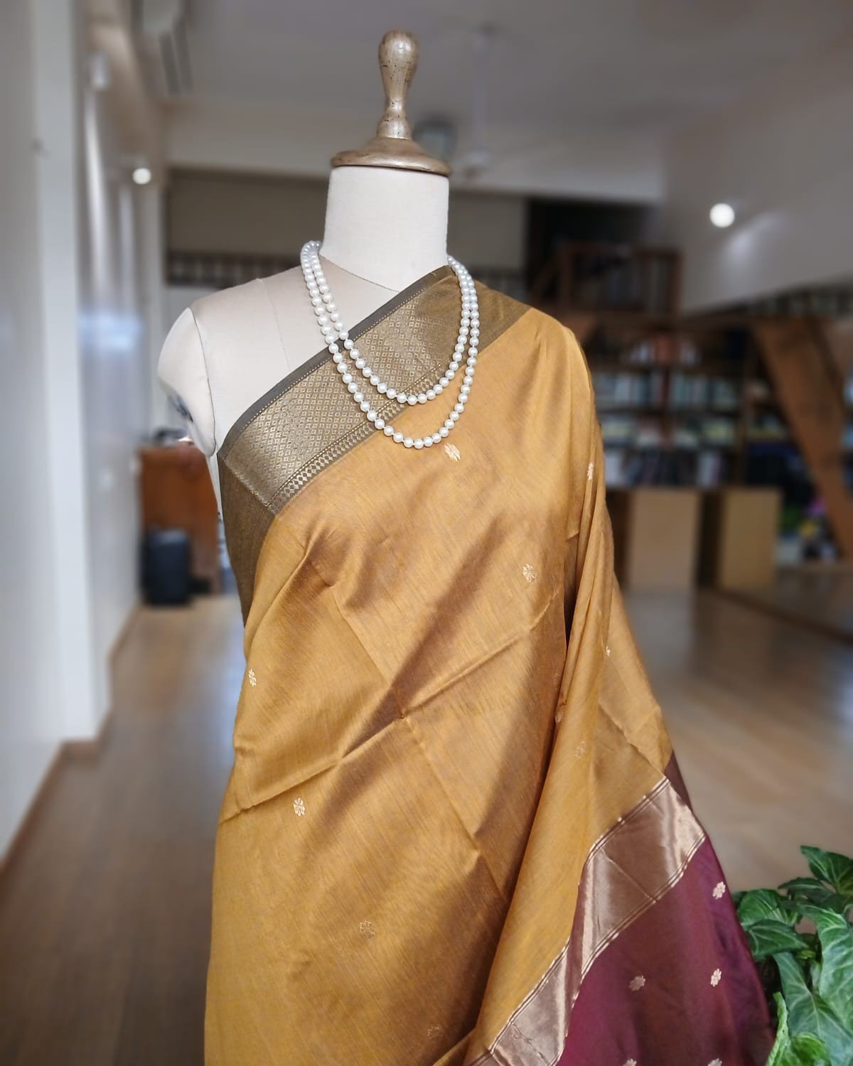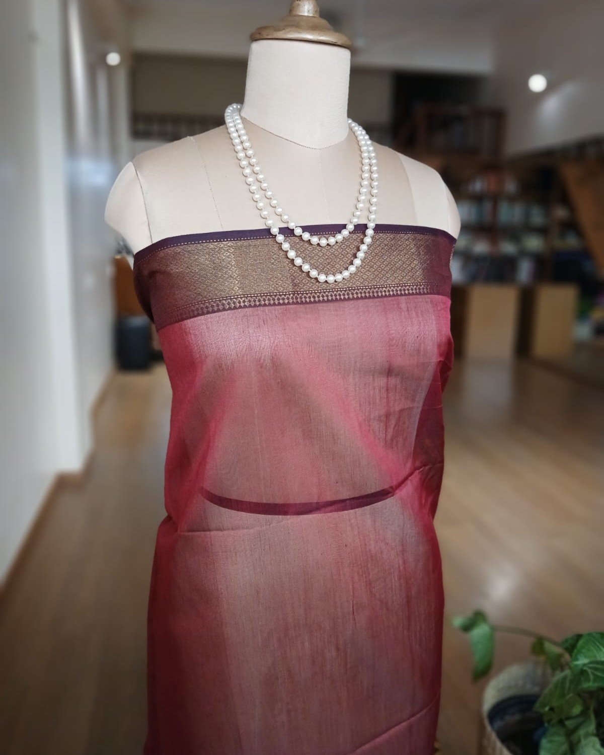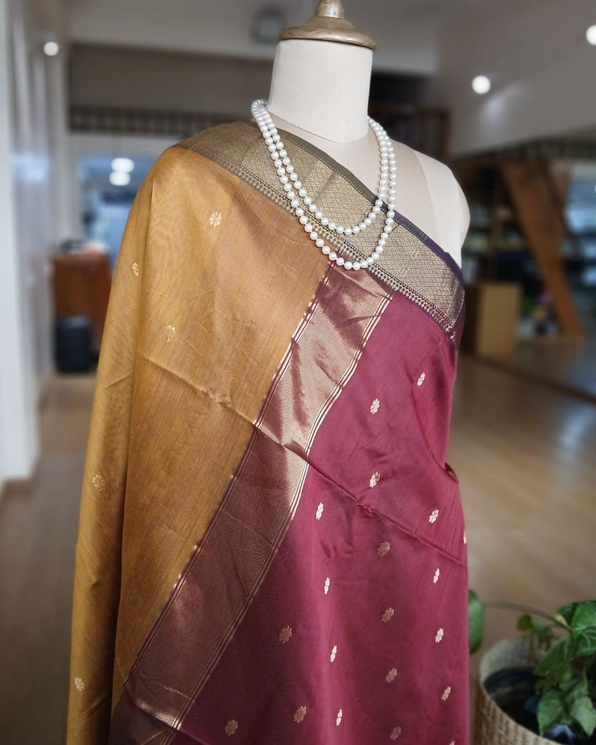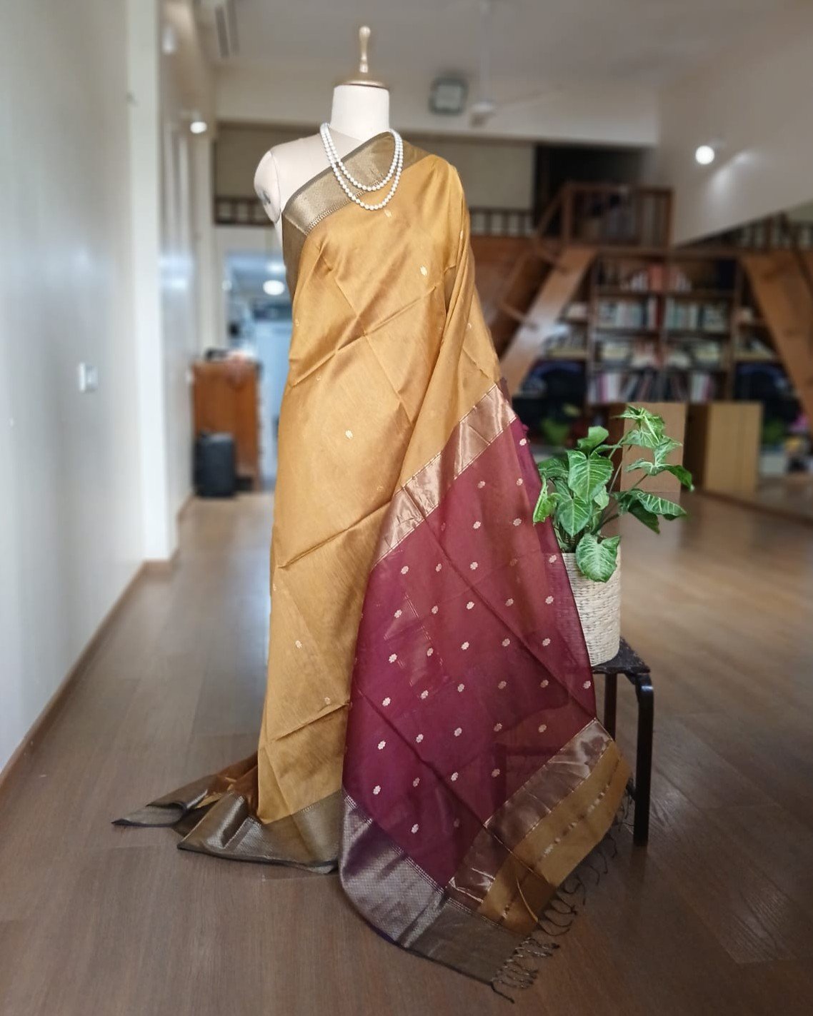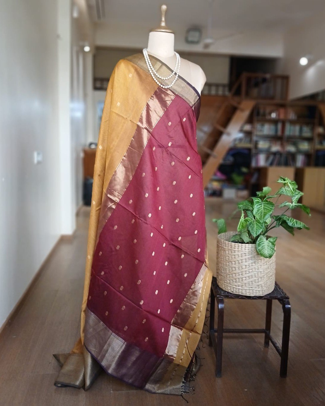 Maheshwari saree in silk cotton from the town of Maheshwar in Madhya Pradesh.