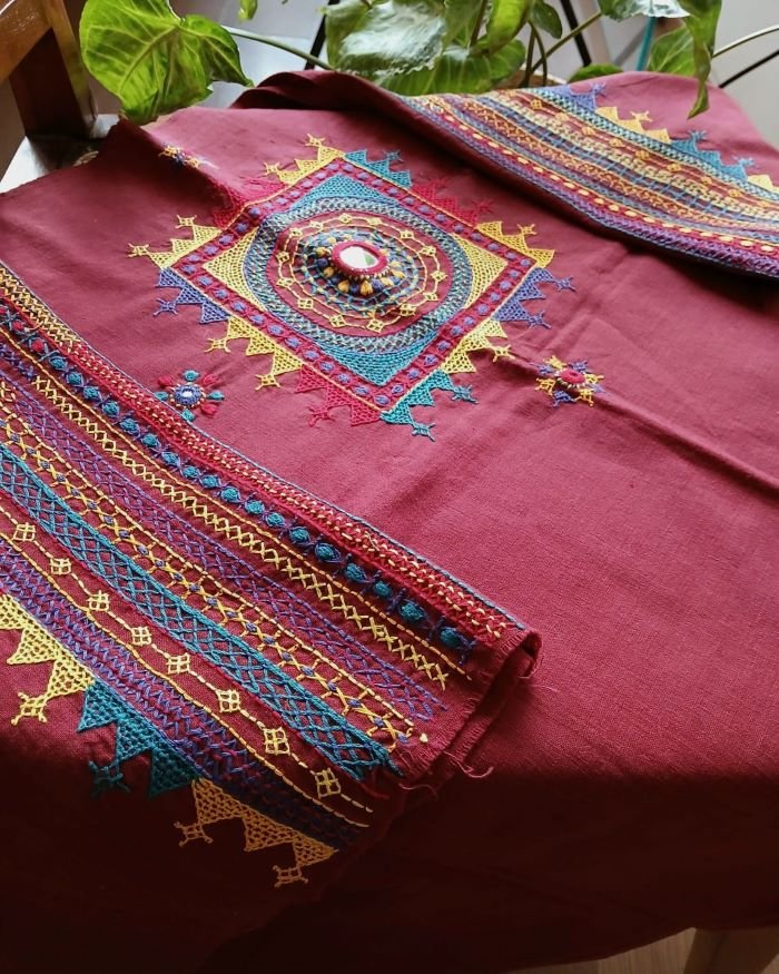 Hand-spun, hand-woven cotton blouse material with embroidery on sleeve and back.