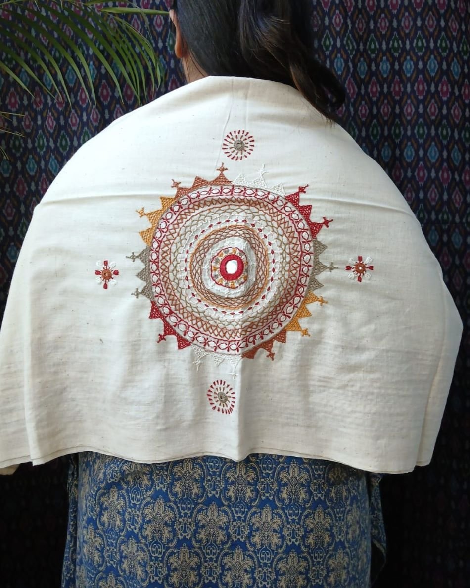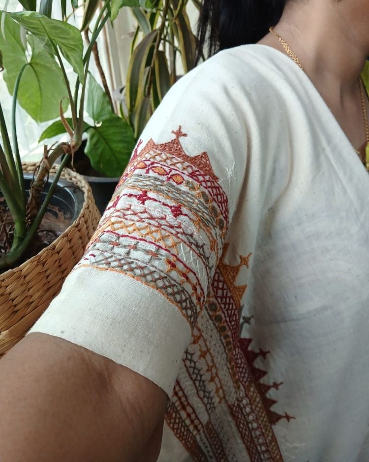 Hand-spun, hand-woven cotton blouse material with embroidery on sleeve and back.