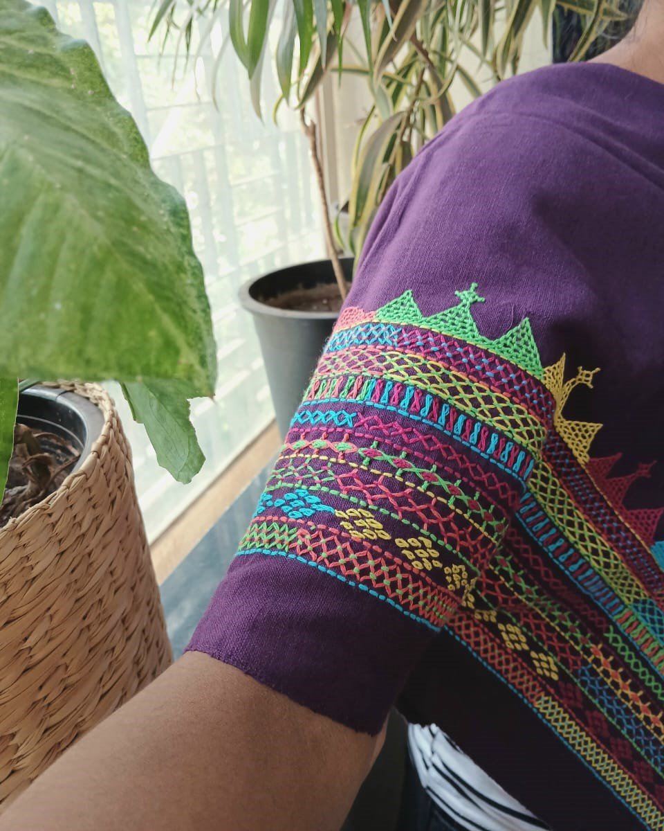 Hand-spun, hand-woven cotton blouse material with embroidery on sleeve and back.