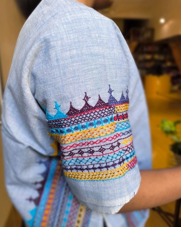 Hand-spun, hand-woven cotton blouse material with embroidery on sleeve and back.