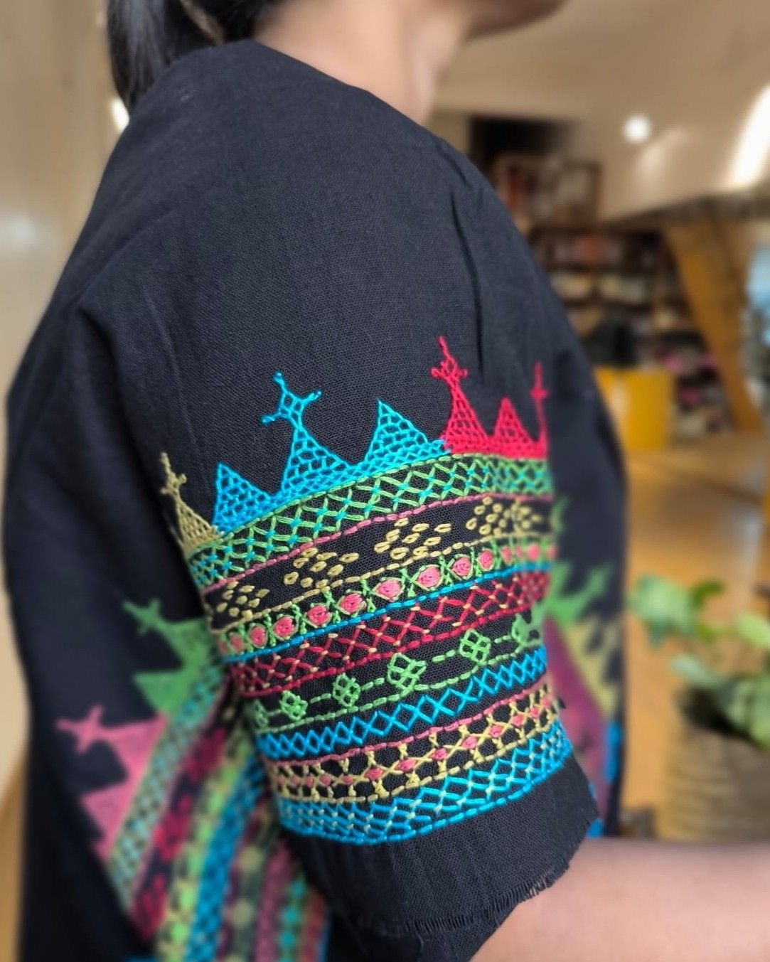 Hand-spun, hand-woven cotton blouse material with embroidery on sleeve and back.