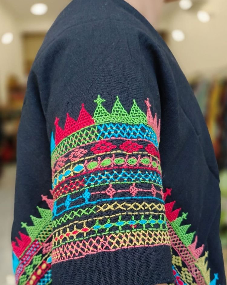 Hand-spun, hand-woven cotton blouse material with embroidery on sleeve and back.