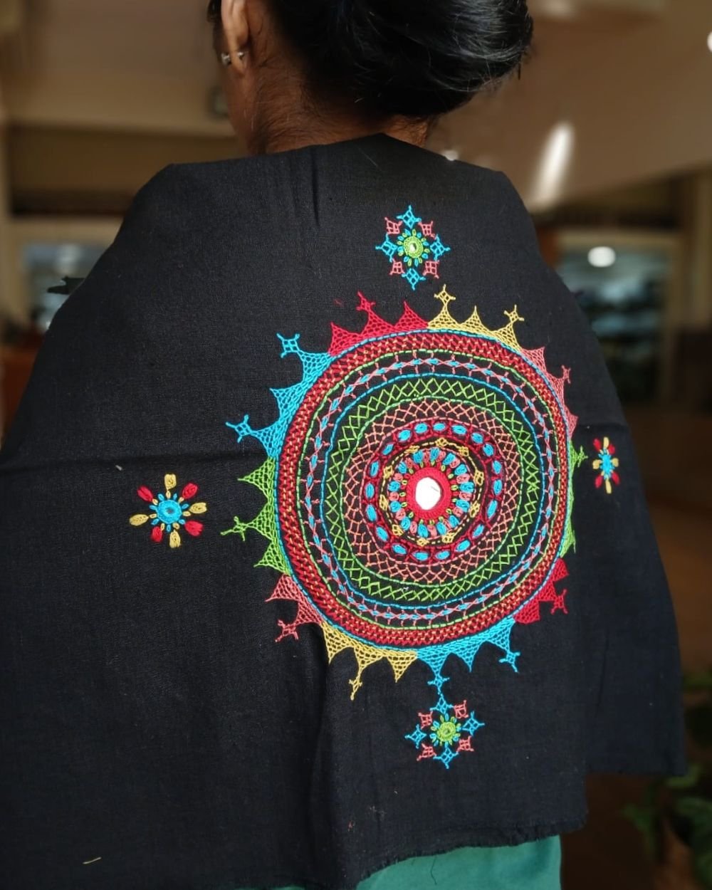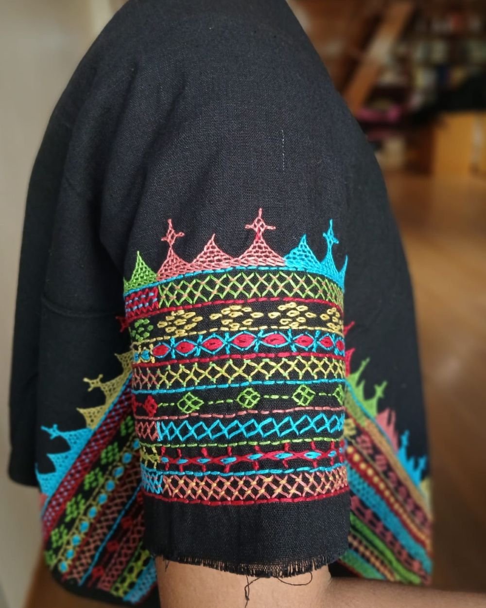 Hand-spun, hand-woven cotton blouse material with embroidery on sleeve and back.