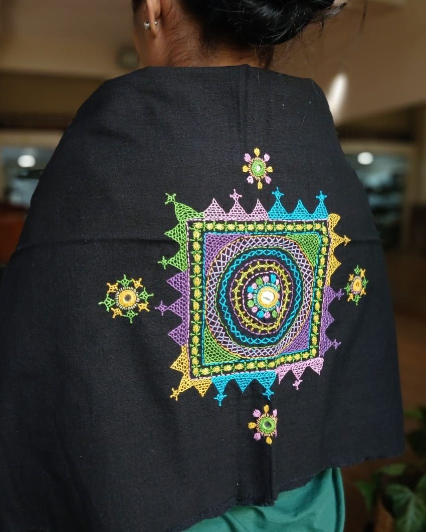 Hand-spun, hand-woven cotton blouse material with embroidery on sleeve and back.