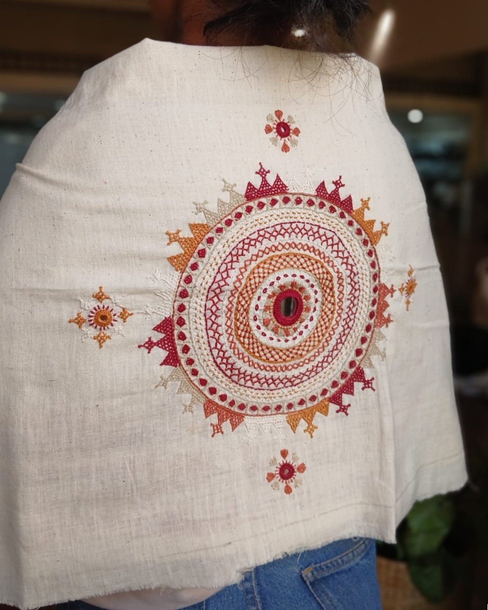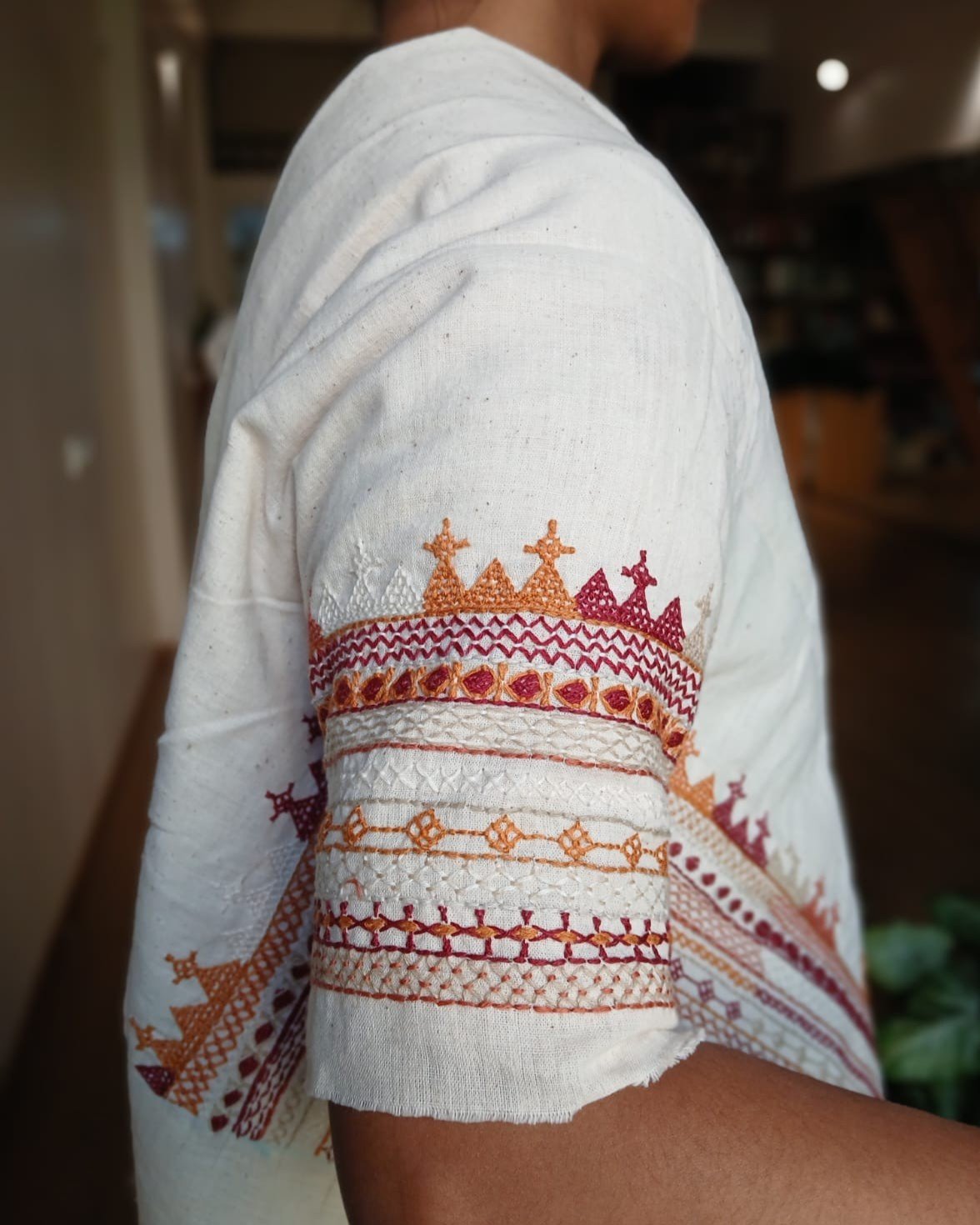 Hand-spun, hand-woven cotton blouse material with embroidery on sleeve and back.