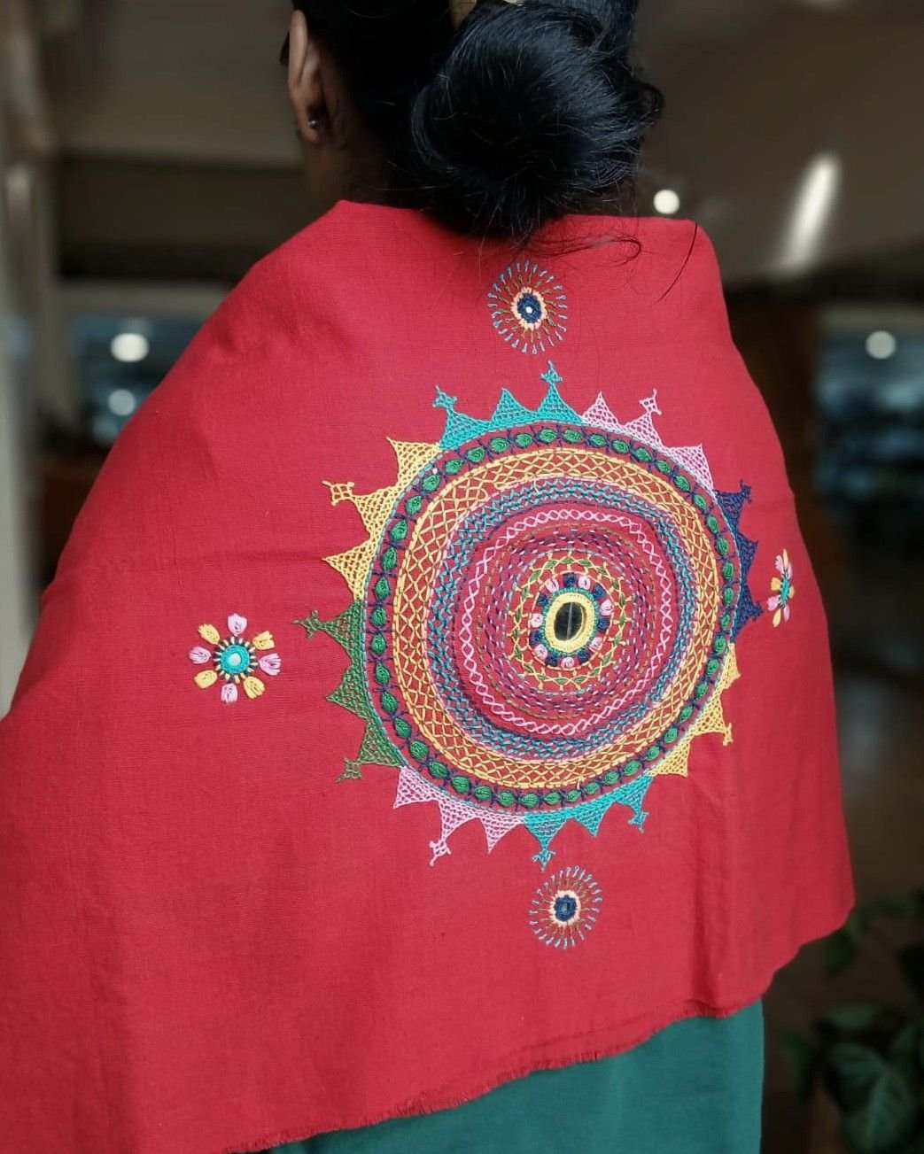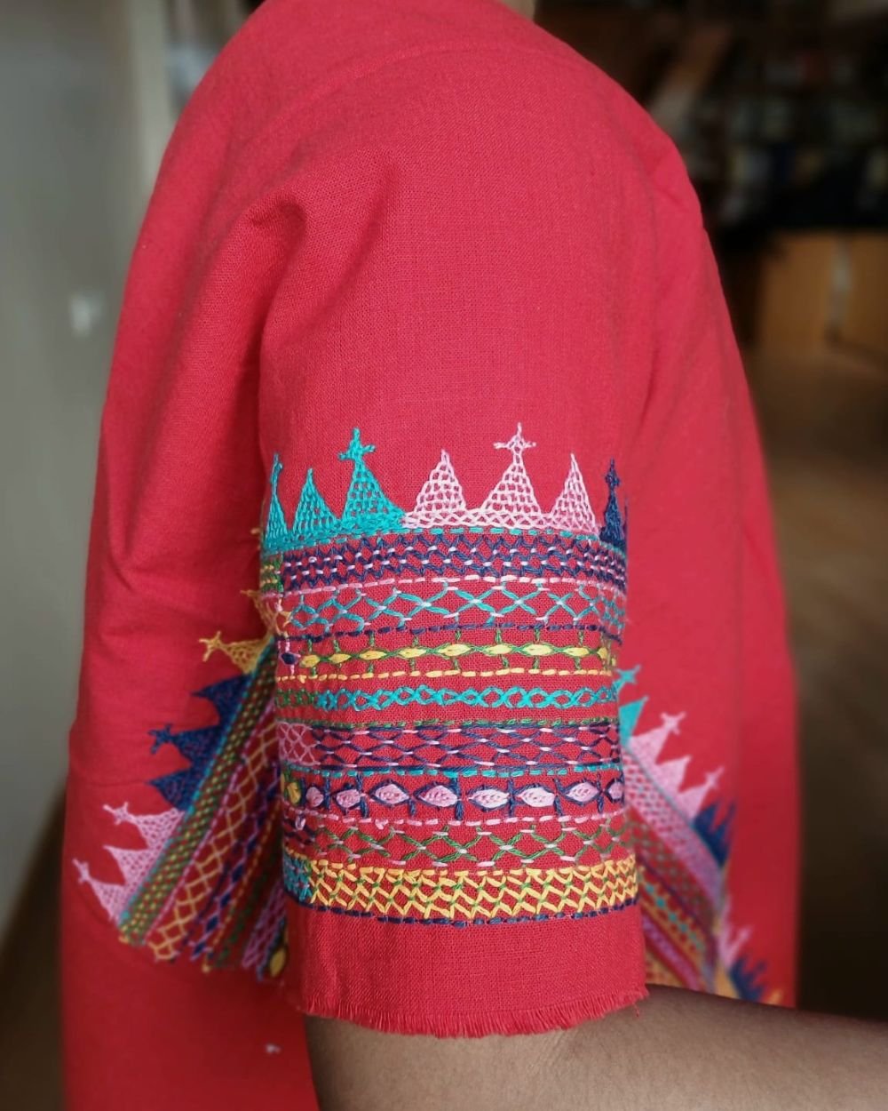 Hand-spun, hand-woven cotton blouse material with embroidery on sleeve and back.