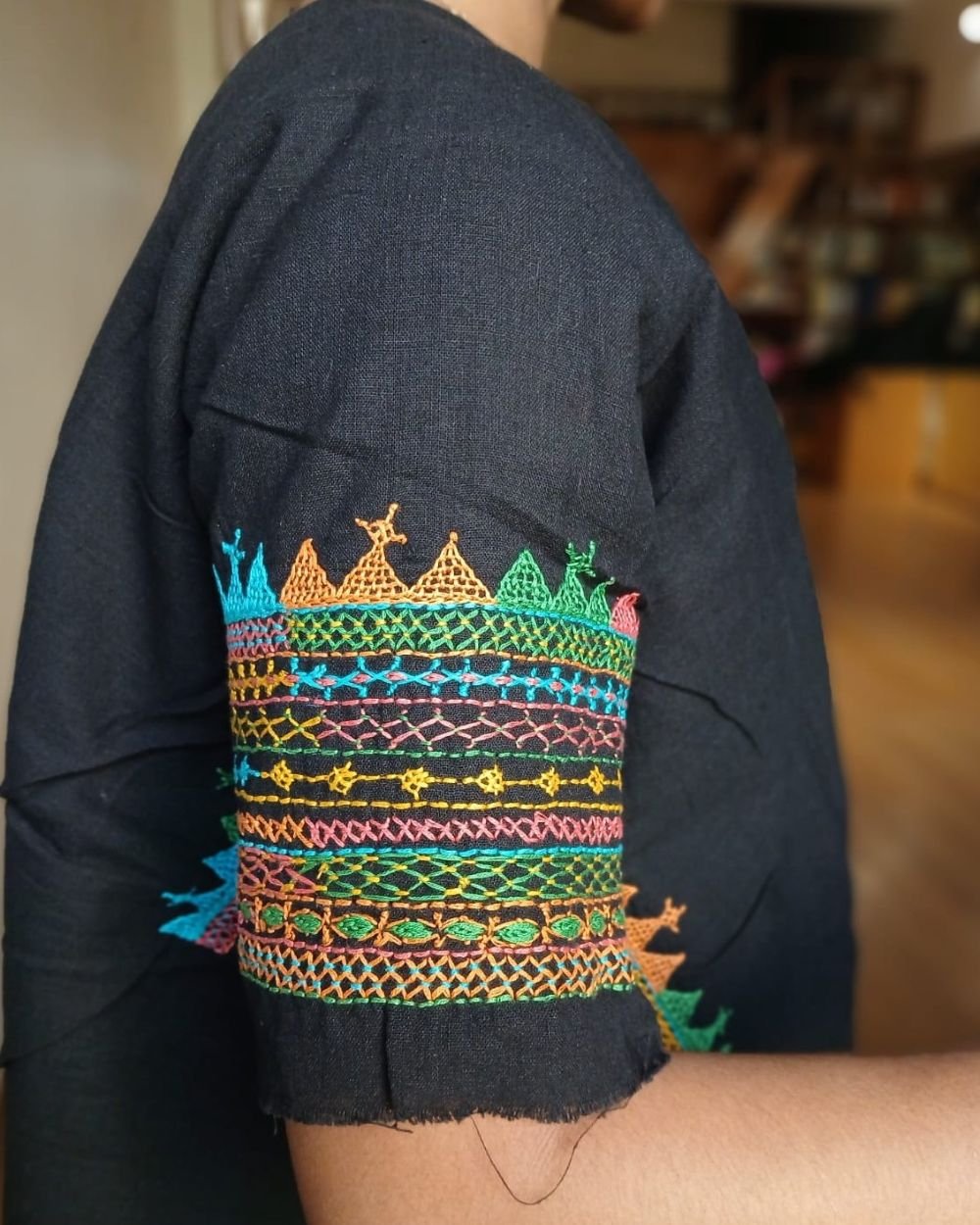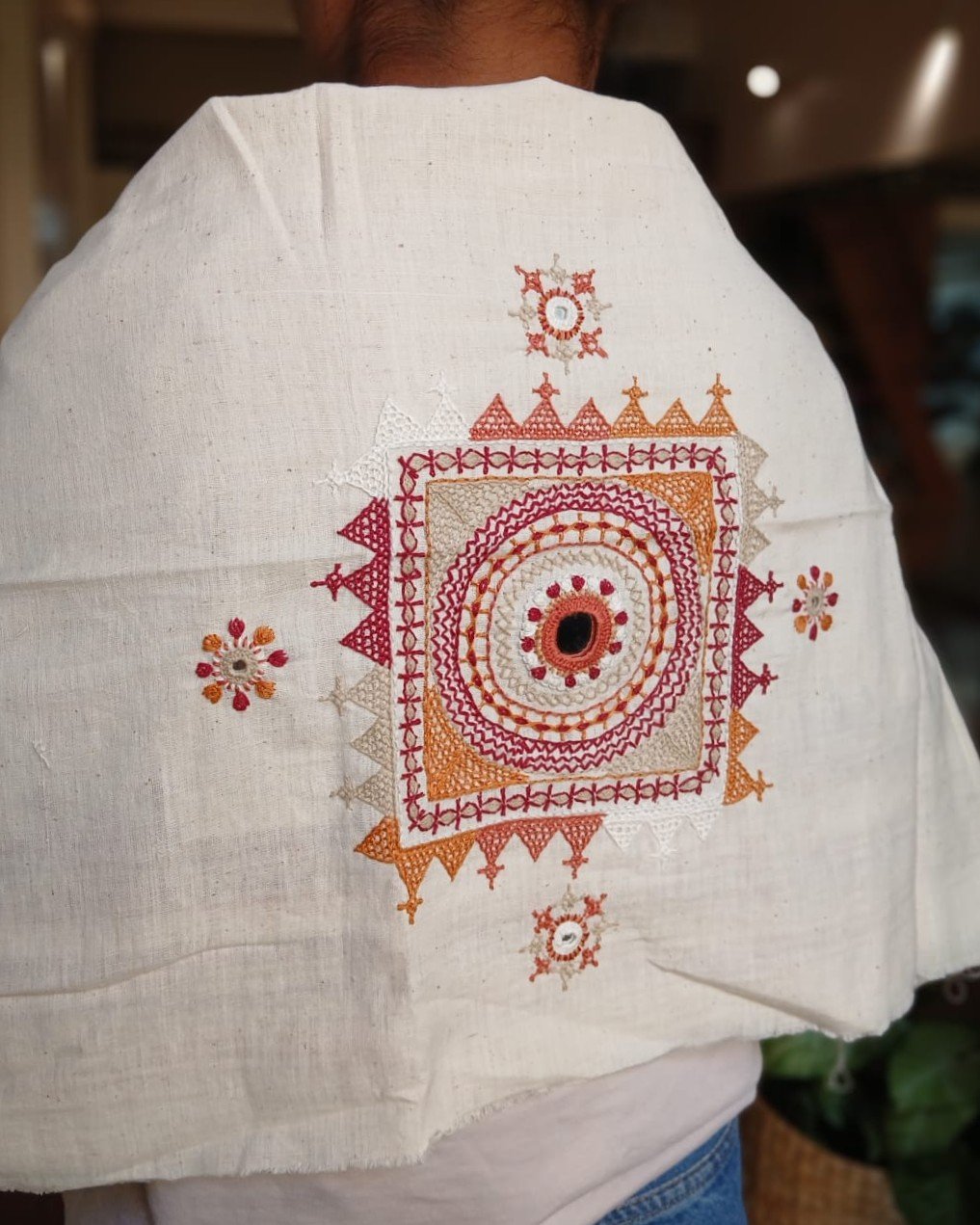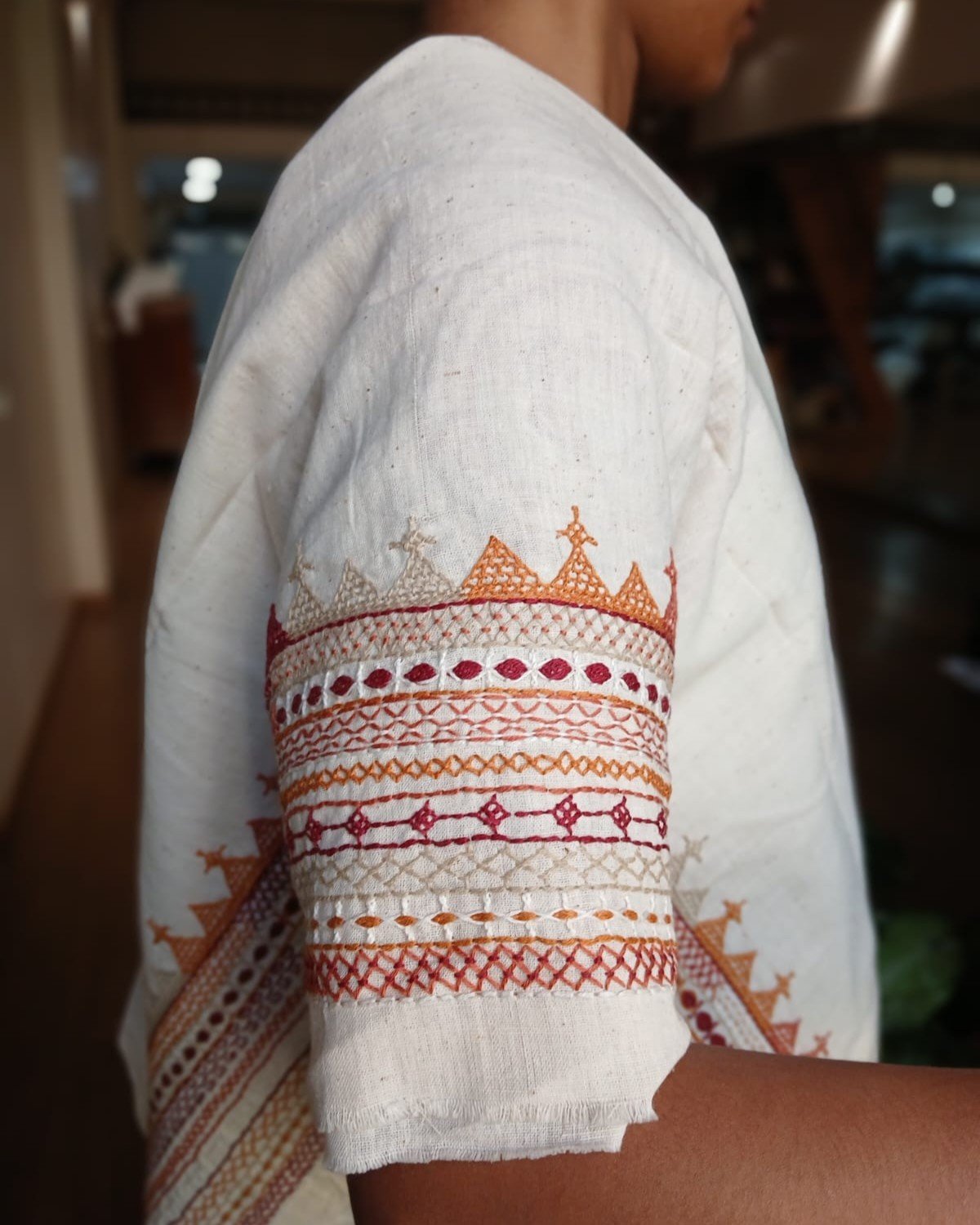 Hand-spun, hand-woven cotton blouse material with embroidery on sleeve and back.