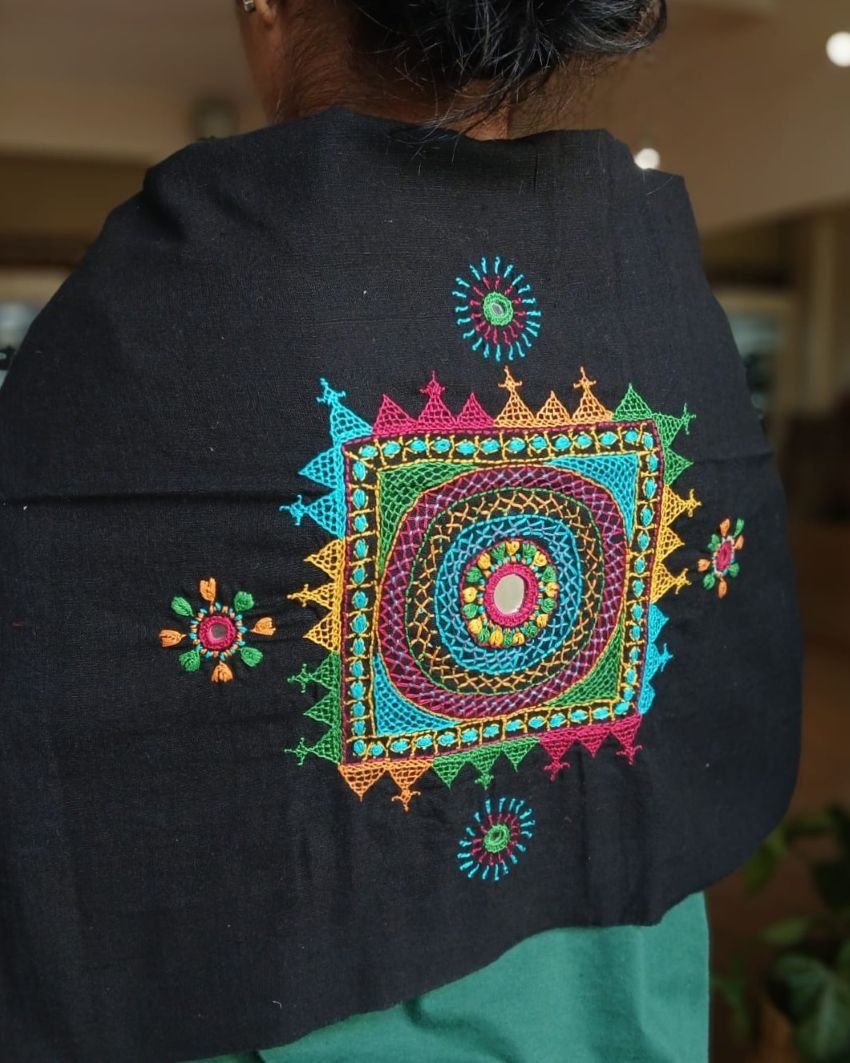 Hand-spun, hand-woven cotton blouse material with embroidery on sleeve and back.