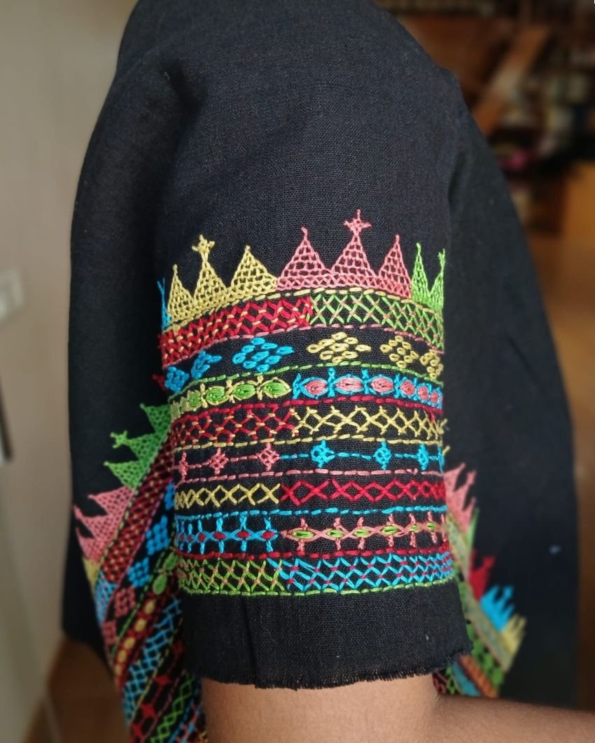 Hand-spun, hand-woven cotton blouse material with embroidery on sleeve and back.