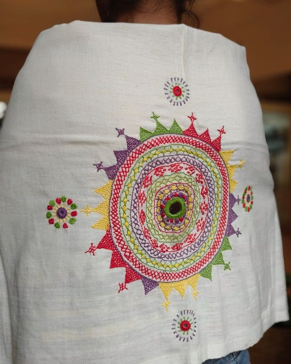 Hand-spun, hand-woven cotton blouse material with embroidery on sleeve and back.