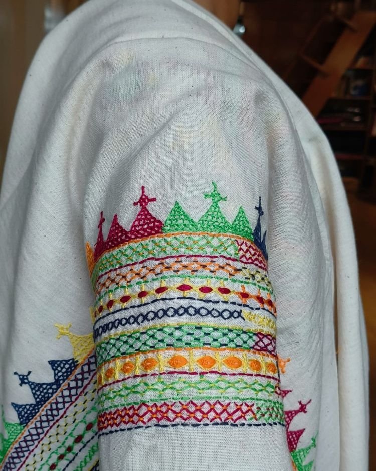 Hand-spun, hand-woven cotton blouse material with embroidery on sleeve and back.