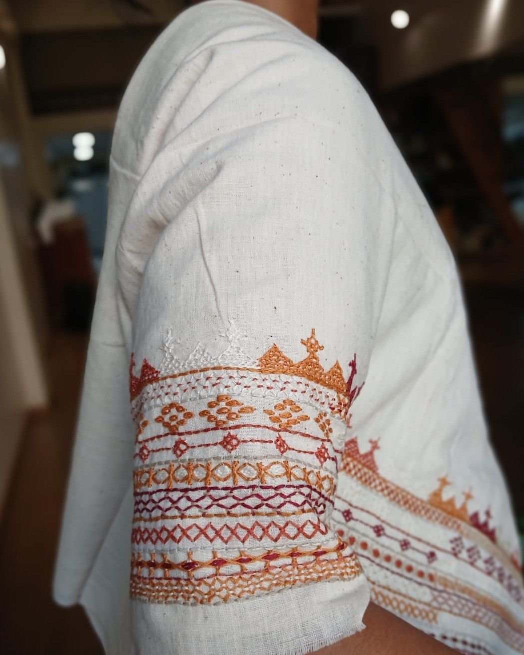 Hand-spun, hand-woven cotton blouse material with embroidery on sleeve and back.