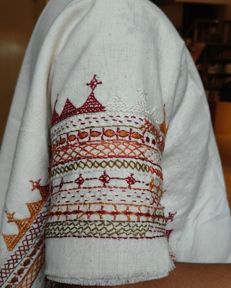 Hand-spun, hand-woven cotton blouse material with embroidery on sleeve and back.