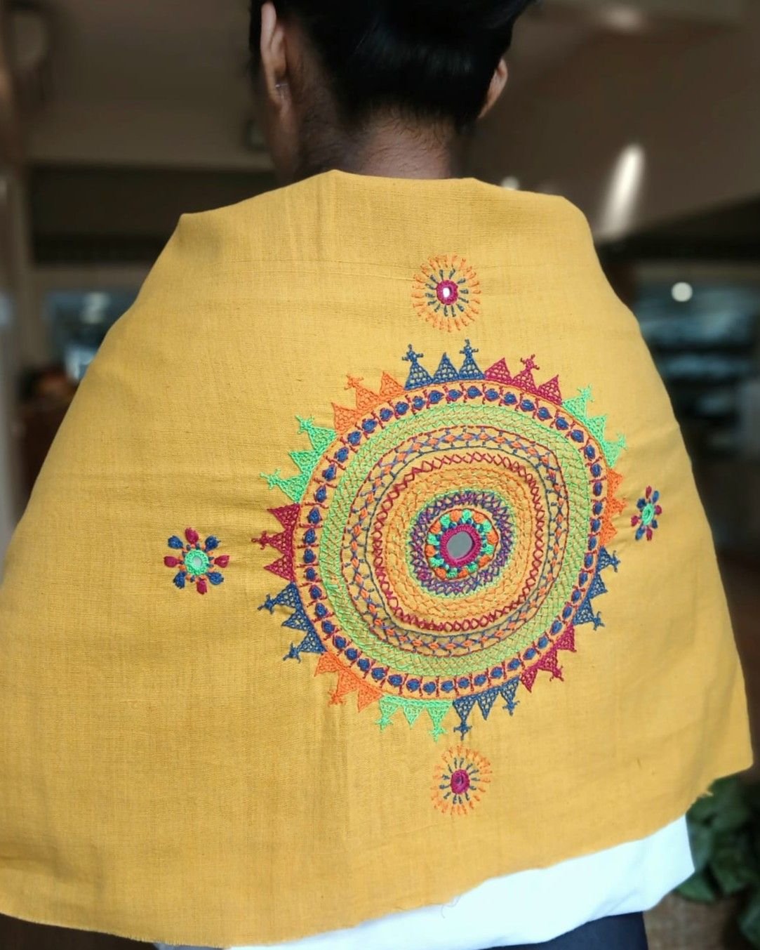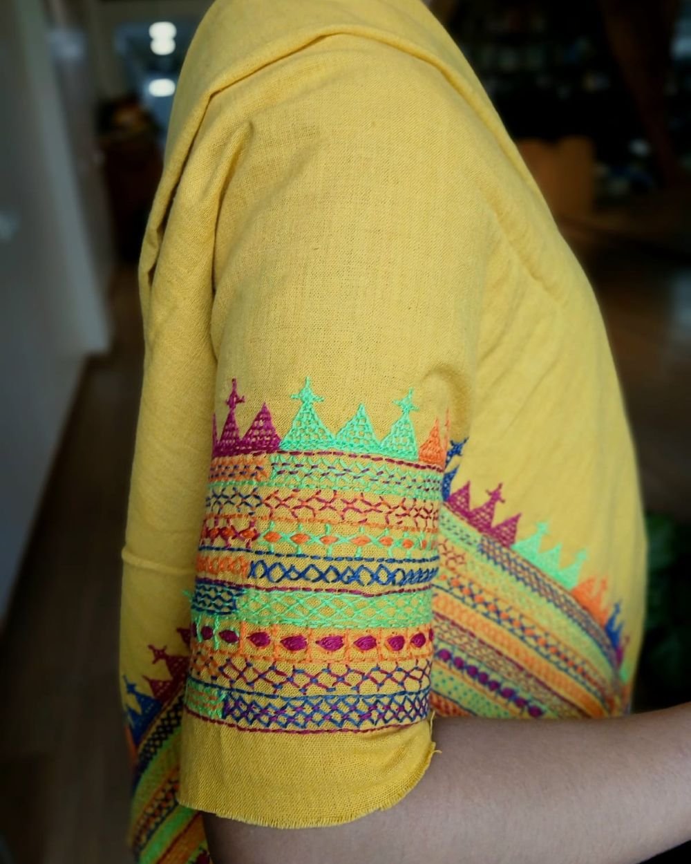 Hand-spun, hand-woven cotton blouse material with embroidery on sleeve and back.