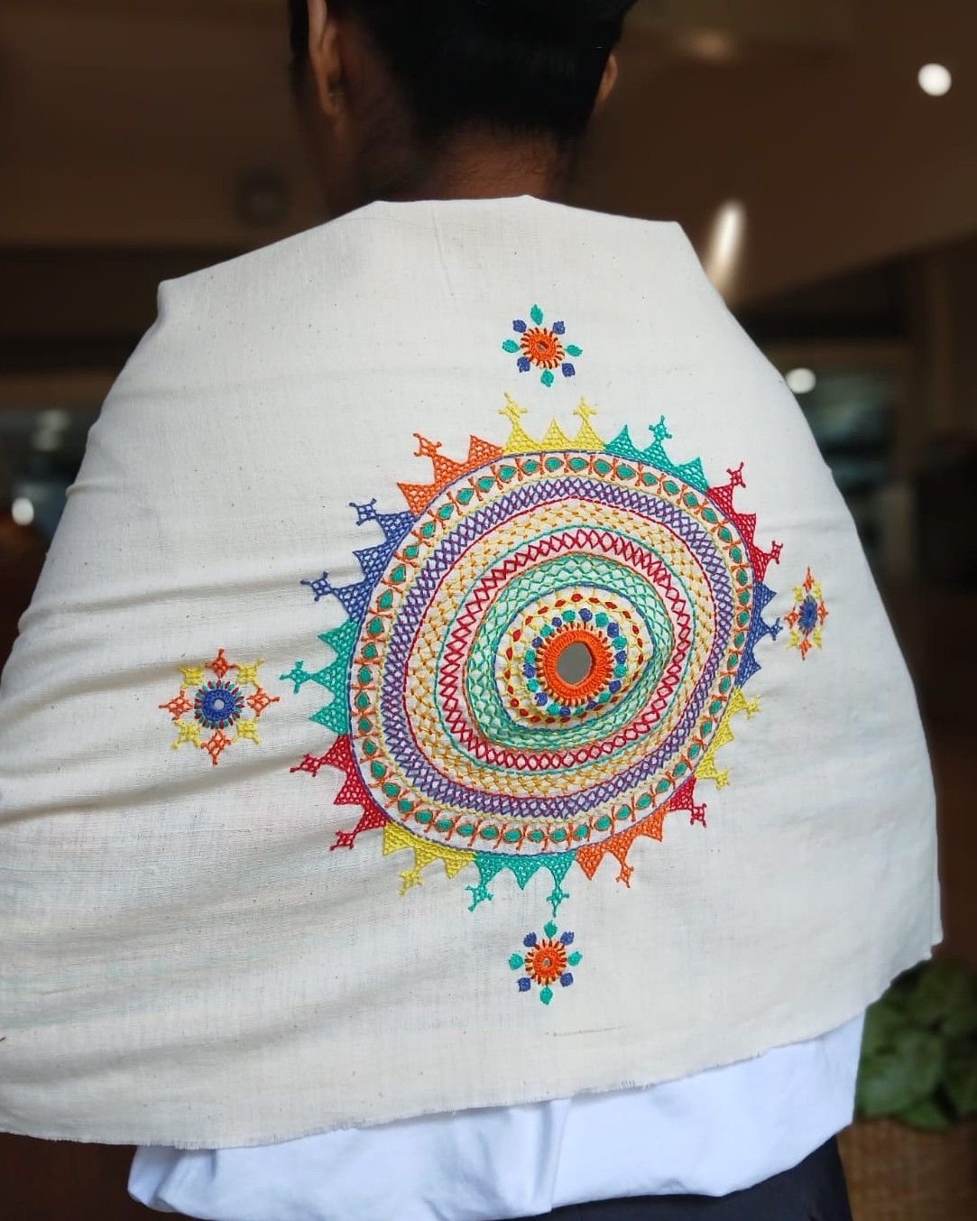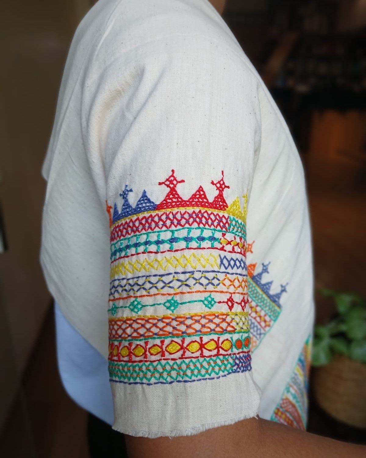 Hand-spun, hand-woven cotton blouse material with embroidery on sleeve and back.