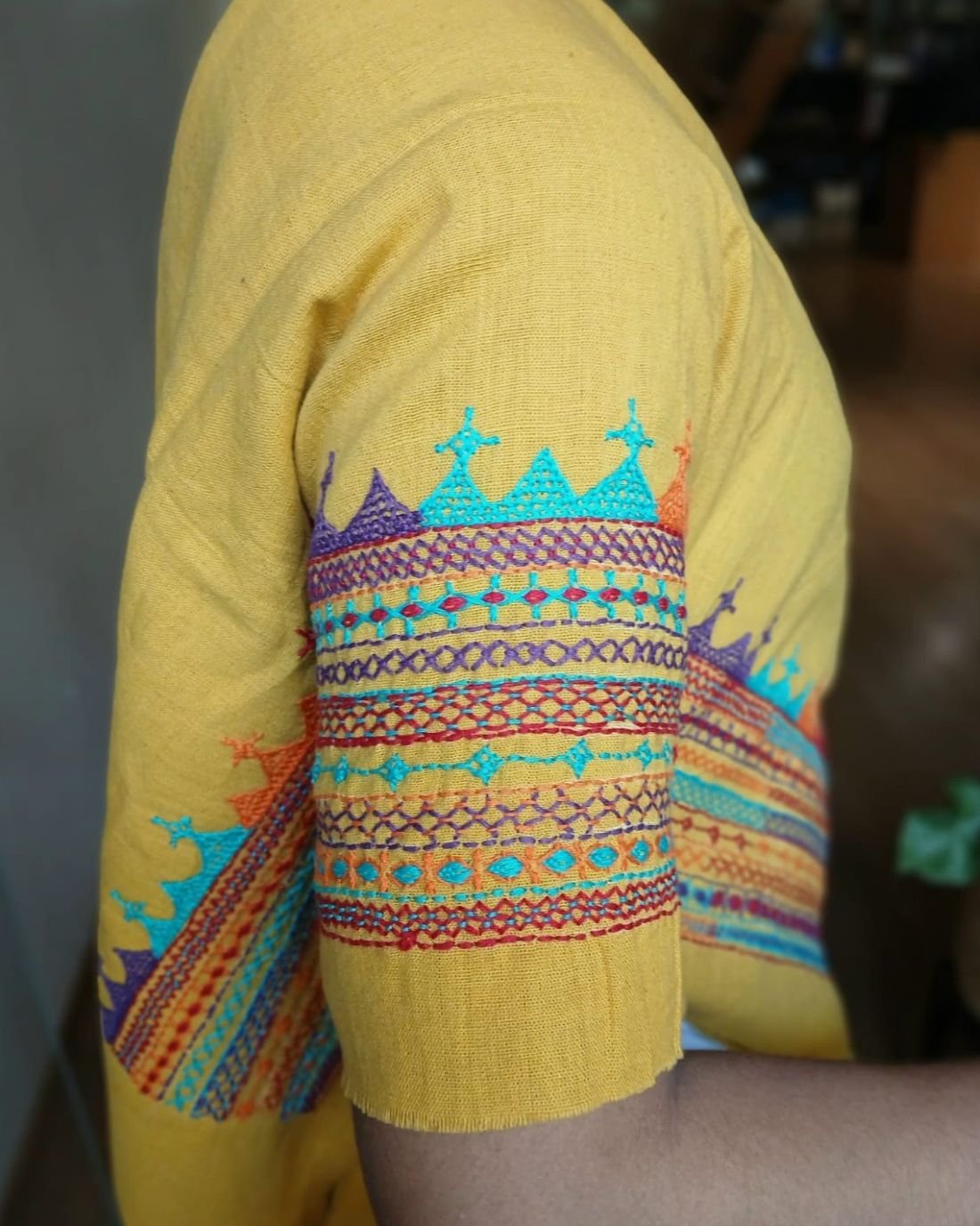 Hand-spun, hand-woven cotton blouse material with embroidery on sleeve and back.