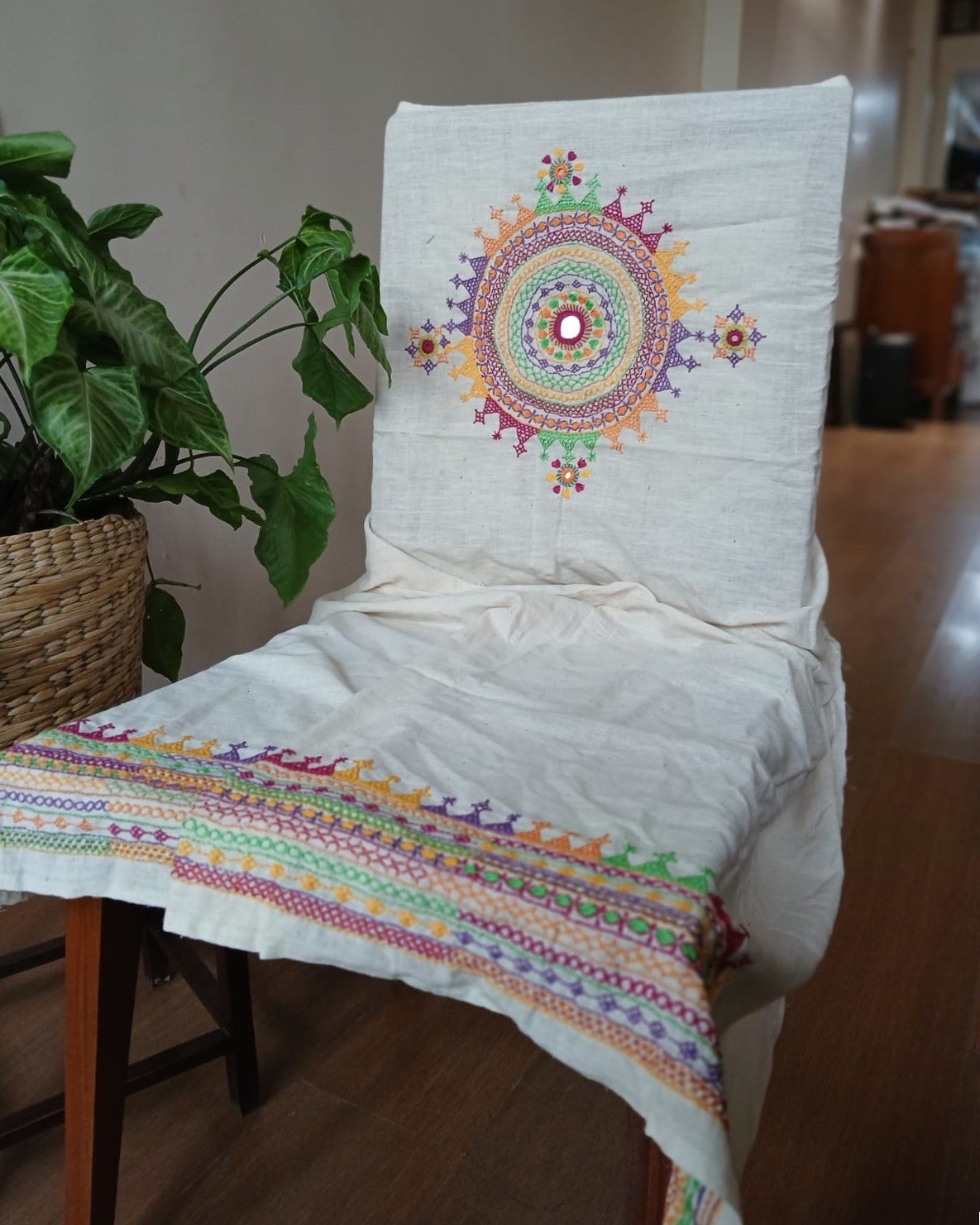 Hand-spun, hand-woven cotton blouse material with embroidery on sleeve and back.