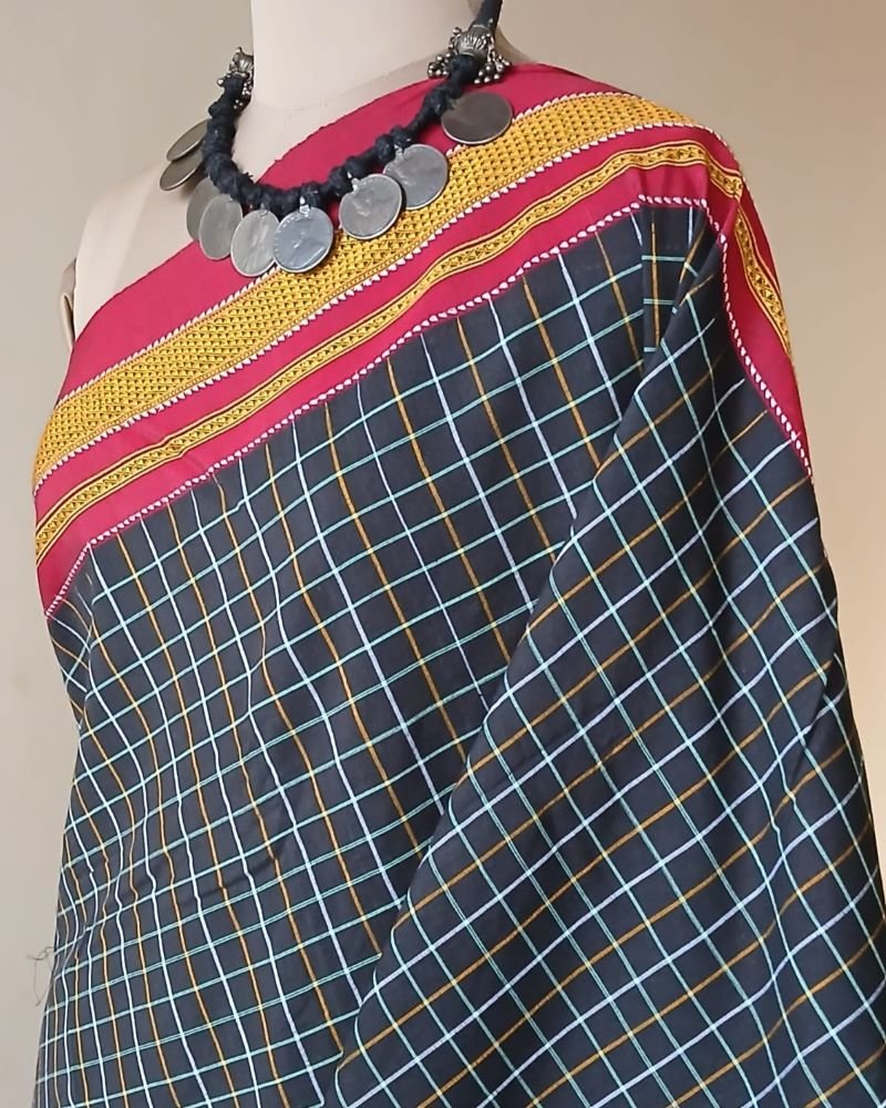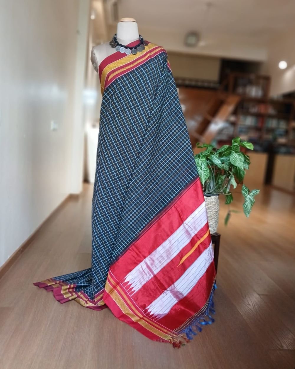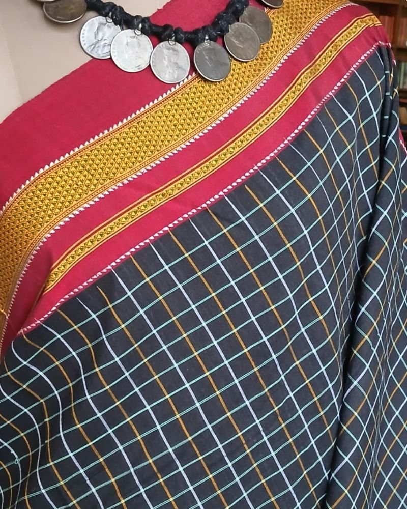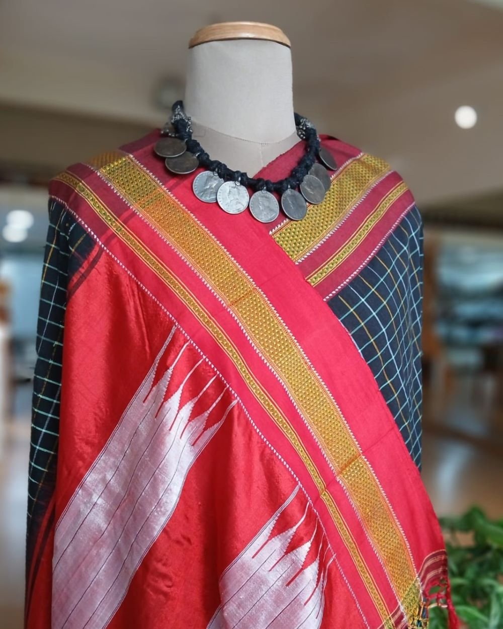 Handloom Ilkal saree, from the town of Ilkal in Karnataka. It has a minchulli chikki paras border and the typical red and silver striped palla of ilkal.
