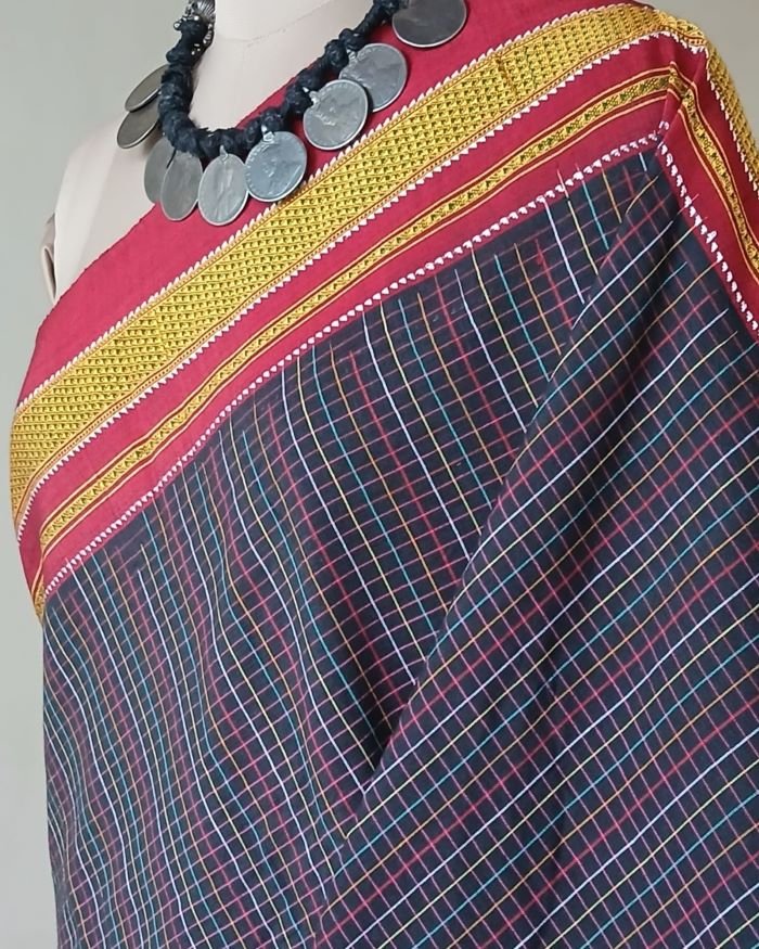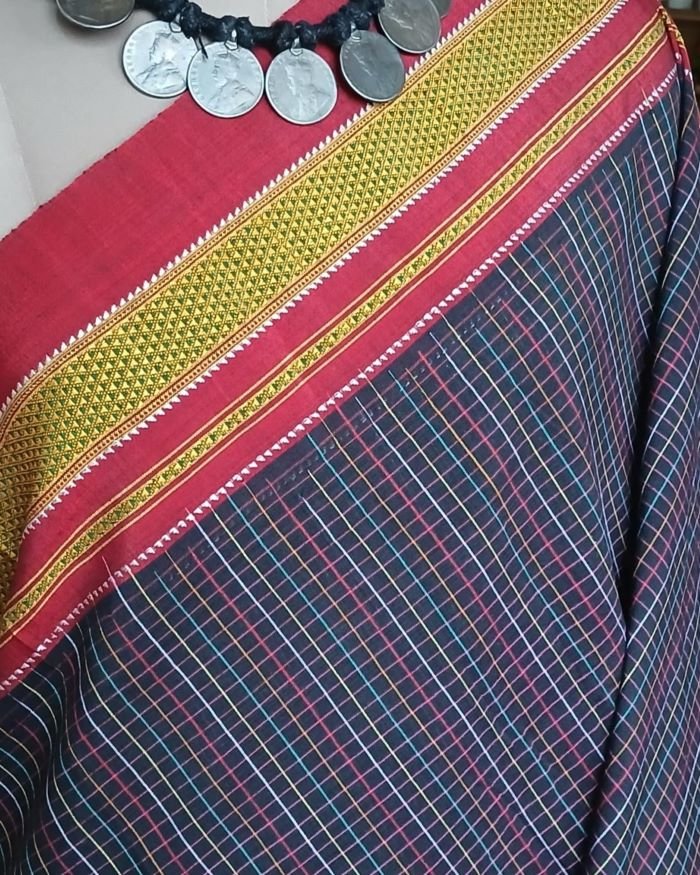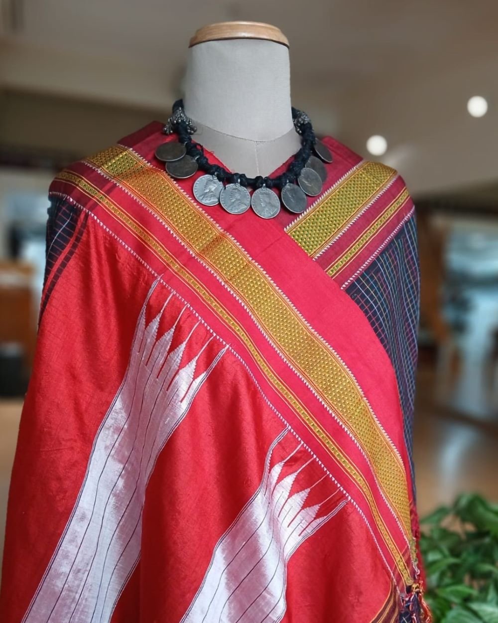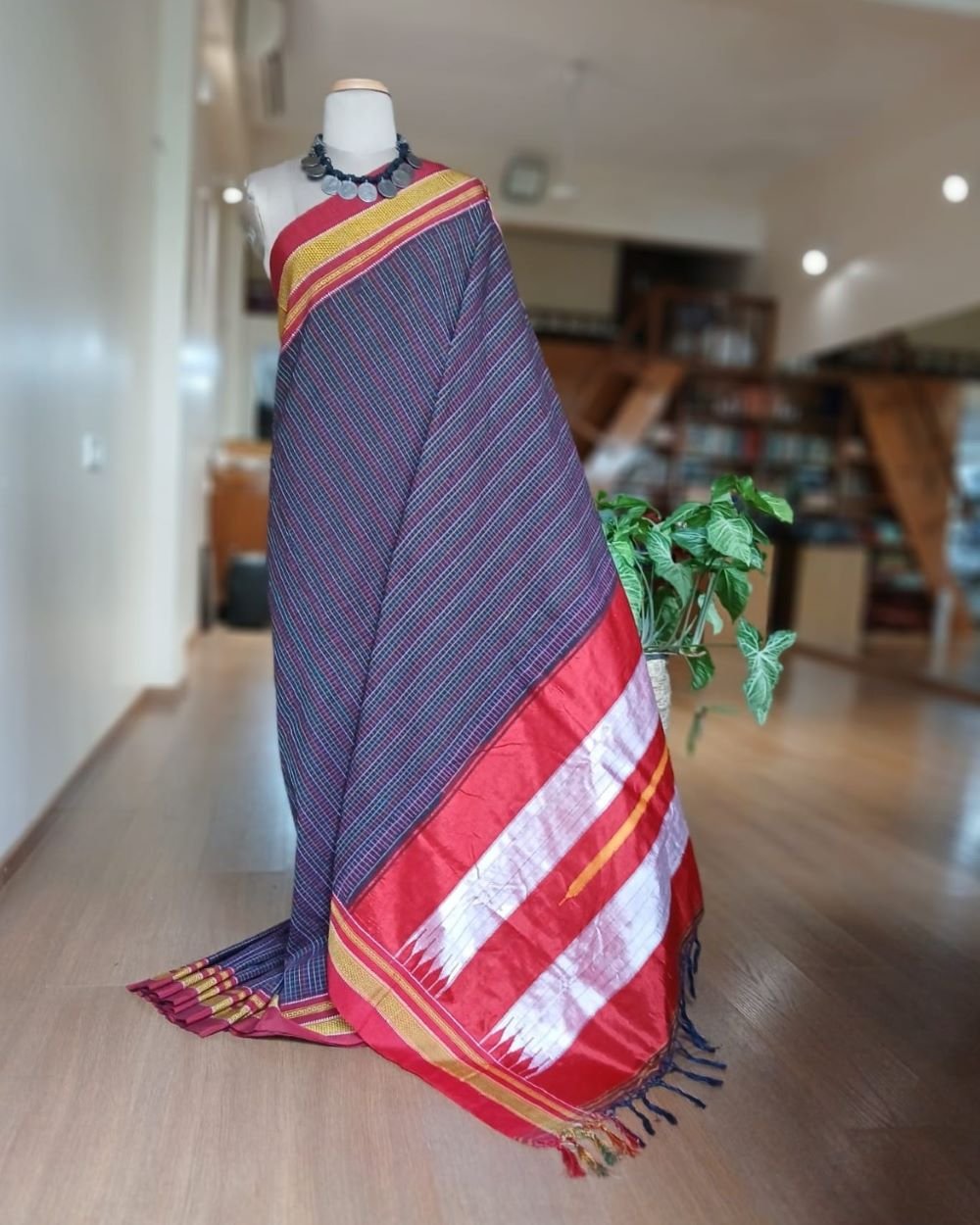 Handloom Ilkal saree, from the town of Ilkal in Karnataka. It has a minchulli chikki paras border and the typical red and silver striped palla of ilkal.
