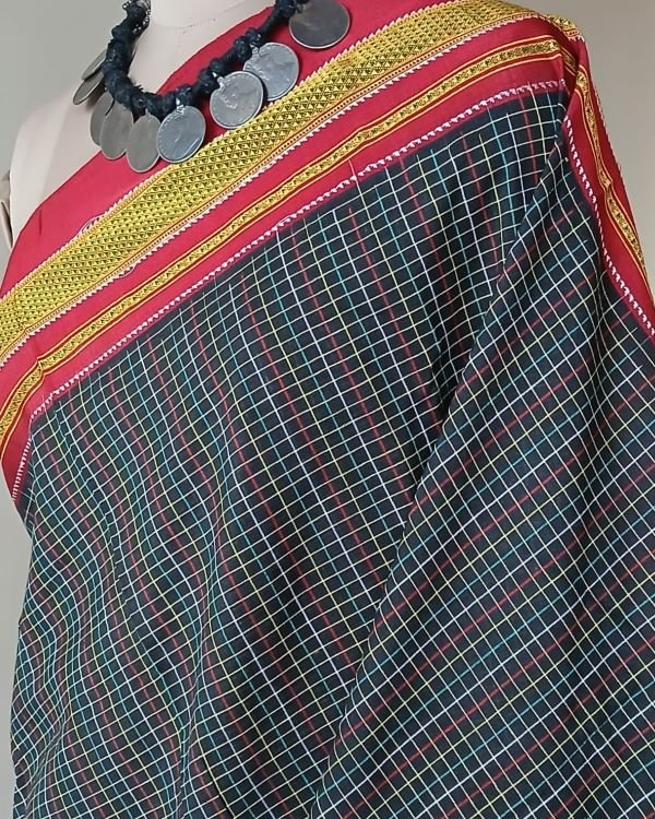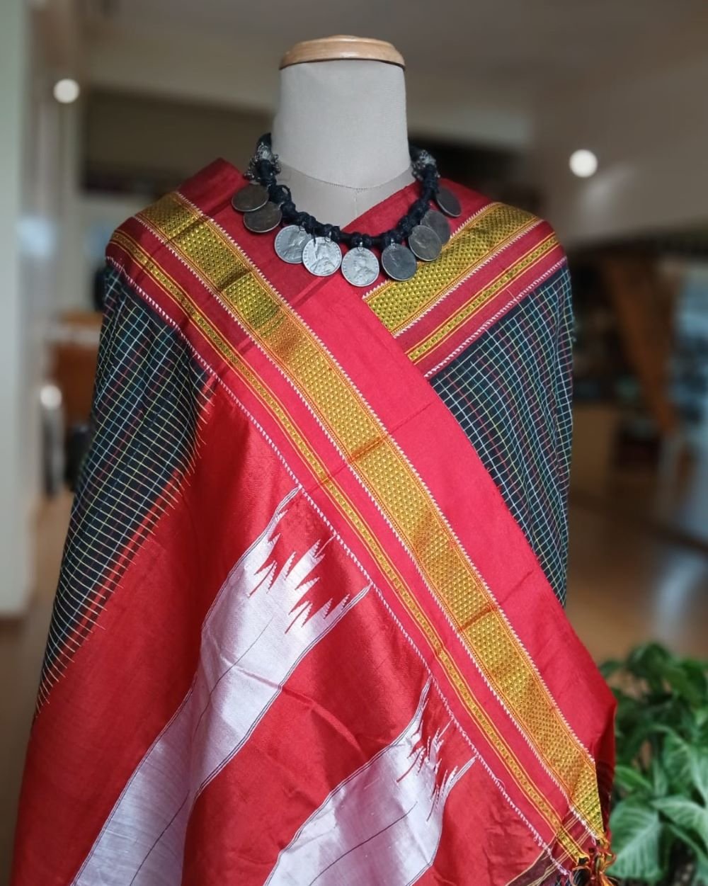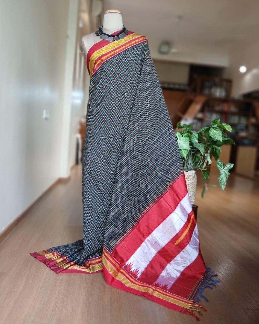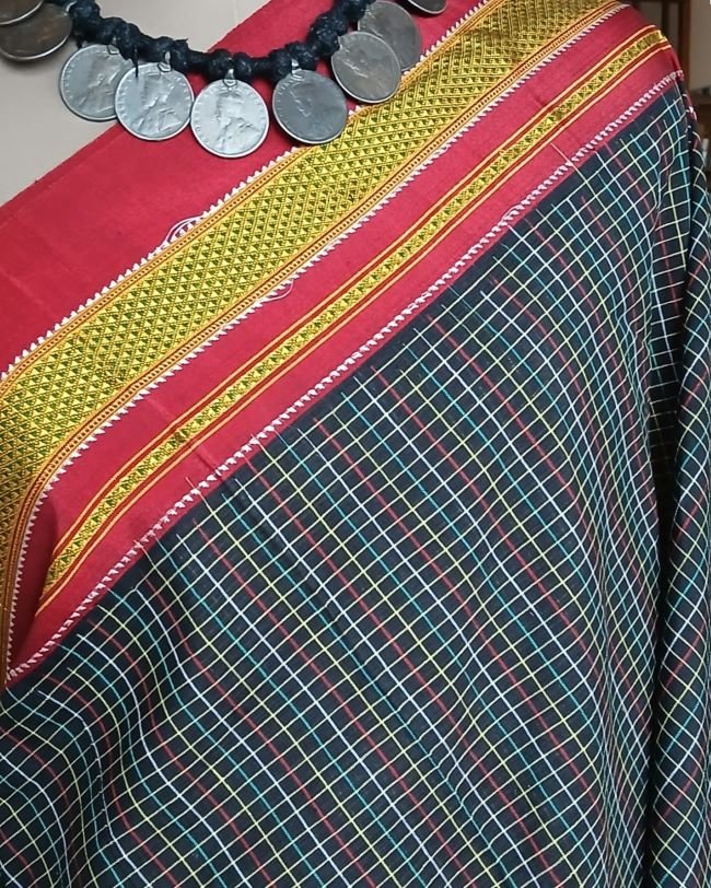 Handloom Ilkal saree, from the town of Ilkal in Karnataka. It has a minchulli chikki paras border and the typical red and silver striped palla of ilkal.