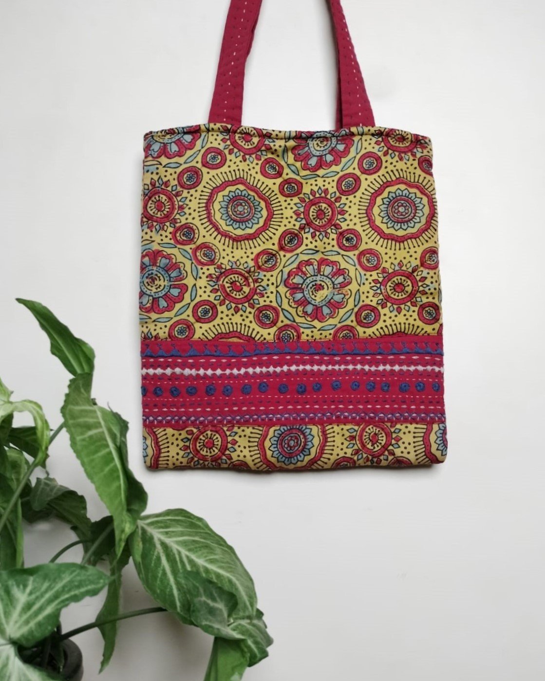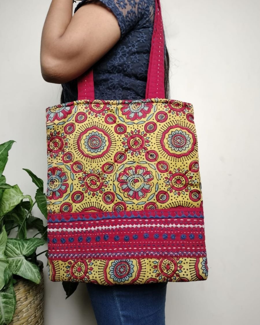 Modal Silk Tote Bag with natural dyes Ajrakh, and hand embroidered embellishment.
