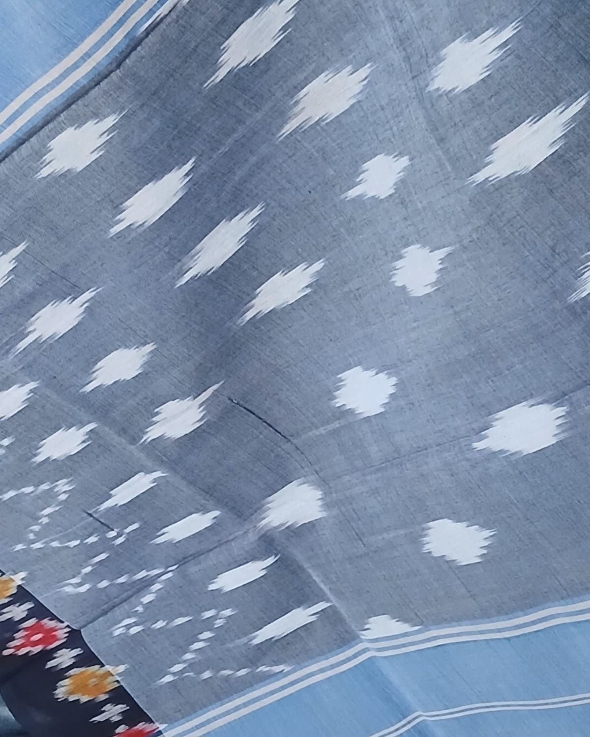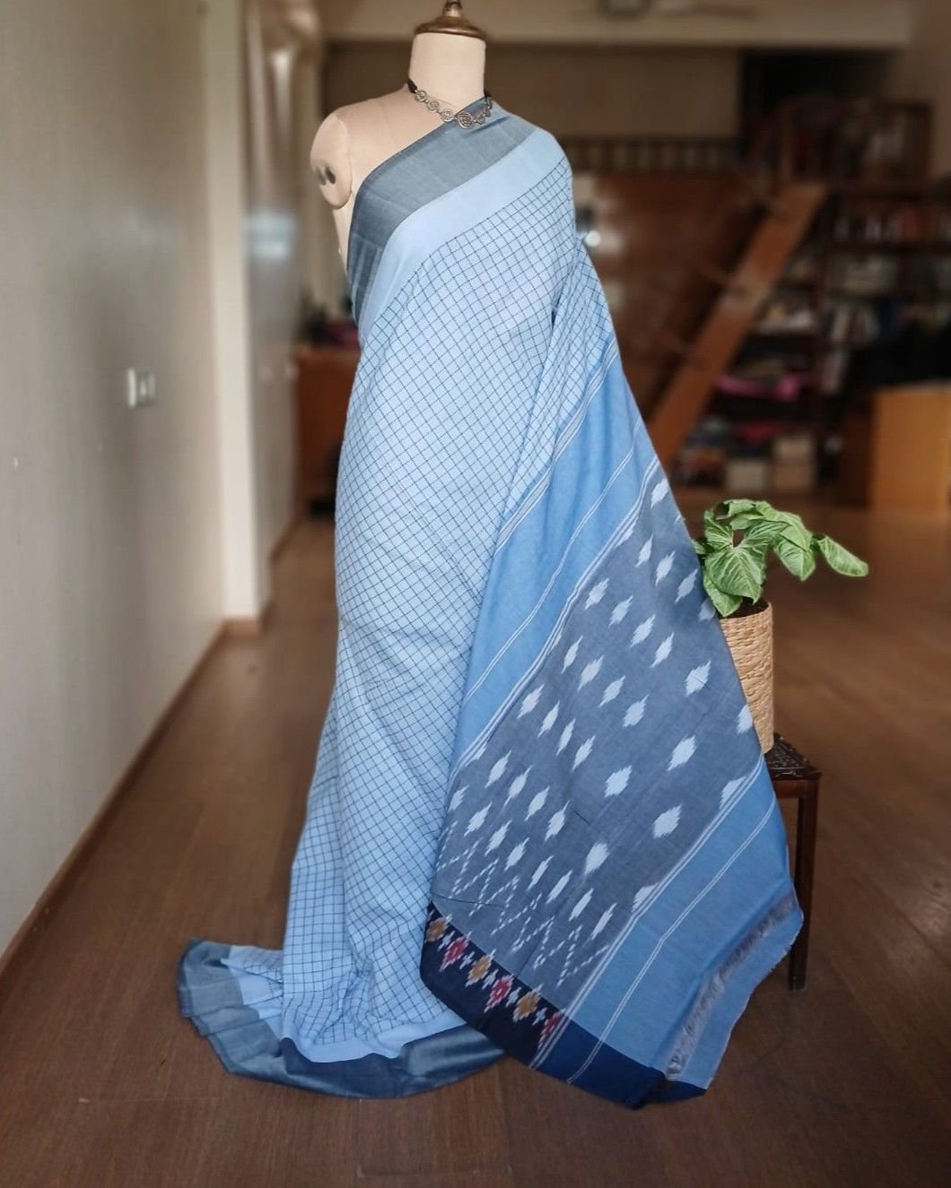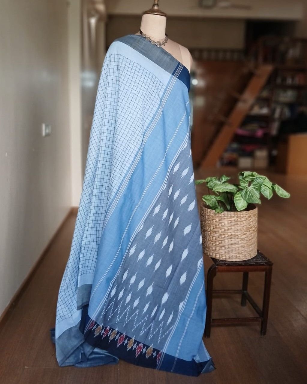 Combined with ikat tie-dye patterns in body, border and palla, it is an attractive pocket-friendly option for day wear.